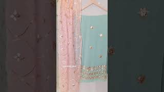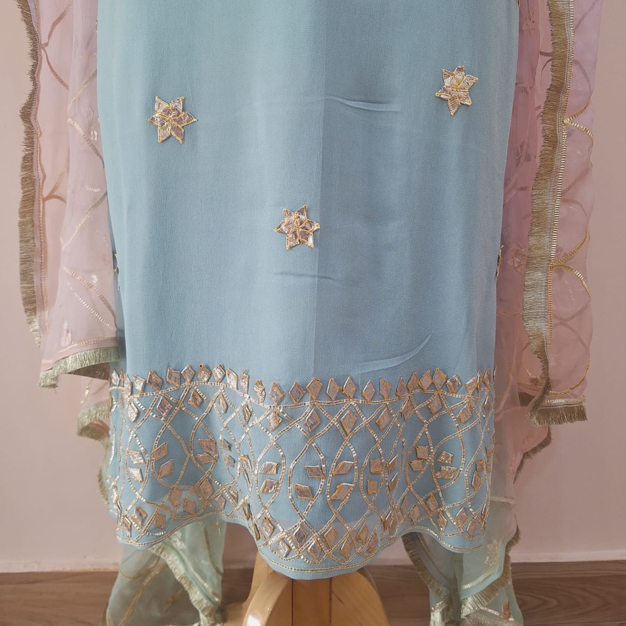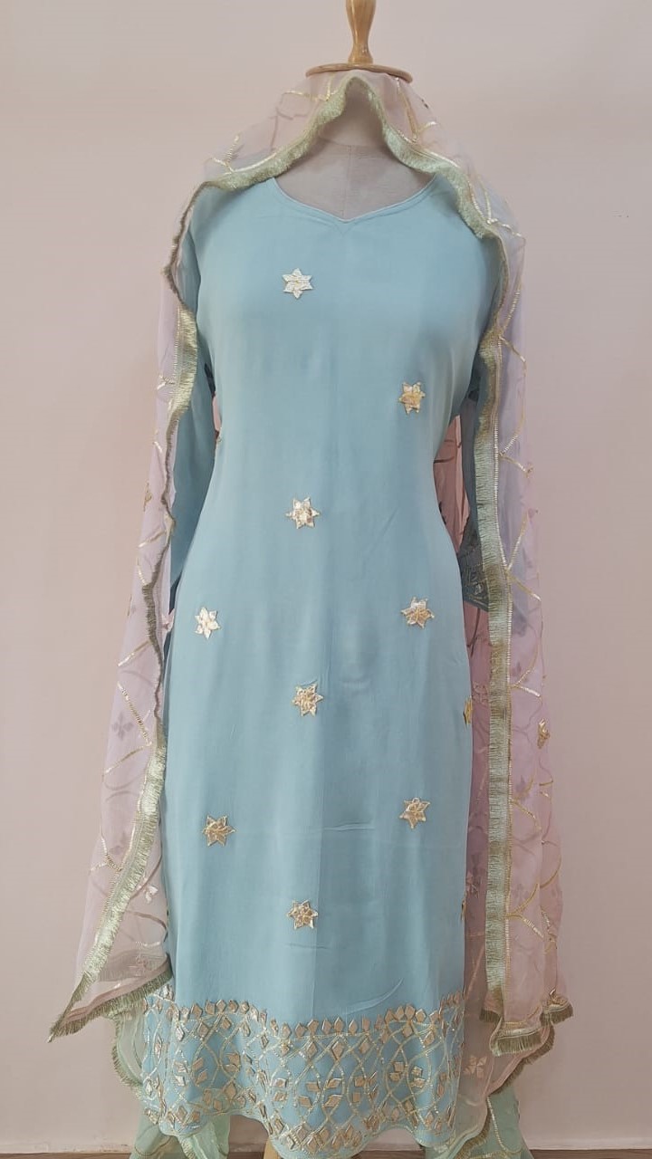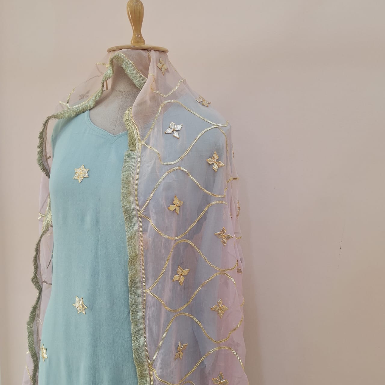 Step into effortless grace with this refreshing Aqua Blue Suit Set, beautifully embellished with traditional kachha gota handwork. The intricate detailing highlights the rich craftsmanship, while the soothing aqua tone adds an elegant charm. Paired with a comfortable pant and a soft pink–blue shaded chiffon dupatta, the ensemble creates a perfect fusion of subtlety and festive flair.