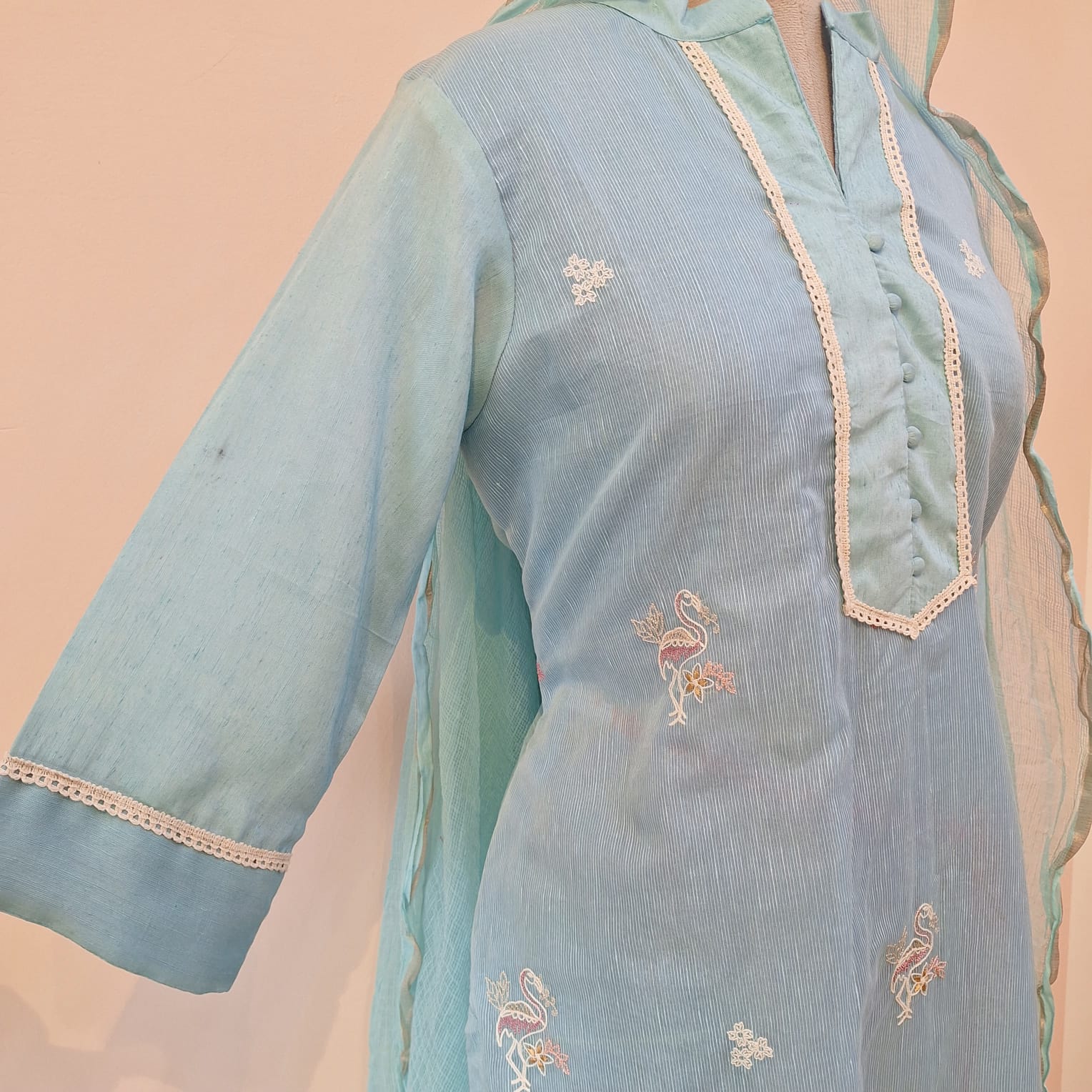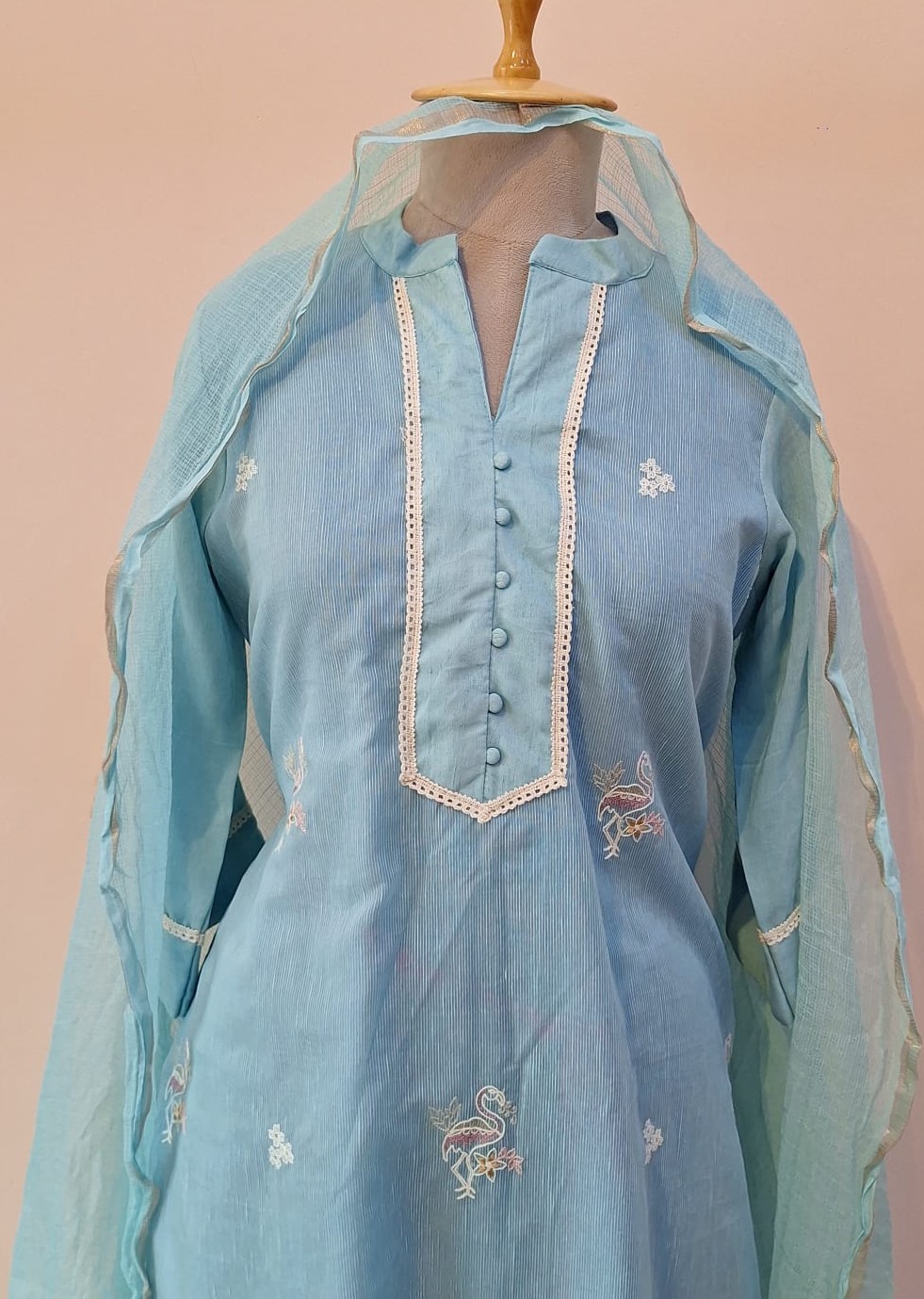 Elegant Aqua Blue Printed Doriya suit adorned with delicate printed detailing for a rich festive look. Paired with perfectly tailored matching pants for a sleek and graceful silhouette. Lightweight Cotton dupatta adds a soft, flowy charm with its beautifully coordinated print. Ideal for festive occasions, family functions and stylish evening wear.