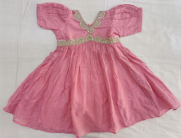None of the listings above exactly match “baby pink base + Chanderi fabric + golden booties motif (in the fabric itself) + gota frock set for kids”. But they are close in one or more attributes (colour, fabric, embellishment, set format). If you want, I can attempt a live search for the exact combination and locate one with current stock.