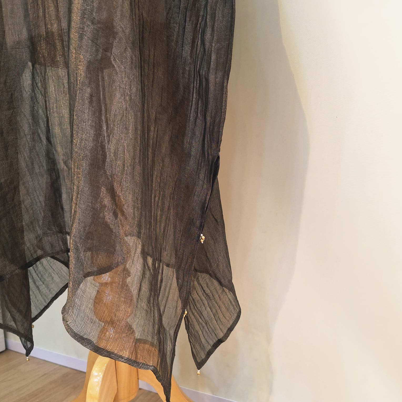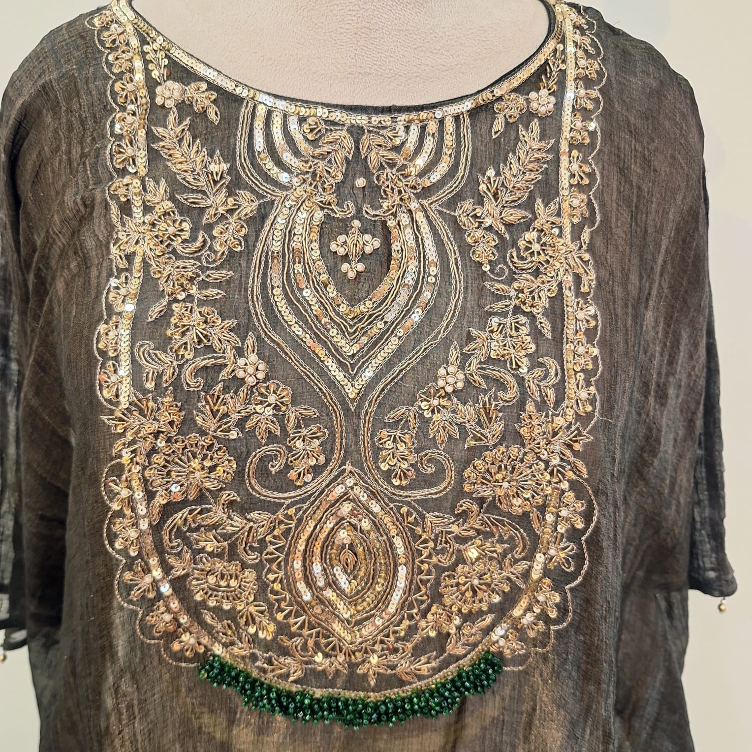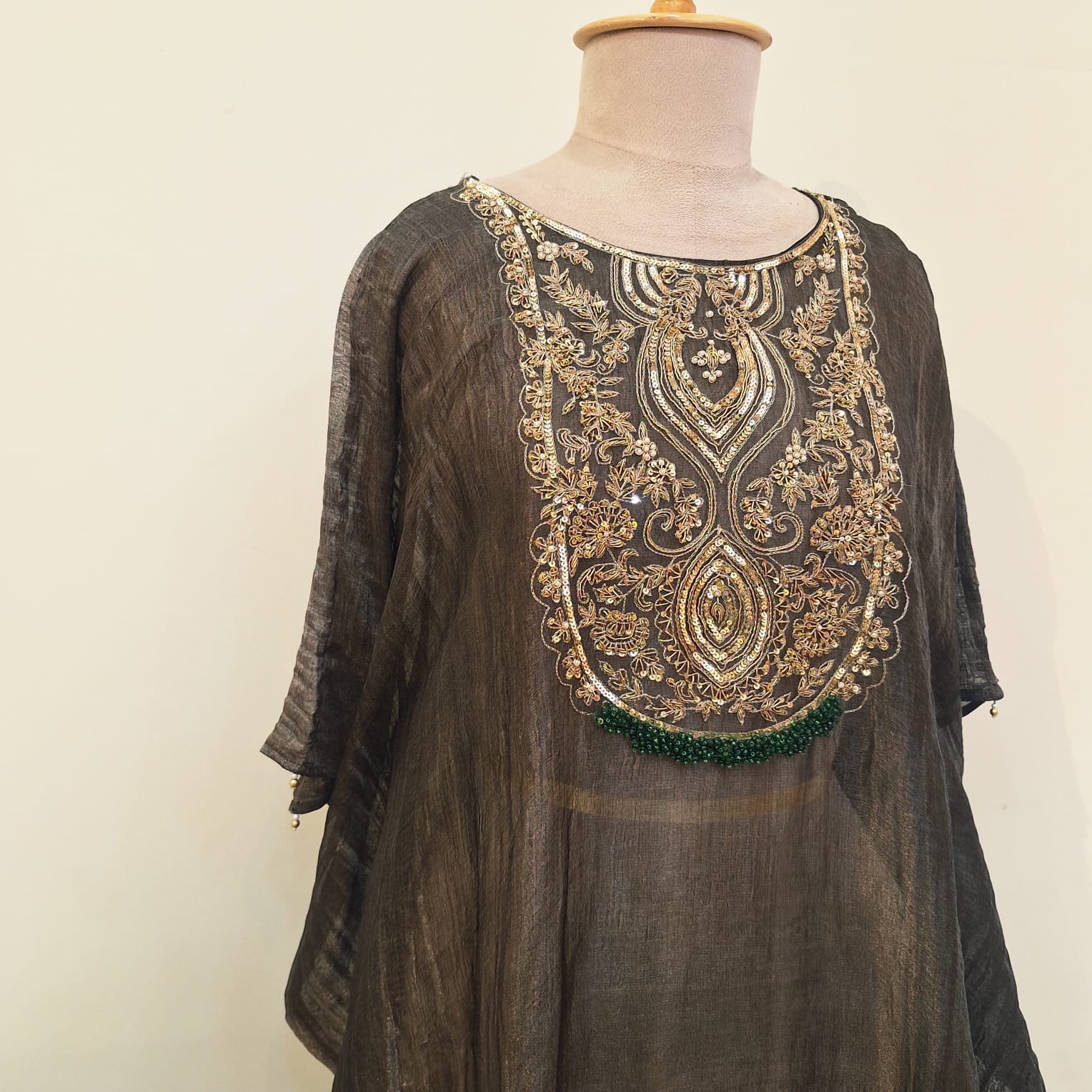 Elevate your festive wardrobe with this stunning Black Handwork Kaftan Set, designed to make a bold yet graceful statement. Crafted in a flowy silhouette, the kaftan features intricate handwork detailing that adds a touch of artisanal elegance and refined charm. The rich black hue enhances the beauty of the craftsmanship, making it perfect for evening gatherings and special occasions.