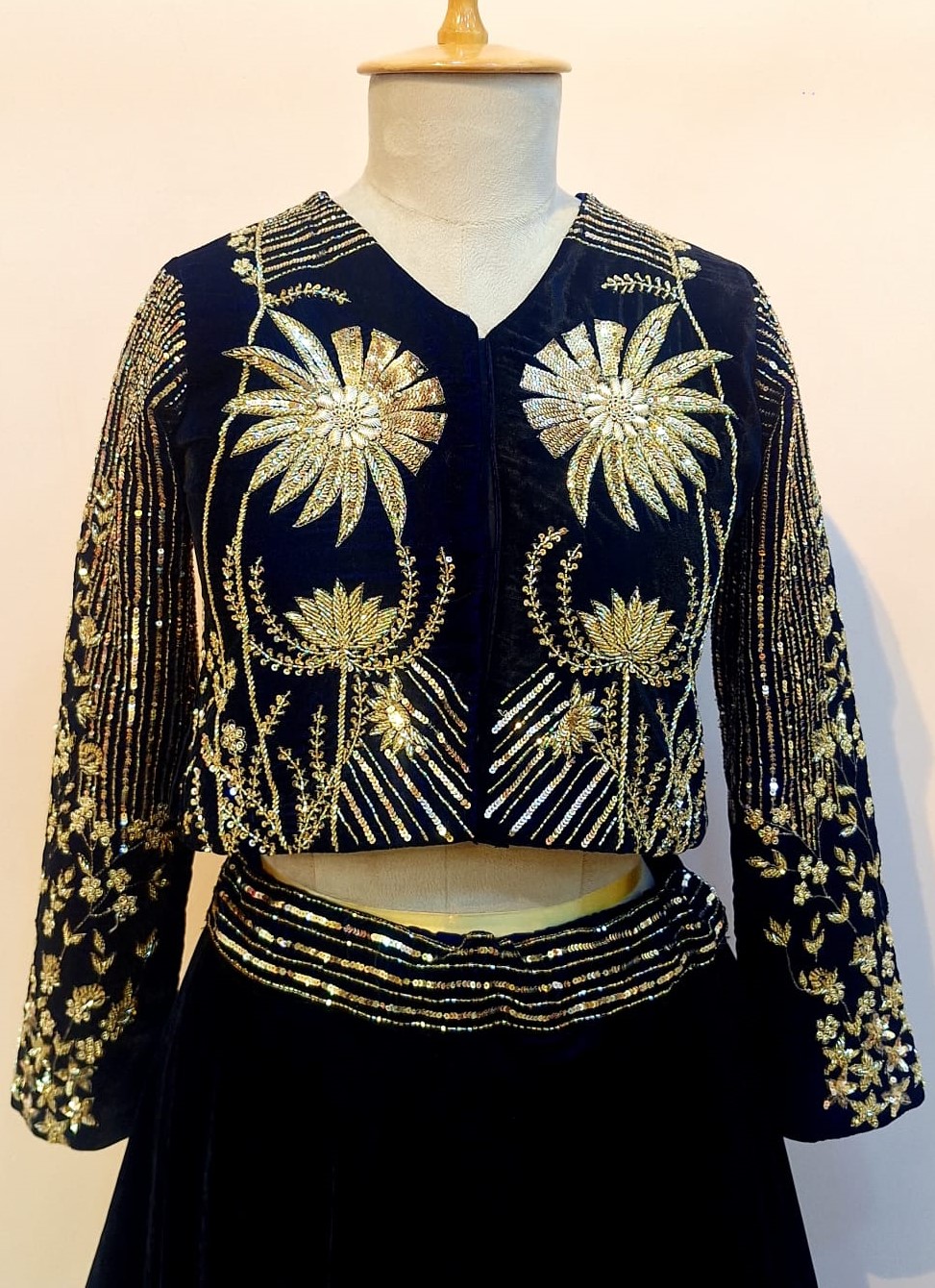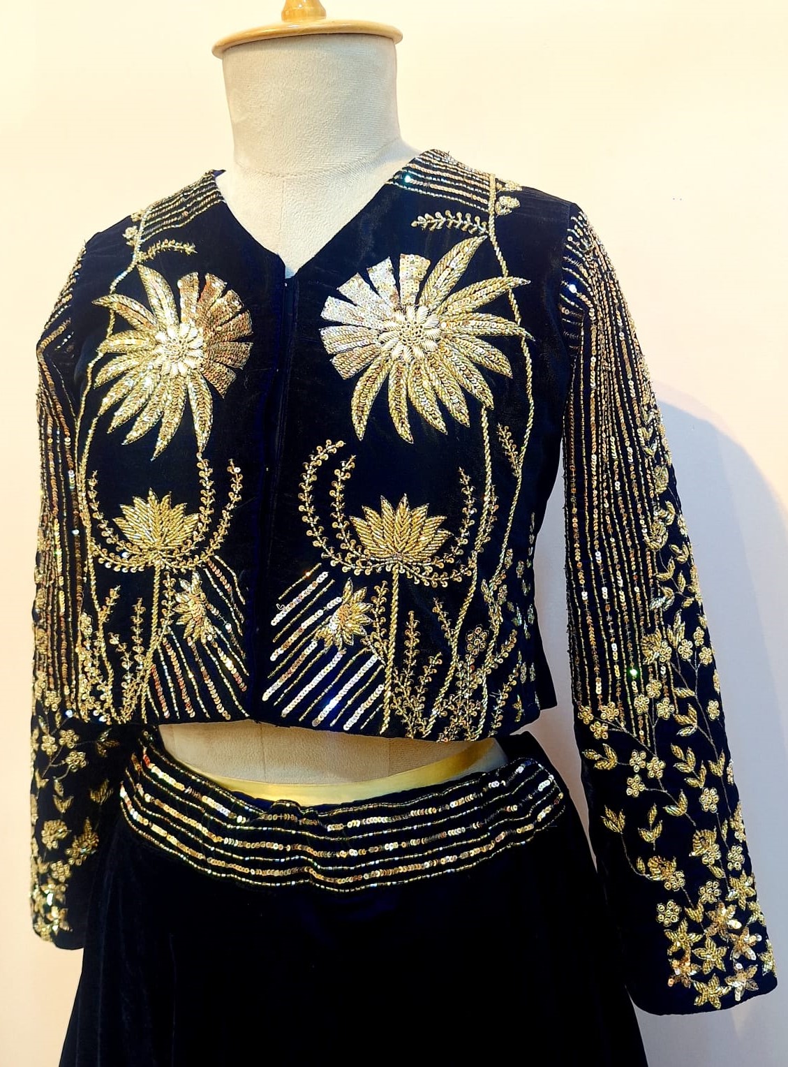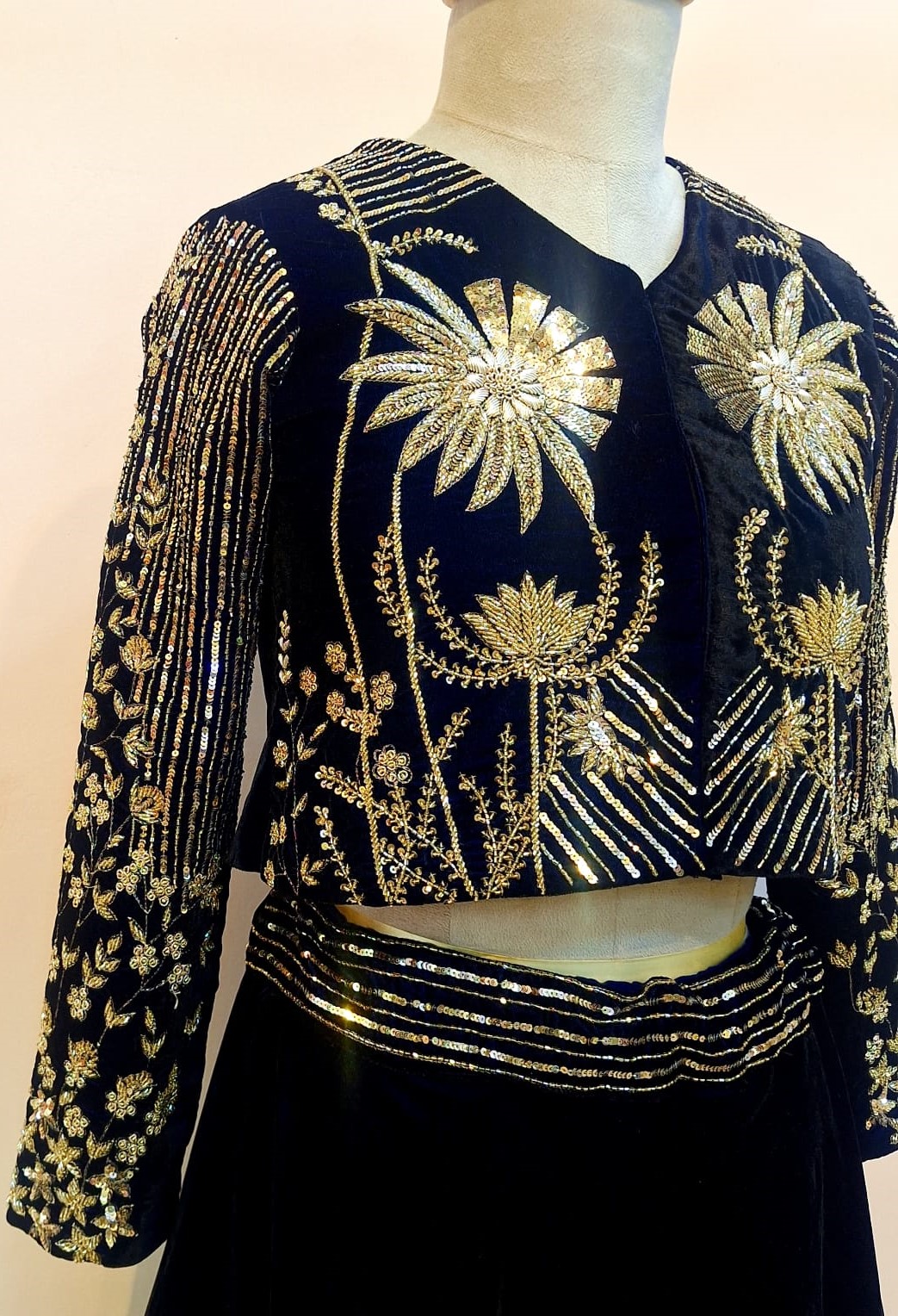 The Black Velvet Handwork Top and Skirt Set is a luxurious and elegant ensemble crafted from rich, soft velvet that offers a regal and sophisticated appeal. The deep black color enhances the beauty of the fabric while highlighting the intricate handwork done by skilled artisans, featuring fine embroidery, Cutdana and Sequins delicate detailing. The top is designed to provide a flattering fit with a graceful neckline and well-finished sleeves, adding charm and structure to the look. Paired with a beautifully flared or A-line skirt, the set ensures effortless movement and a polished silhouette, complete with a comfortable lining and secure closure. Perfect for festive celebrations, weddings, receptions, and evening parties, this velvet handwork set makes a timeless statement of elegance and craftsmanship.