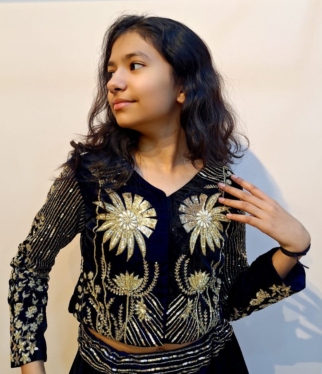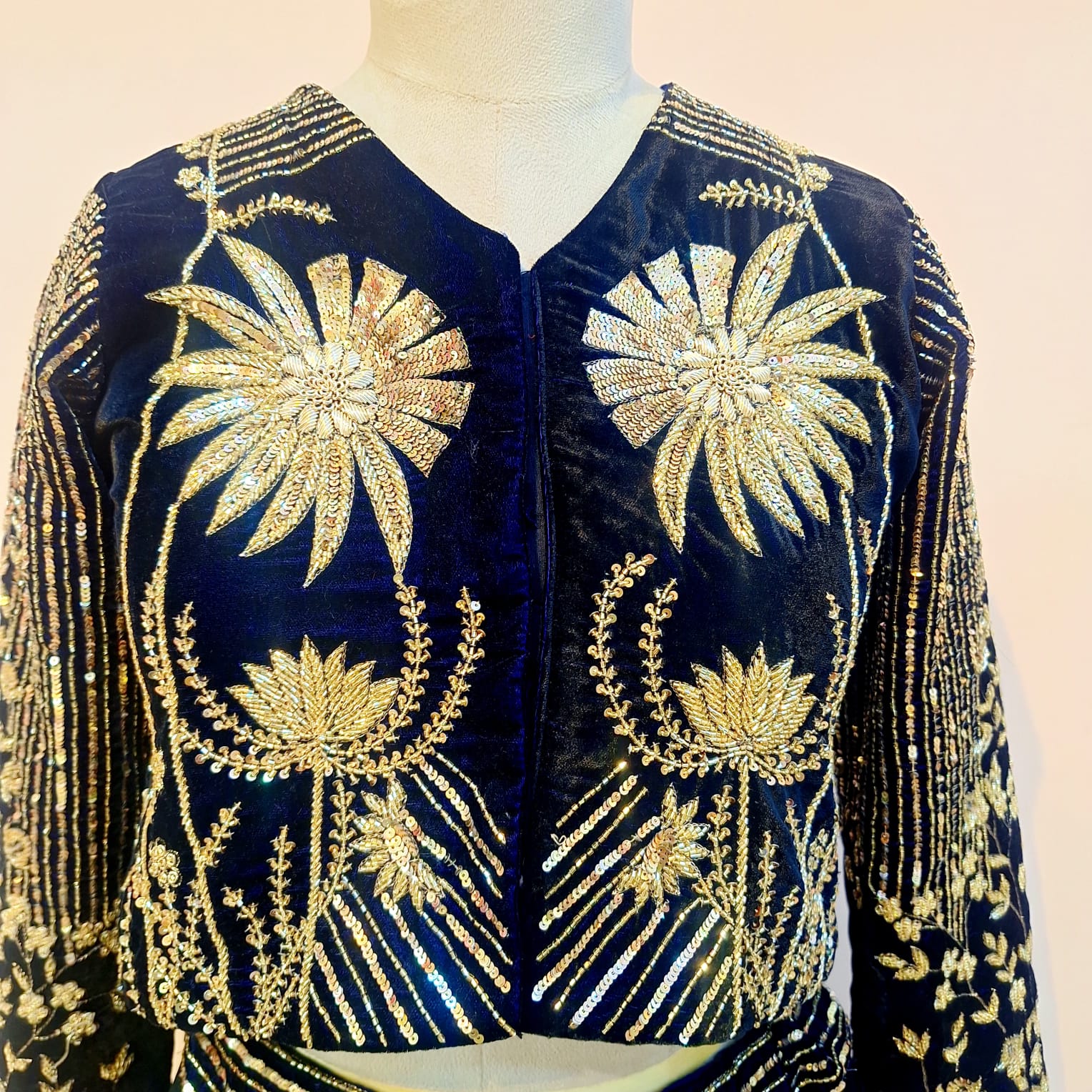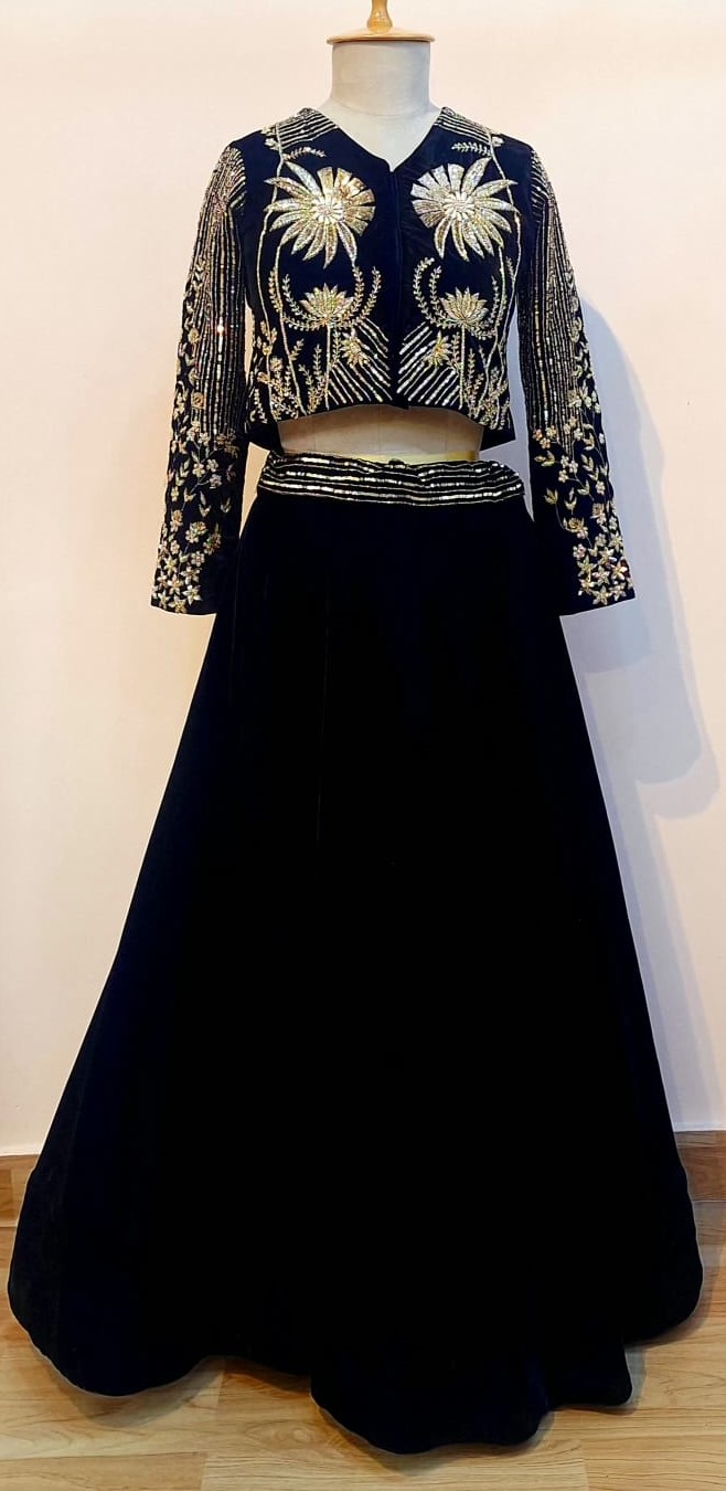 The Black Velvet Handwork Top and Skirt Set is a luxurious and elegant ensemble crafted from rich, soft velvet that offers a regal and sophisticated appeal. The deep black color enhances the beauty of the fabric while highlighting the intricate handwork done by skilled artisans, featuring fine embroidery, Cutdana and Sequins delicate detailing. The top is designed to provide a flattering fit with a graceful neckline and well-finished sleeves, adding charm and structure to the look. Paired with a beautifully flared or A-line skirt, the set ensures effortless movement and a polished silhouette, complete with a comfortable lining and secure closure. Perfect for festive celebrations, weddings, receptions, and evening parties, this velvet handwork set makes a timeless statement of elegance and craftsmanship.