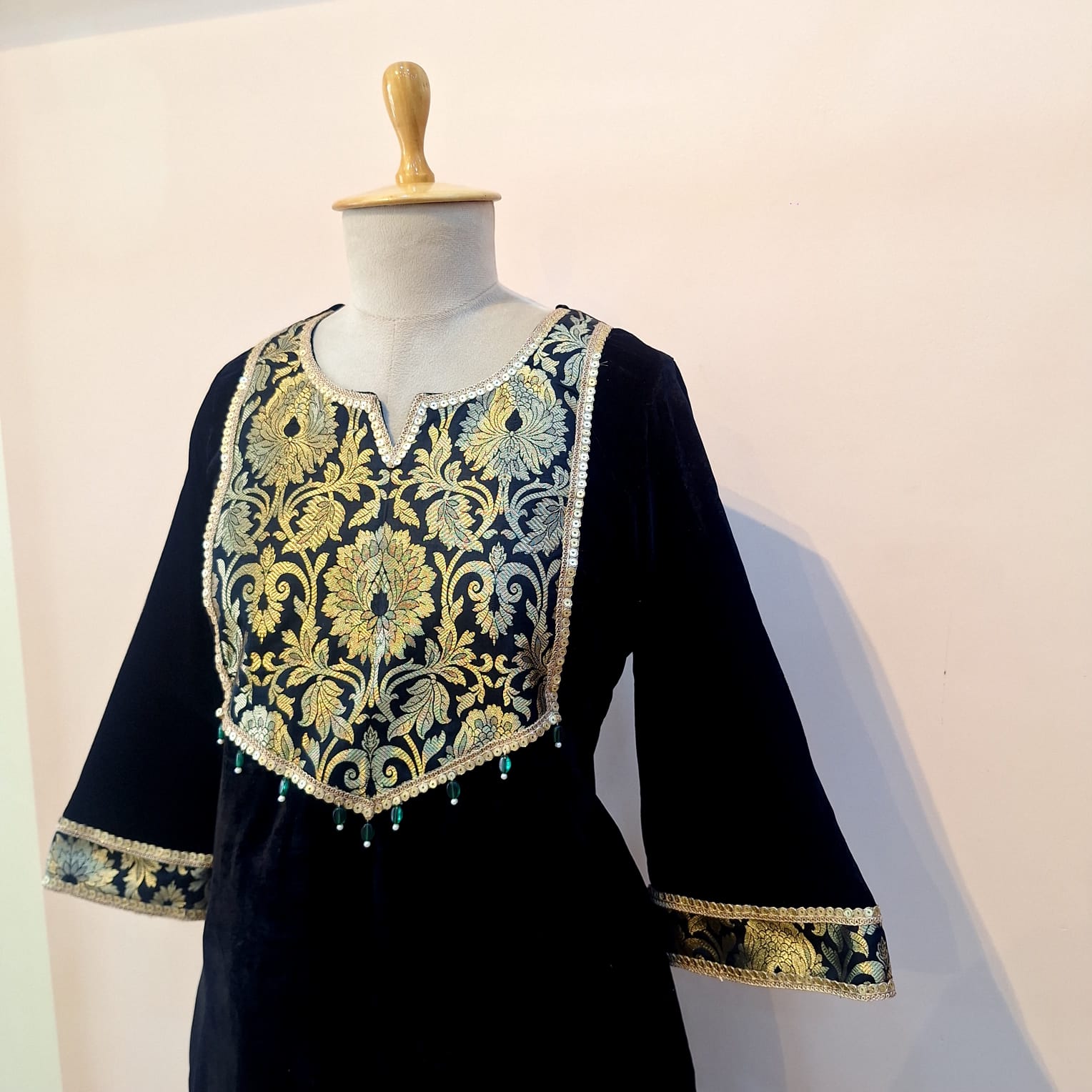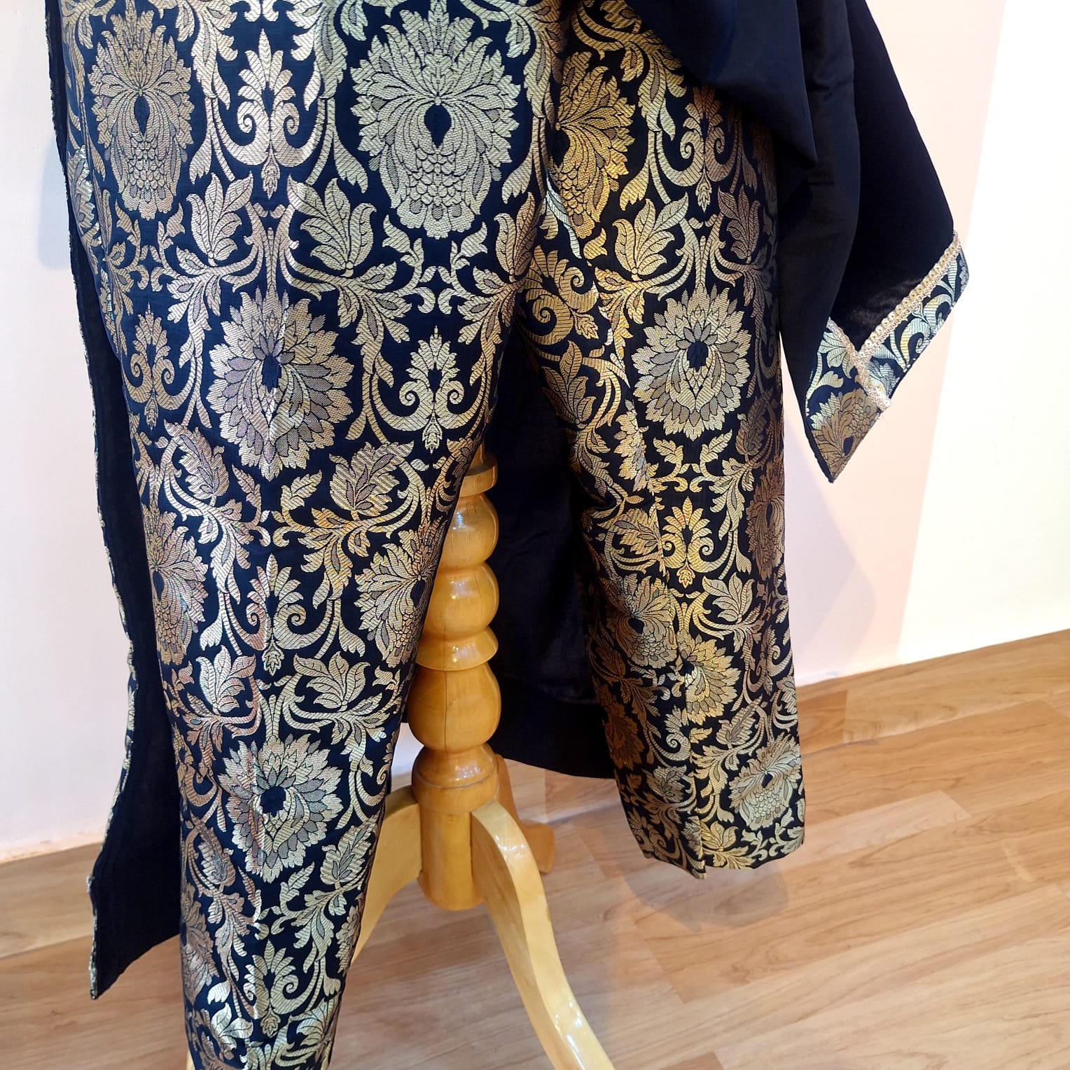 Black Velvet with Banarasi Touch Kaftan Style Set is a statement ensemble that blends regal elegance with contemporary comfort. Crafted in rich black velvet, the kaftan-style silhouette drapes beautifully, offering a relaxed yet luxurious fit. Accented with exquisite Banarasi-inspired detailing, the set reflects traditional charm with a modern twist. Perfect for festive evenings, celebrations, or special occasions, this outfit exudes sophistication, richness, and timeless appeal.