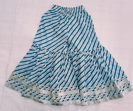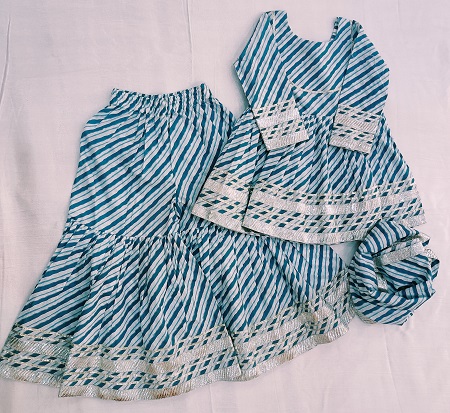 Dress your little princess in timeless elegance with this blue cotton leheriya peplum sharara set. Crafted in soft and breathable cotton, the peplum top showcases traditional leheriya patterns, paired with a stylish flared sharara for a festive yet comfortable look. The outfit is beautifully accented with lappa and gota detailing on the sleeves, yoke, and both peplum and sharara panels, adding a rich ethnic charm. Completed with a matching dupatta, this set is perfect for weddings, cultural celebrations, festive occasions, and family functions — a blend of comfort, tradition, and adorable style.