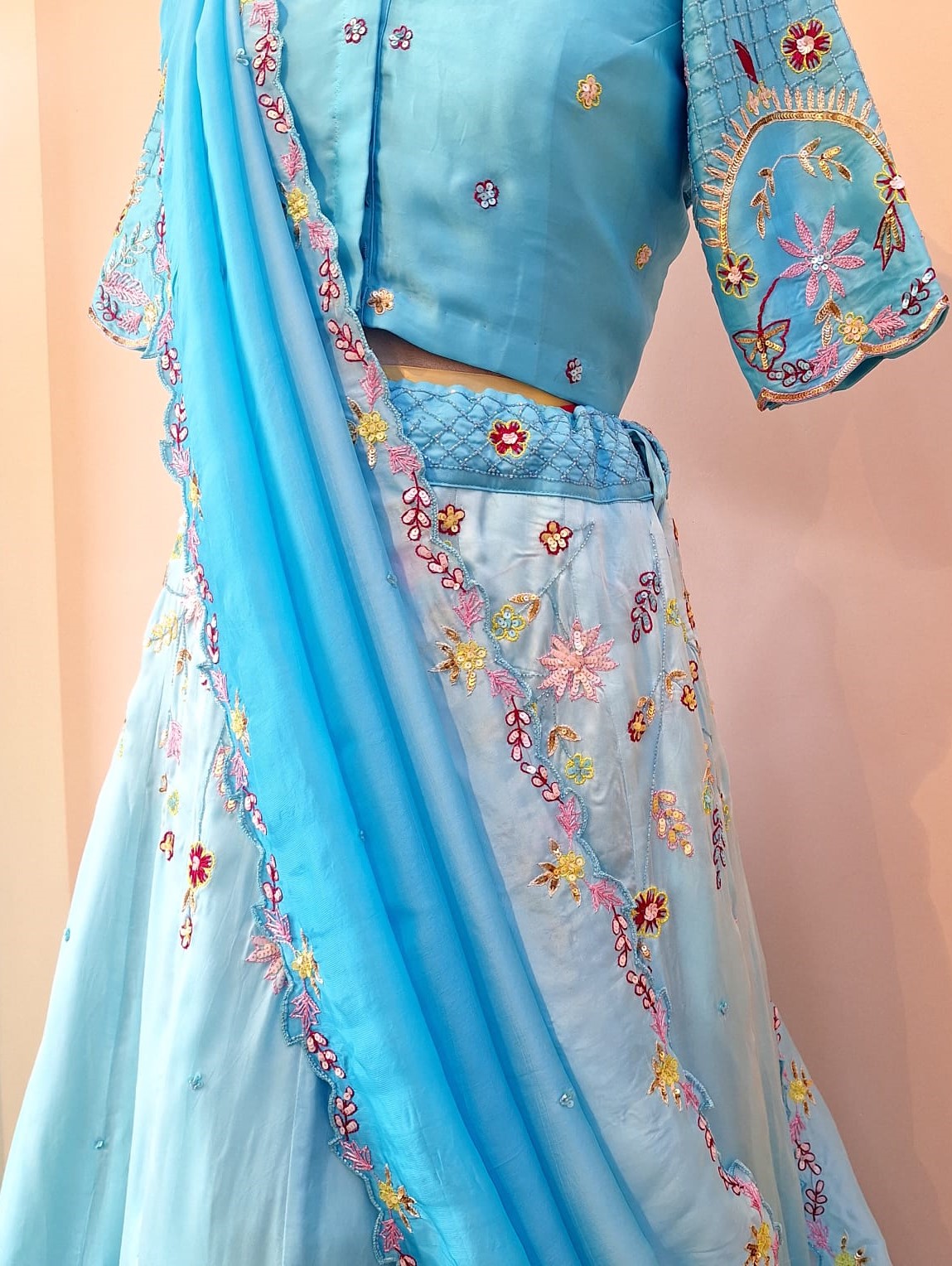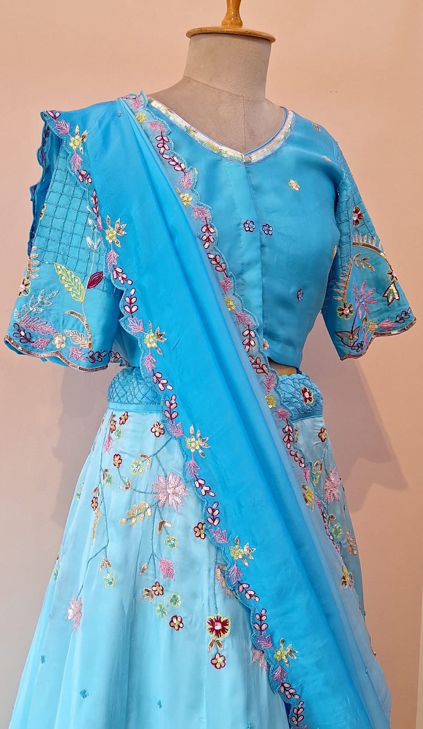 A luxurious lehenga set crafted in rich Satin fabric, adorned with intricate Cutdana, Sequins, and Thread work. The matching blouse enhances the look with detailed hand embellishments for a premium festive finish. Paired with a lightweight Organza dupatta featuring delicate borders and elegant handcrafted highlights. Perfect for weddings, receptions, and grand celebrations with its modern yet traditional charm.