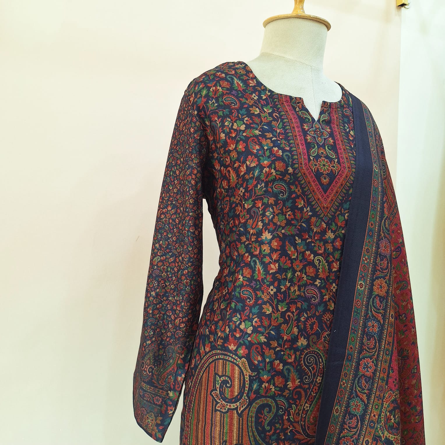Stay warm and stylish in this Blue Printed Kashmiri Woollen Suit Set. Made from soft woollen fabric, it features an elegant Kashmiri-inspired print that adds a touch of traditional grace. The set includes a printed kurta, matching bottoms, and a coordinated dupatta — perfect for winter festivities or everyday ethnic wear. A blend of comfort, charm, and cultural beauty.