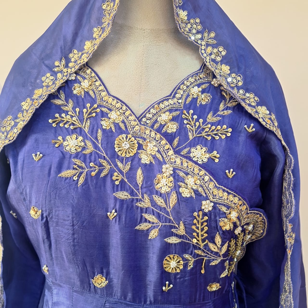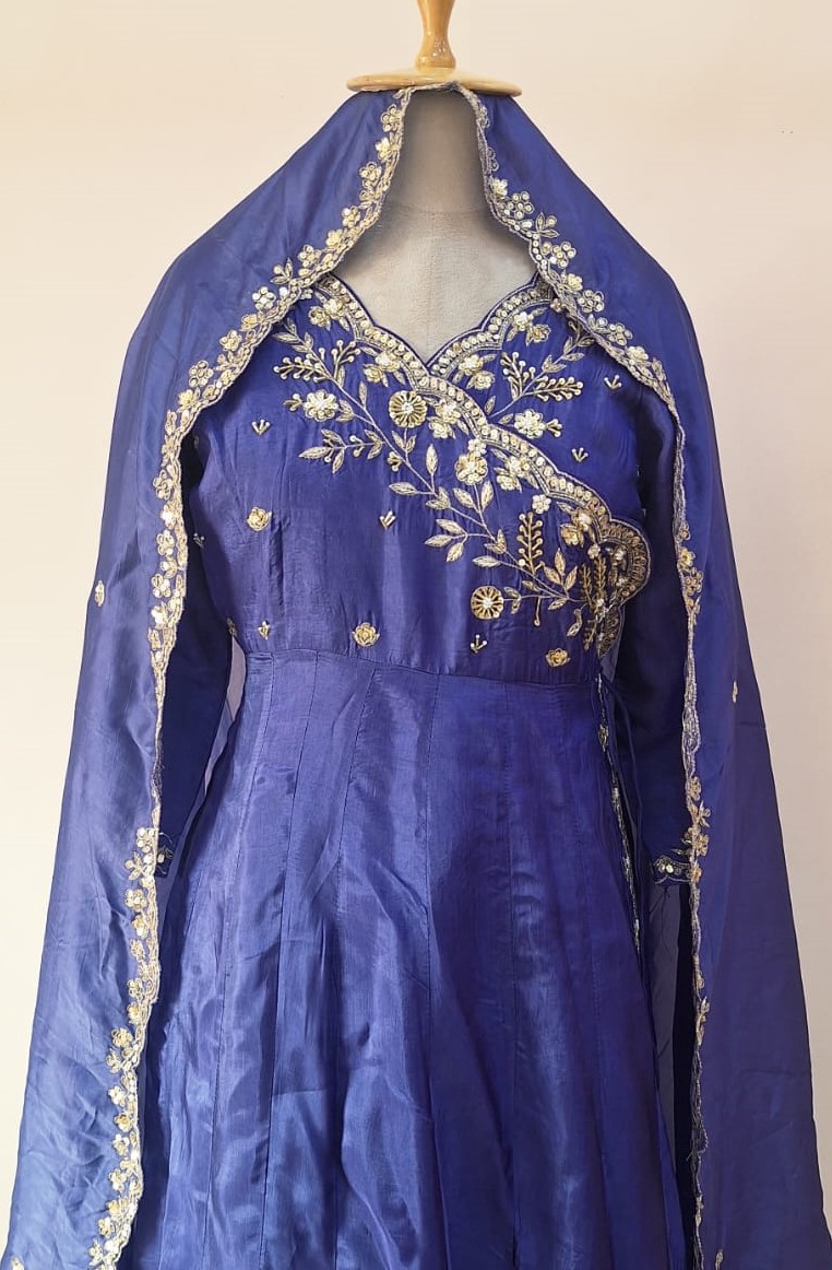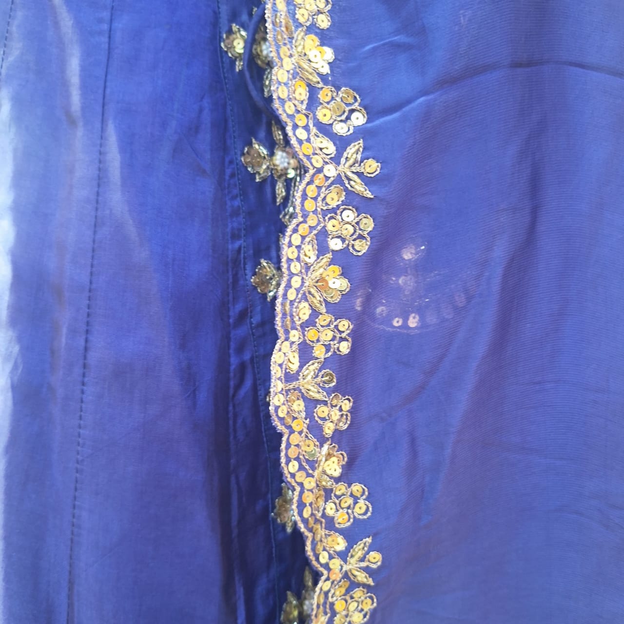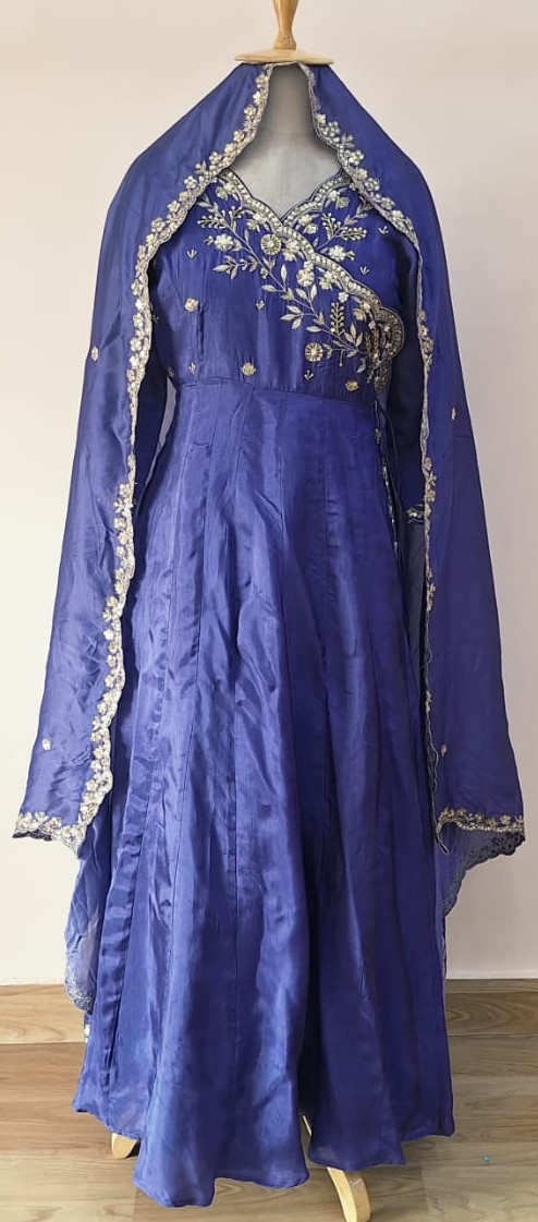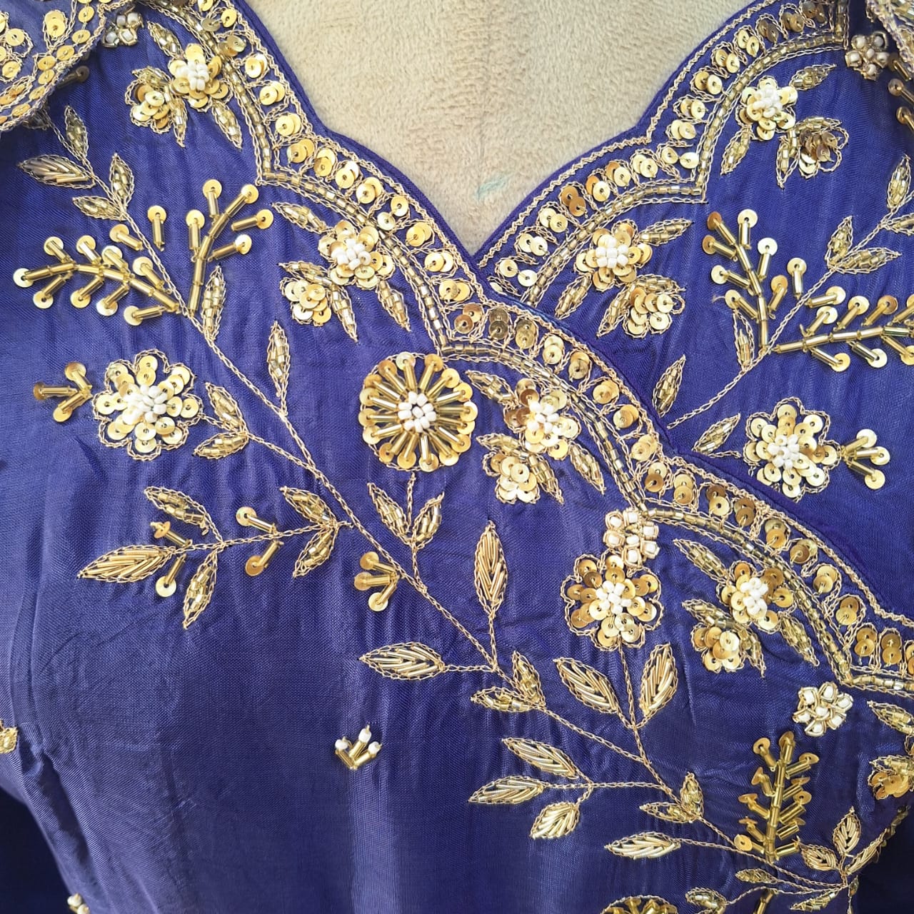 Exude effortless elegance in this blue Angrakha pant set, crafted from luxurious summer silk that offers a soft, breathable feel with a graceful drape. The Angrakha-style kurta showcases a classic wrap silhouette, beautifully enhanced with intricate handwork of Cutdana, Sequins and Pearl that adds a touch of artisanal sophistication. Paired with tailored pants and a matching dupatta in coordinated summer silk, this ensemble blends comfort with refined style. Ideal for festive mornings, intimate celebrations, and elegant daytime occasions, this set is a timeless addition to a modern ethnic wardrobe.