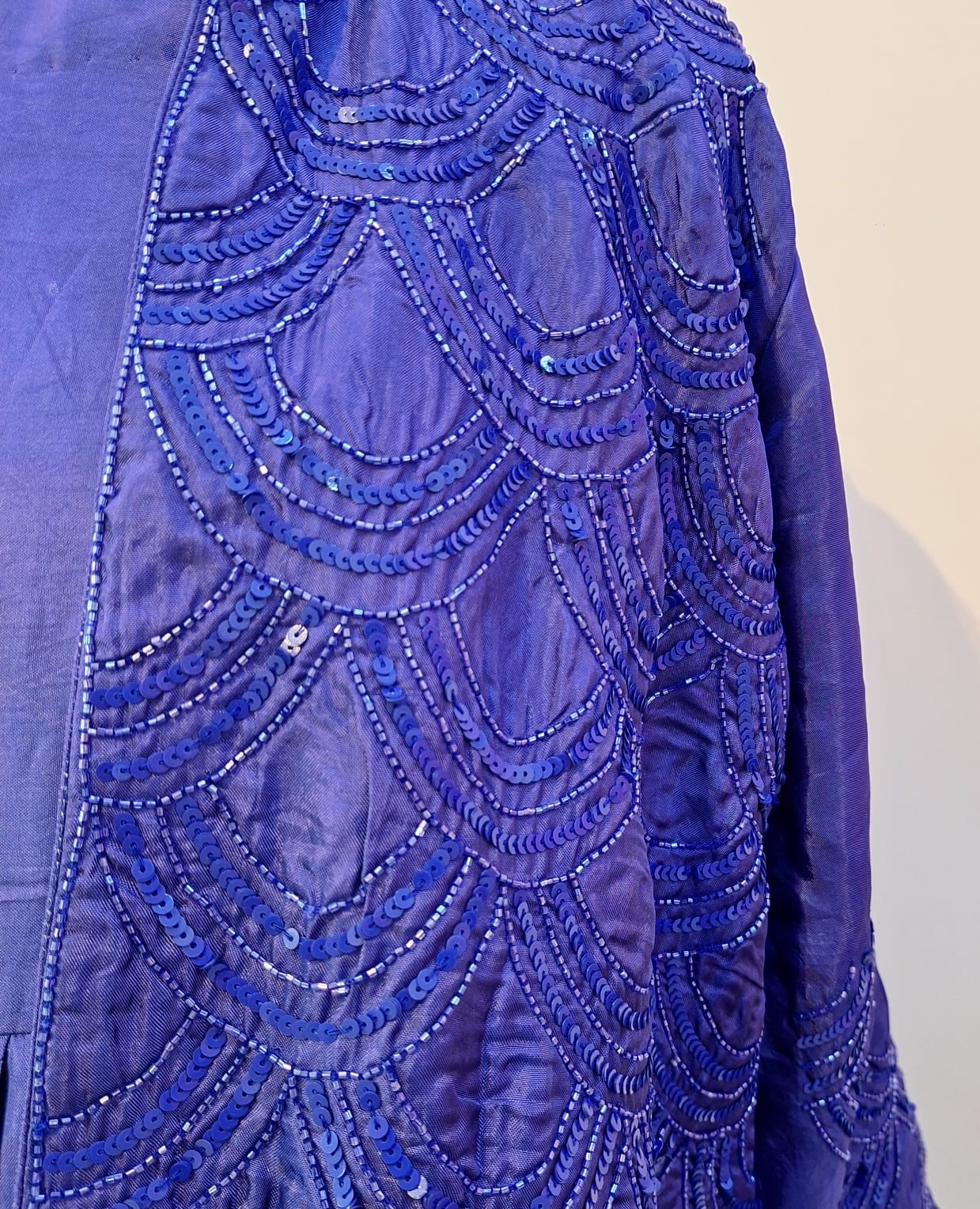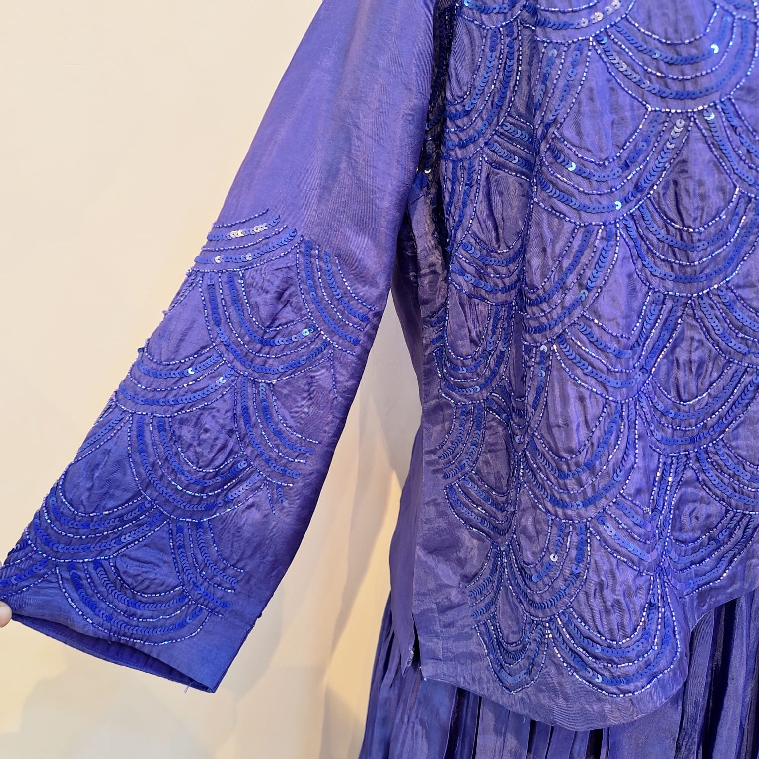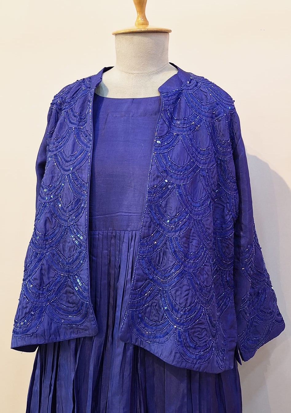 This exquisite blueish purple one piece and jacket set is crafted in luxurious Summer Silk fabric, offering a soft, lightweight feel with a graceful natural sheen. The one-piece is adorned with delicate handwork using cutdana and sequins, adding refined sparkle and texture without overpowering the silhouette. Paired with a matching jacket featuring coordinated Cutdana and Sequins embellishments, the ensemble creates a beautifully structured, layered look. Perfect for festive occasions and elegant evening events, this set blends breathable comfort with artisanal luxury and modern sophistication.
