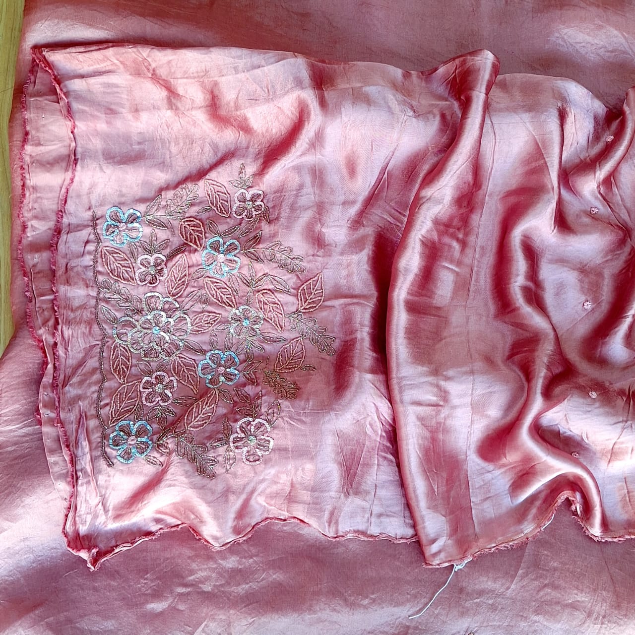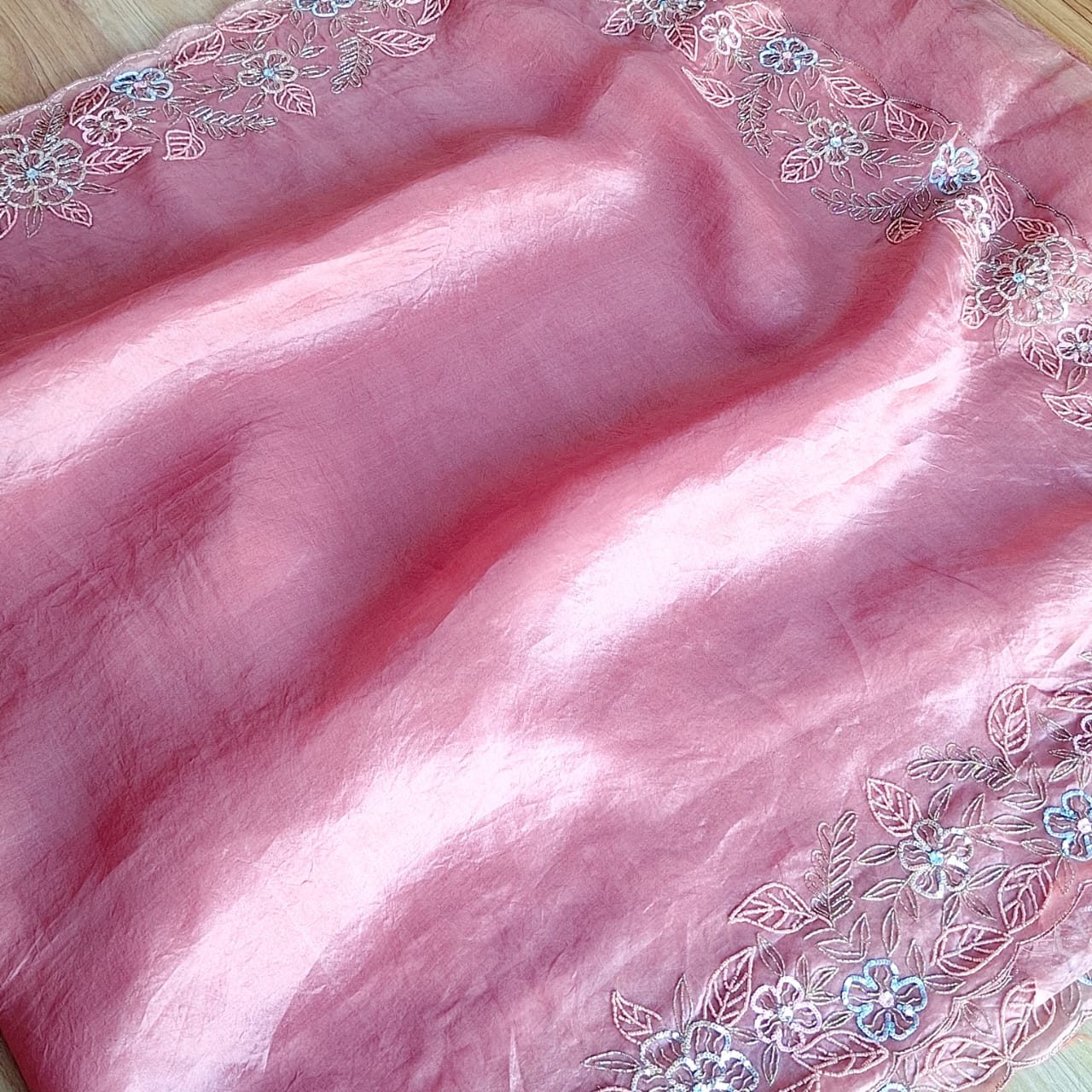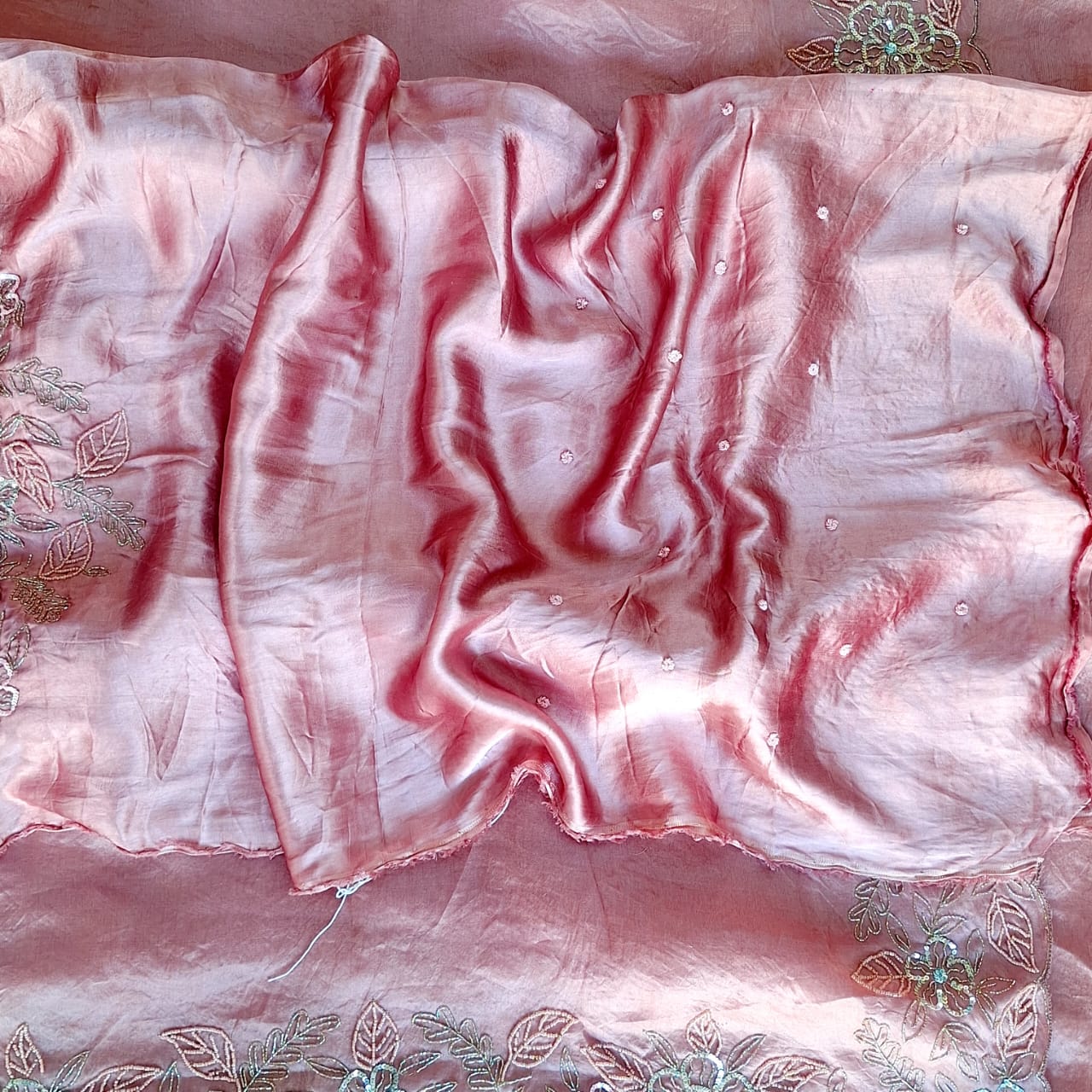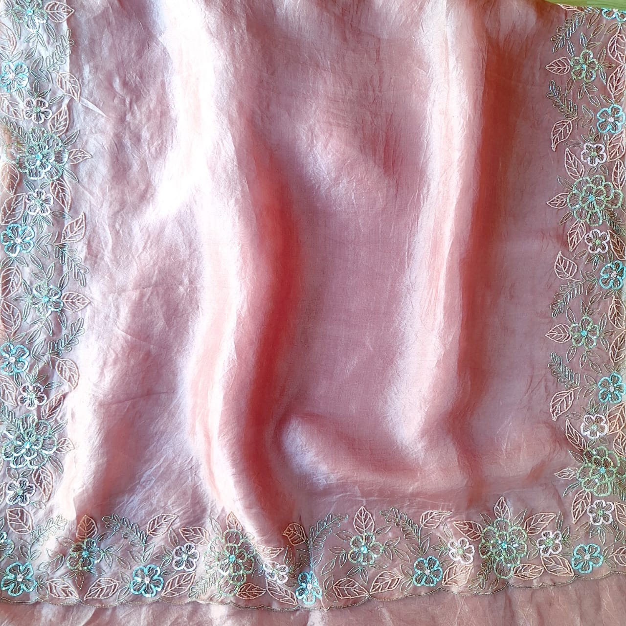 A luxurious Blush pink pure organza saree and Gajji Blouse with heavy sleeves work and front booties, back boota. crafted with a subtle sheen that beautifully enhances its rich texture. The saree is adorned with delicate handwork detailing—including Cutdana, Sequins and Colour moti that add a sophisticated sparkle without overpowering the timeless look. Lightweight, graceful, and effortlessly elegant, this saree is perfect for weddings, festive occasions, and evening celebrations.
