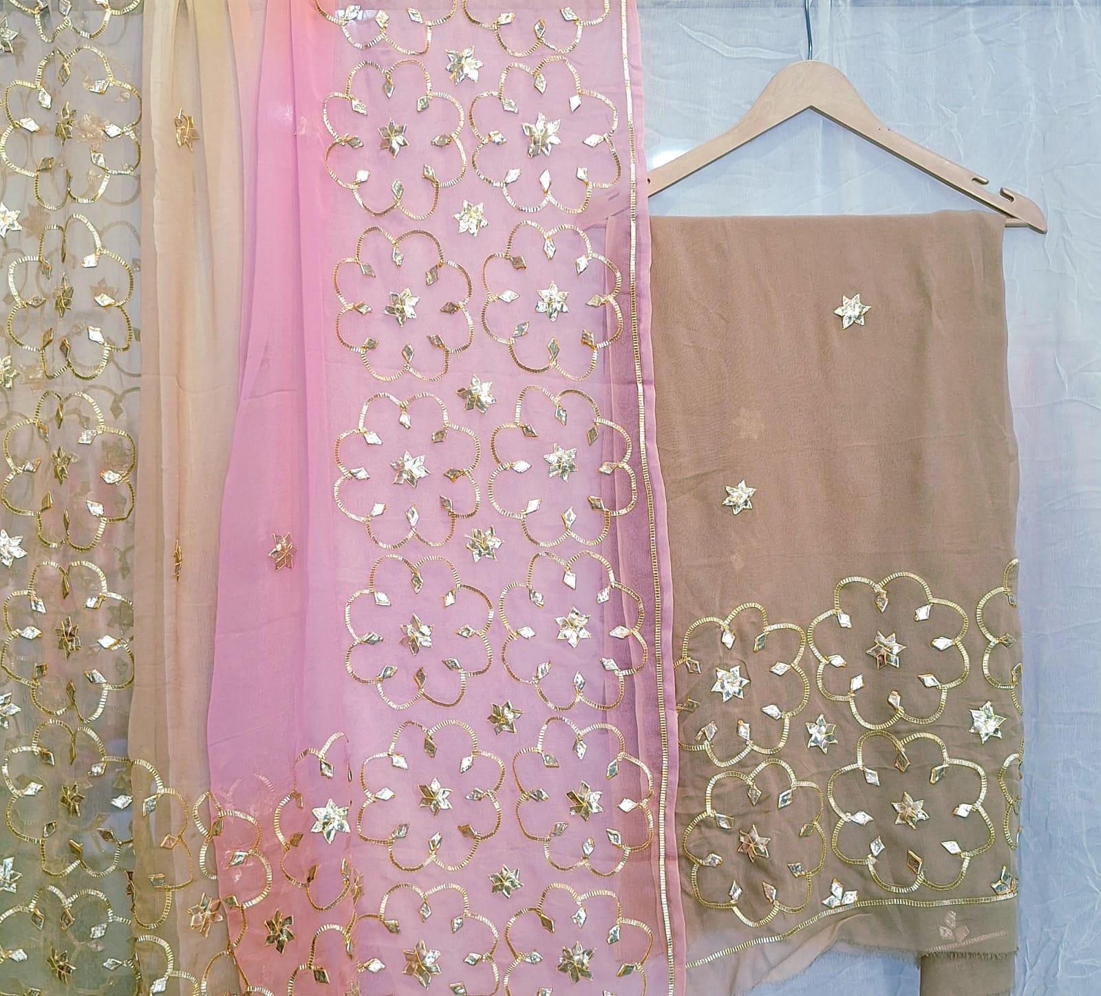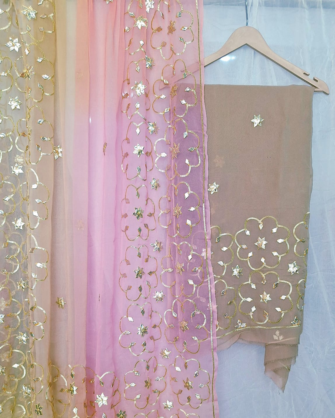 Add a touch of refined elegance to your wardrobe with this stunning brown georgette suit set, paired with a chiffon pink–brown shaded dupatta. The ensemble is beautifully enhanced with intricate Kacchagota handwork, showcasing traditional craftsmanship and timeless charm. Accompanied by comfortable santoon pants, this unstitched set is perfect for festive occasions, weddings, and special celebrations.
