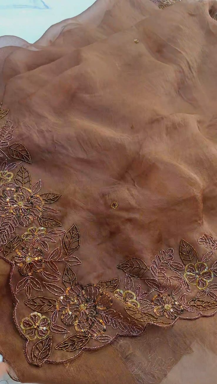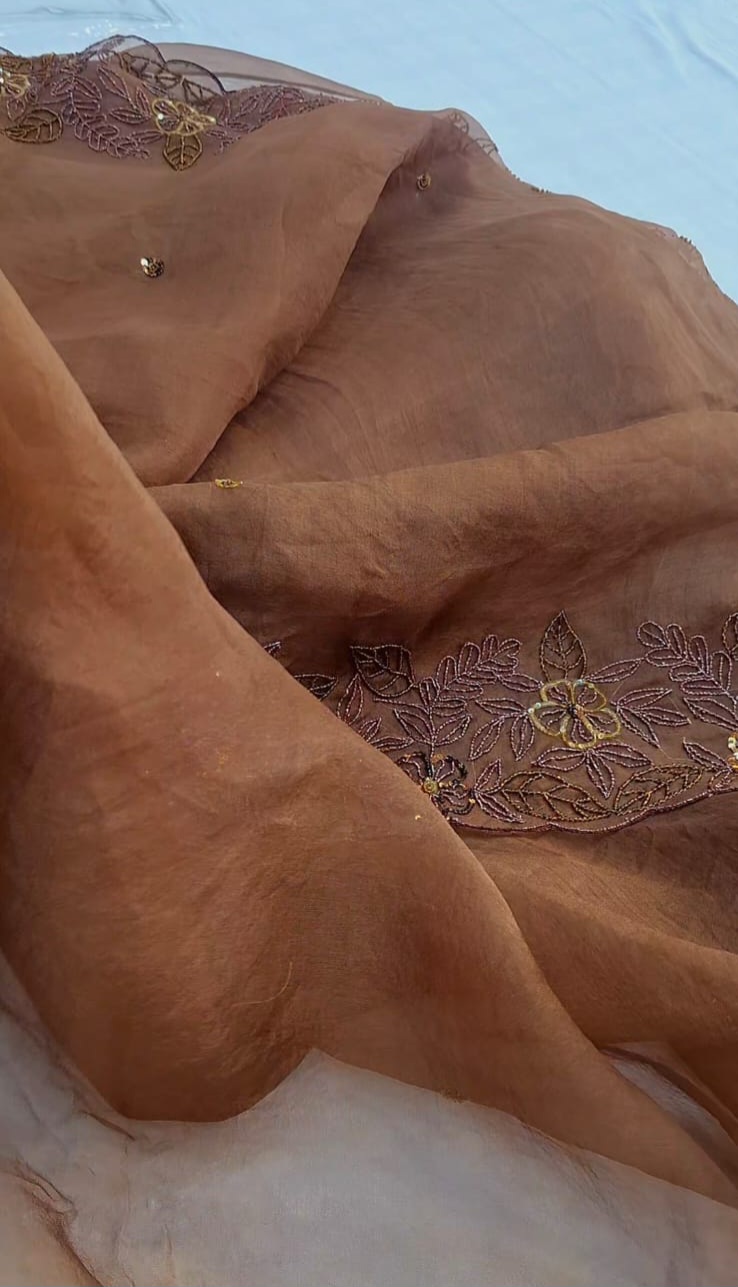 Elevate your ethnic wardrobe with this stunning brown pure organza saree, designed to reflect timeless elegance and grace. Crafted from premium-quality organza, the saree features a lightweight, sheer texture that drapes beautifully, creating a soft and flowy silhouette.
