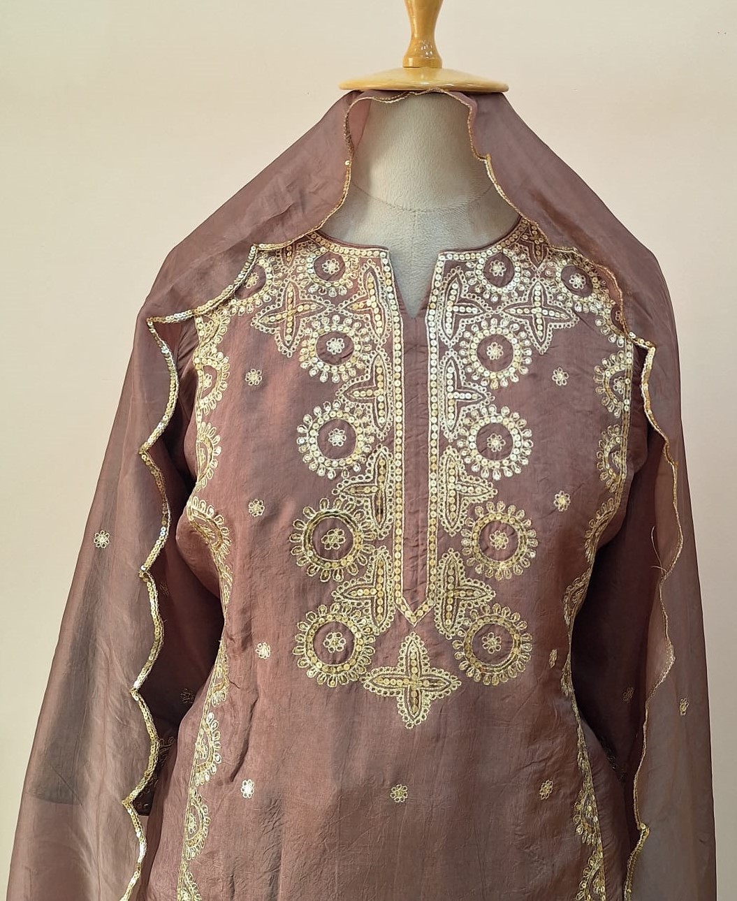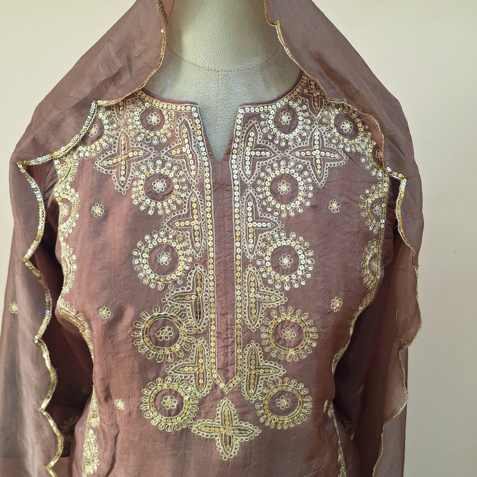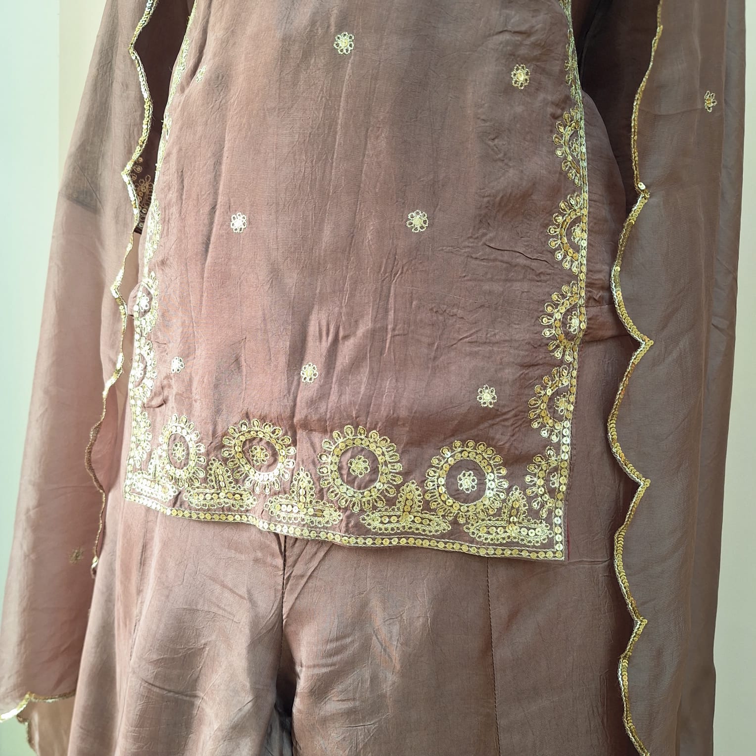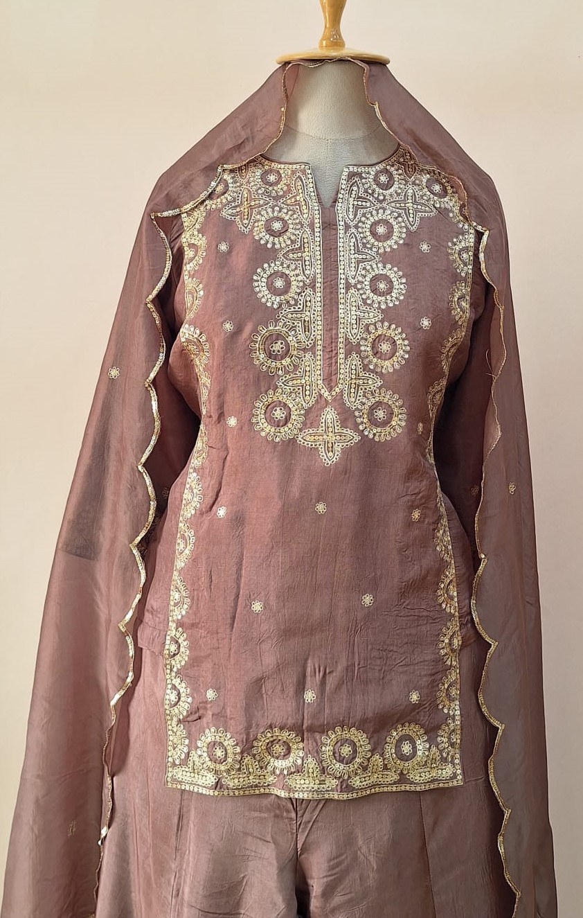 Elevate your summer ethnic wear with this elegant brown silk kurti set, crafted for timeless style and comfort. The short kurti features intricate handwork detailing of Sequins and Pitton that adds a subtle handcrafted touch. Paired with a gracefully flared palazzo, the outfit offers a flattering silhouette and effortless movement. The matching dupatta completes the ensemble, making it perfect for festive occasions, daytime gatherings, or sophisticated casual wear. A beautiful blend of traditional craftsmanship and modern design.