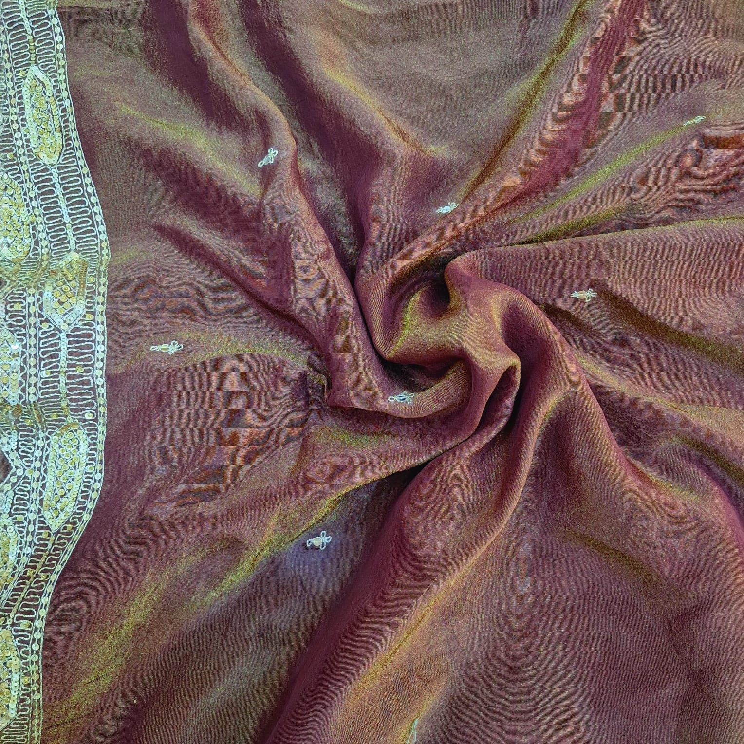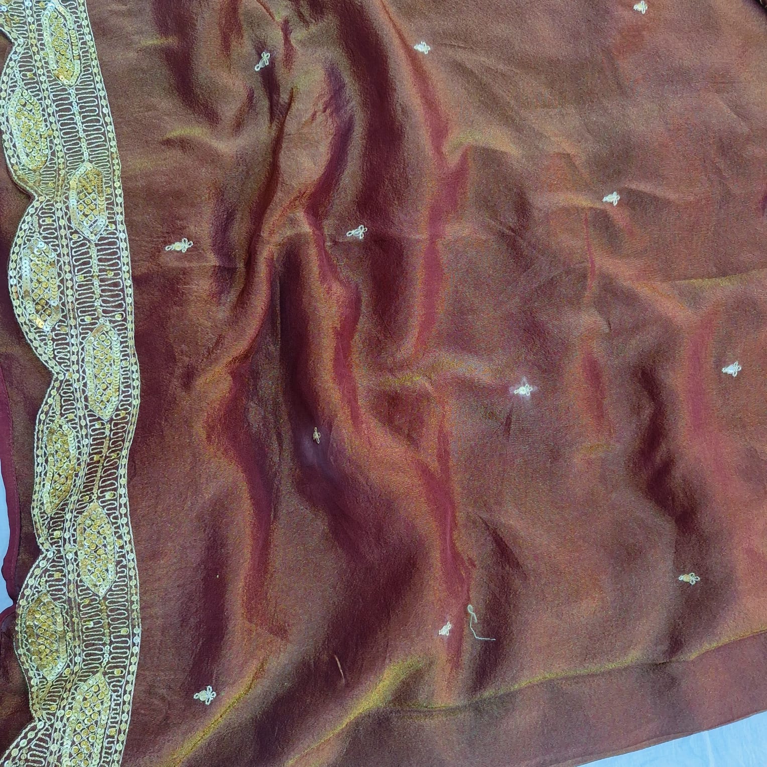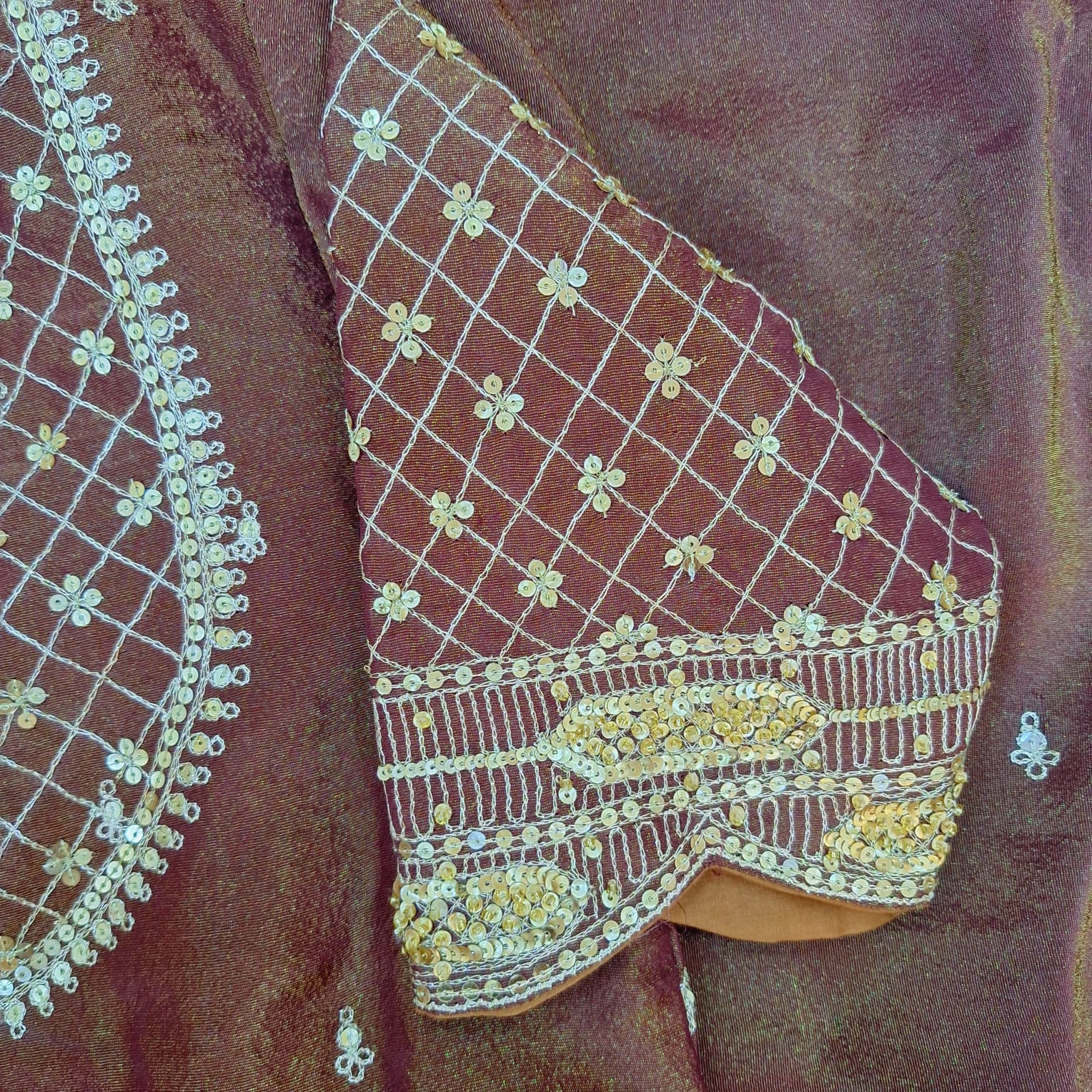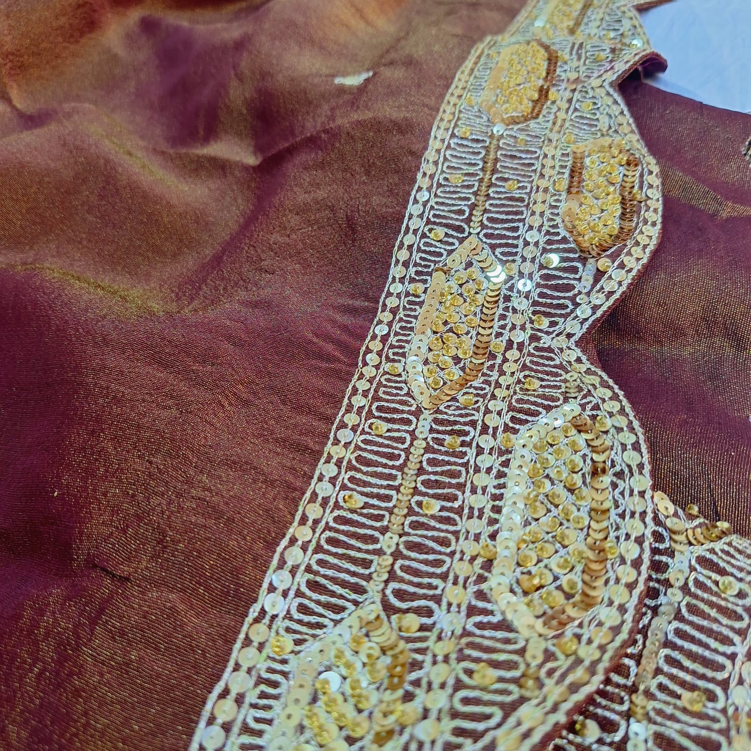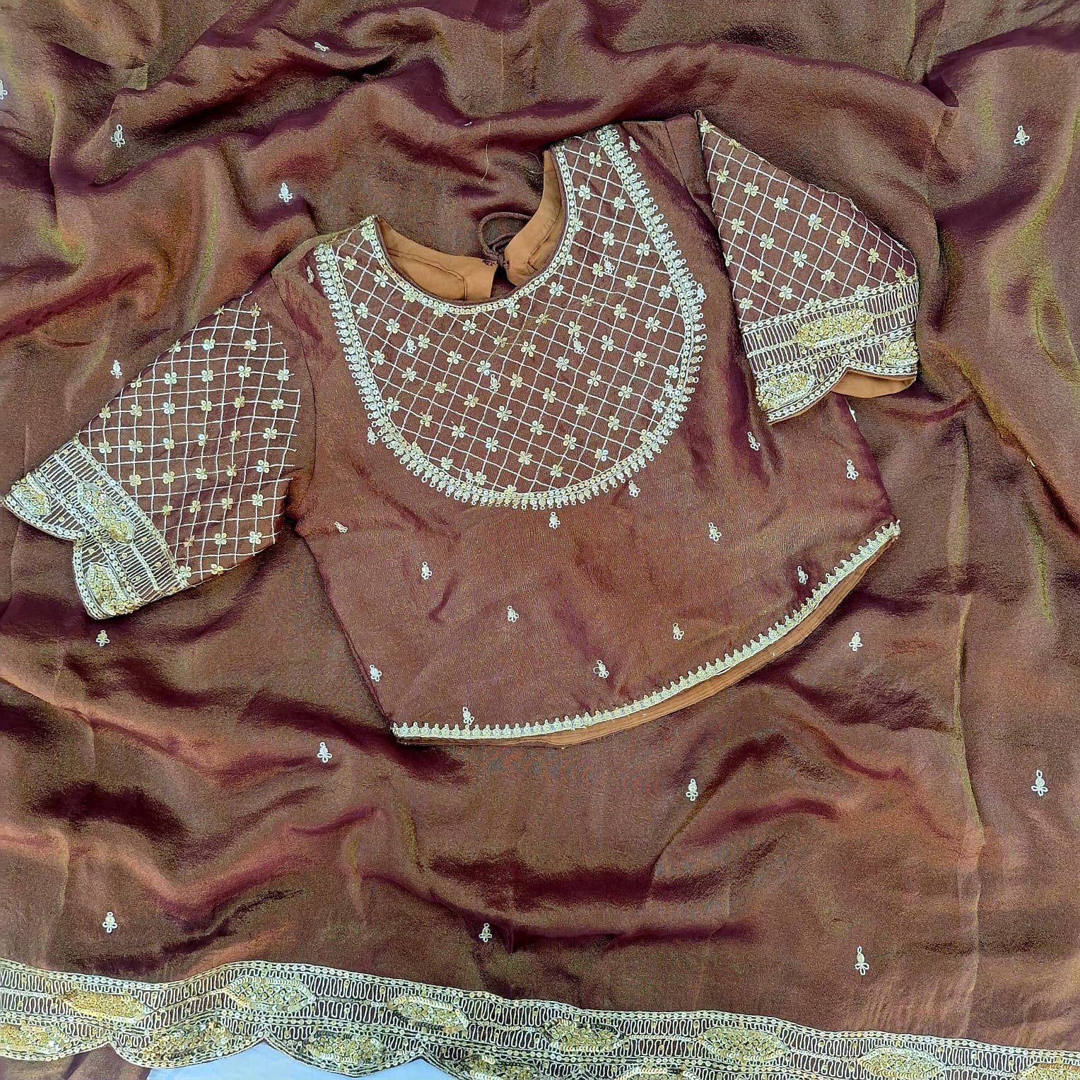 A luxurious brown tissue saree crafted with a subtle sheen that beautifully enhances its rich texture. The saree is adorned with delicate handwork detailing—including fine cutdana, sequins, pearl and pitton that add a sophisticated sparkle without overpowering the timeless look. Lightweight, graceful, and effortlessly elegant, this saree is perfect for weddings, festive occasions, and evening celebrations.