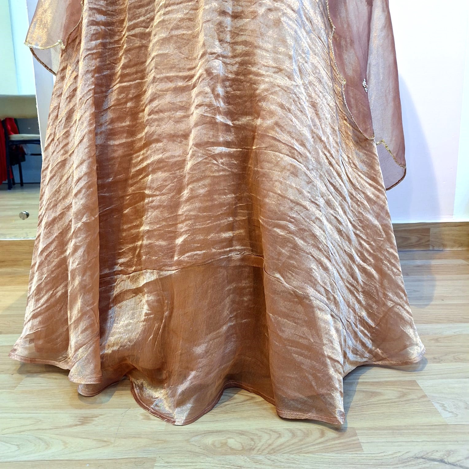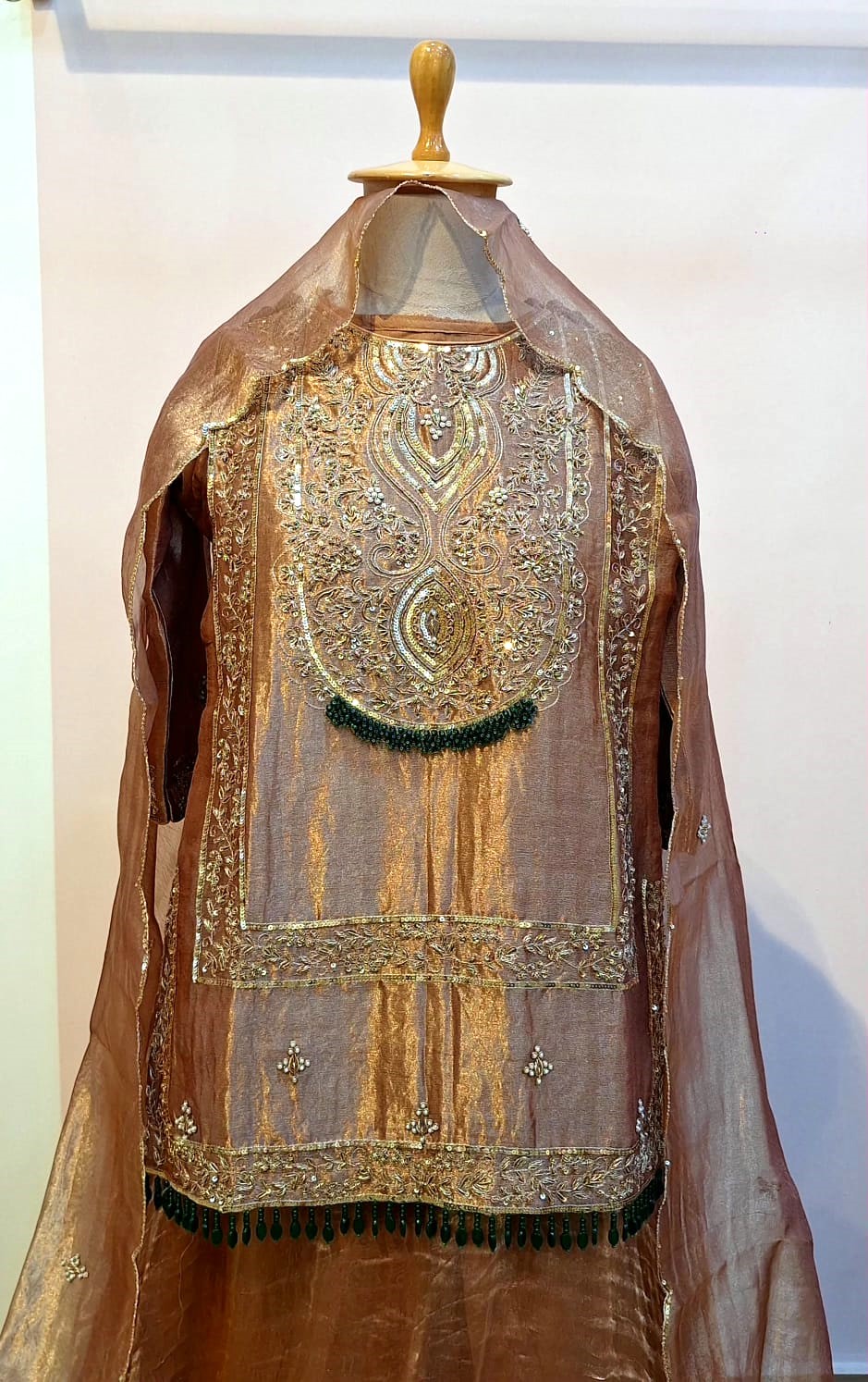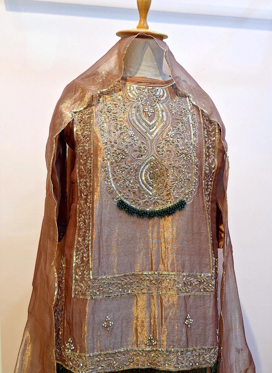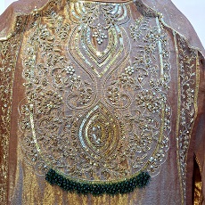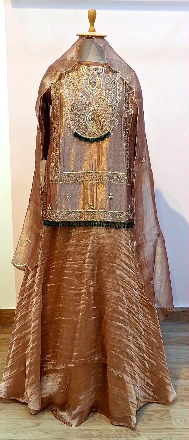 Elevate your festive wardrobe with this elegant copper brown three-piece ethnic ensemble, thoughtfully designed to showcase rich craftsmanship and timeless appeal. The subtle sheen of tissue fabric paired with intricate hand embellishments makes this outfit perfect for special occasions. The short kurti, crafted from premium tissue fabric, is exquisitely embellished with detailed Zardozi handwork, highlighted with Sequins and Pearl embellishments, creating a luxurious and graceful look. The kurti offers a flattering fit while maintaining comfort and ease of wear. Complementing the kurti is a flowy skirt that enhances the silhouette with elegant movement, while the matching dupatta completes the ensemble with a refined drape and coordinated detailing, adding to the overall sophistication.