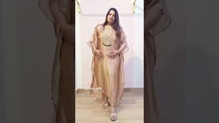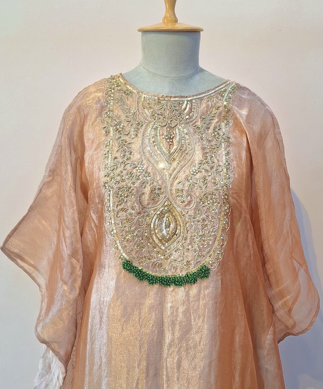 Refresh your festive wardrobe with this elegant Copper Brown kaftan with detachable inner wear and matching pant in pure Tissue fabric, beautifully adorned with delicate handwork of Zardozi, Sequins and Moti. Designed for effortless drape and comfort, the flowing kaftan silhouette adds a touch of contemporary charm while maintaining a traditional essence. Perfect for festive celebrations, resort wear, or intimate gatherings, this set offers a graceful look with a relaxed yet luxurious feel.