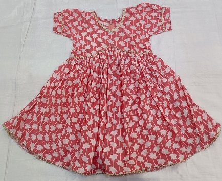 Let her shine in this delightful two-piece frock set crafted in breathable cotton, featuring a crisp white base adorned with soft peach floral prints and shimmering gota patti detailing — perfect for festive gatherings, family functions or photo-moments.