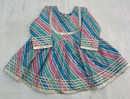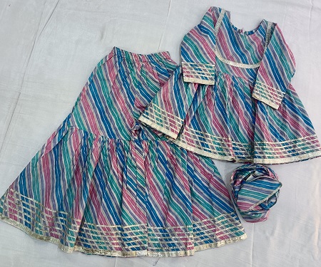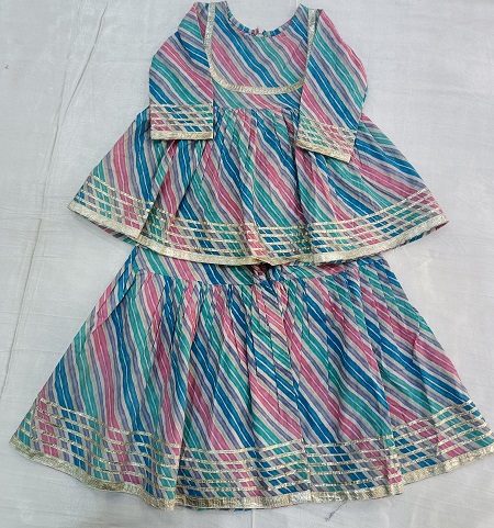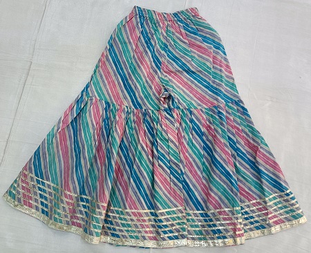 Add playful festive charm to your little girl’s wardrobe with this cotton multi-leheriya peplum sharara set. The vibrant leheriya pattern brings a colorful traditional touch, while the soft cotton fabric ensures all-day comfort. The stylish peplum top is paired with a flared sharara for a graceful and adorable look. Finished with elegant lappa lace detailing on the outfit and dupatta, this set is perfect for festivals, weddings, and family celebrations. A cute and comfortable ethnic outfit for your little princess!