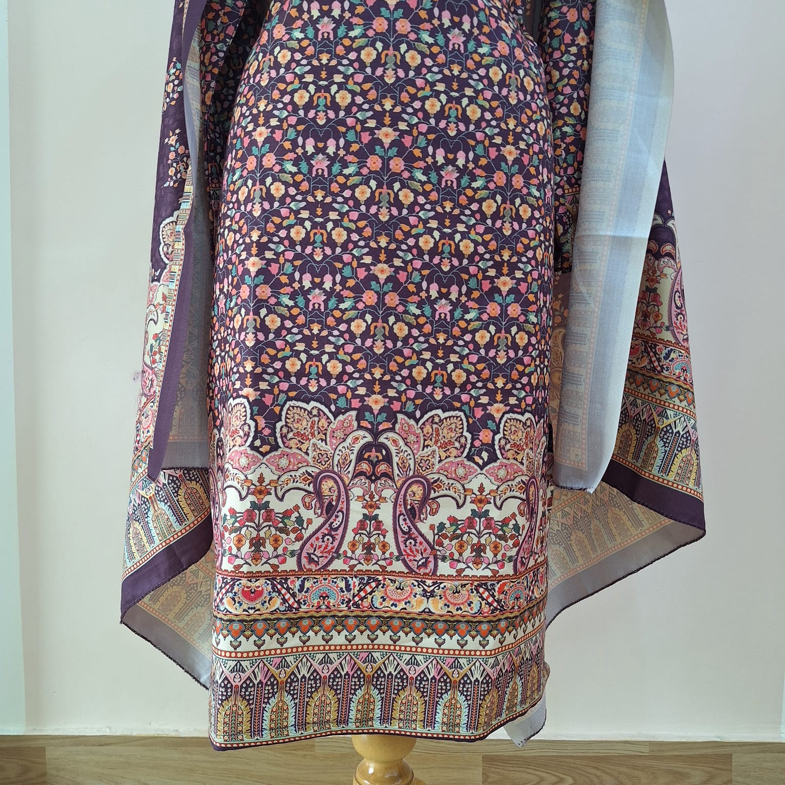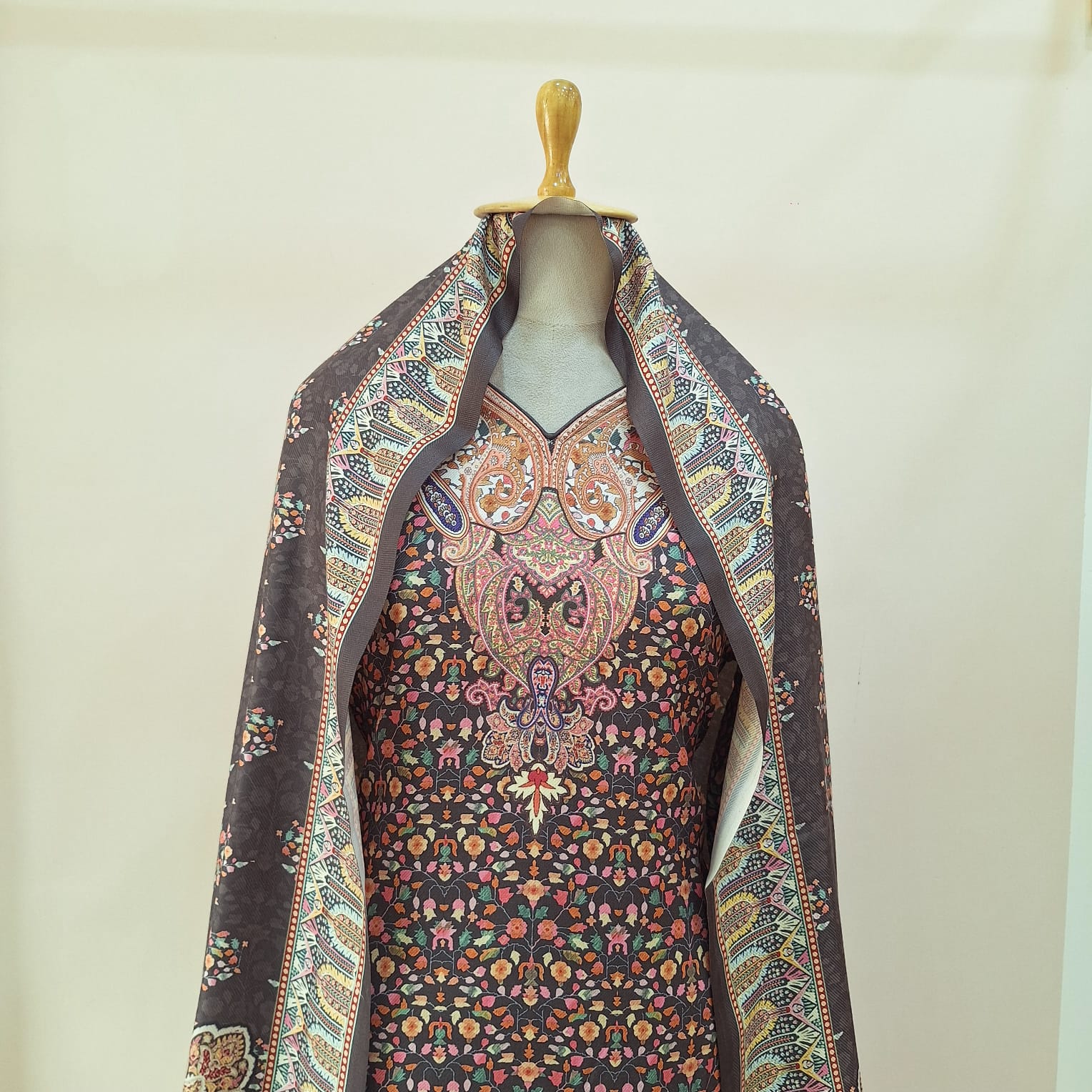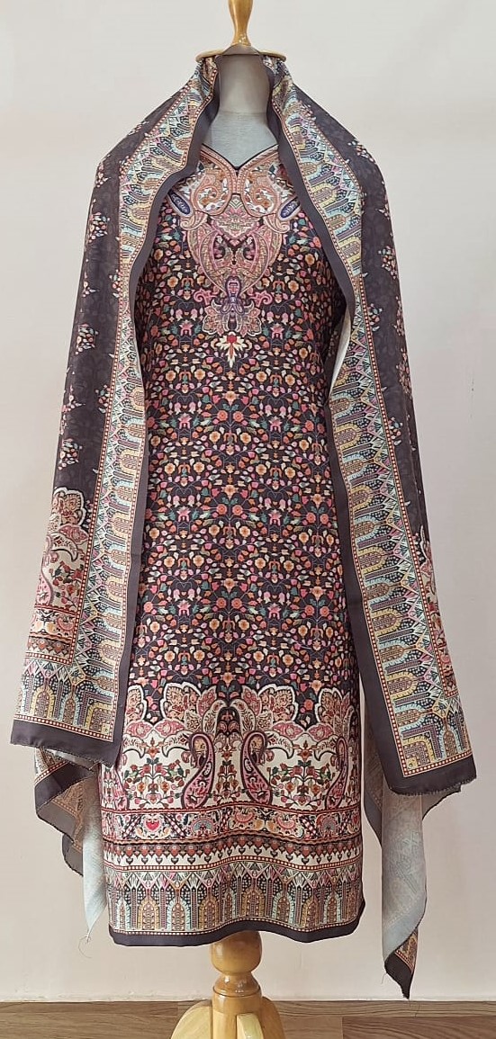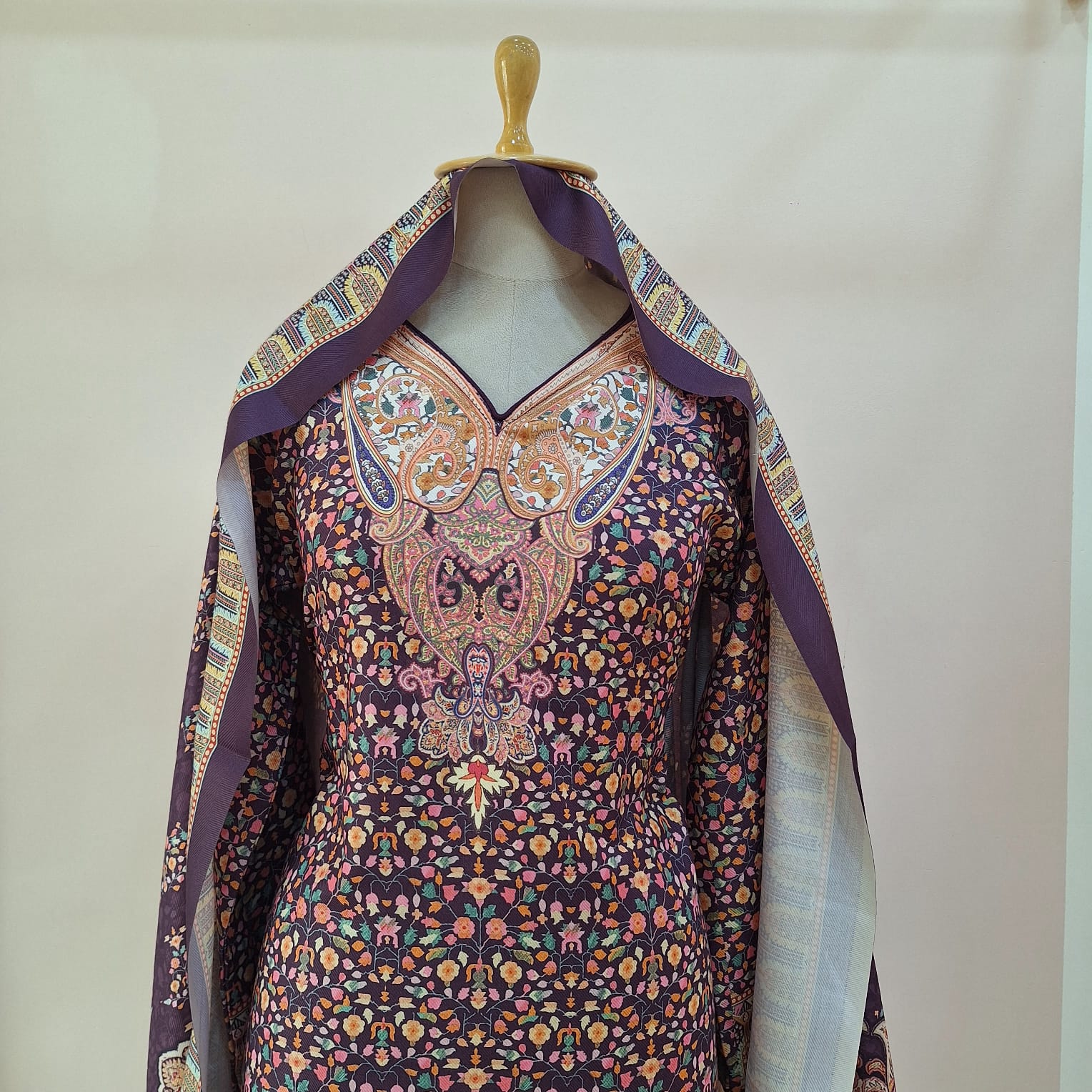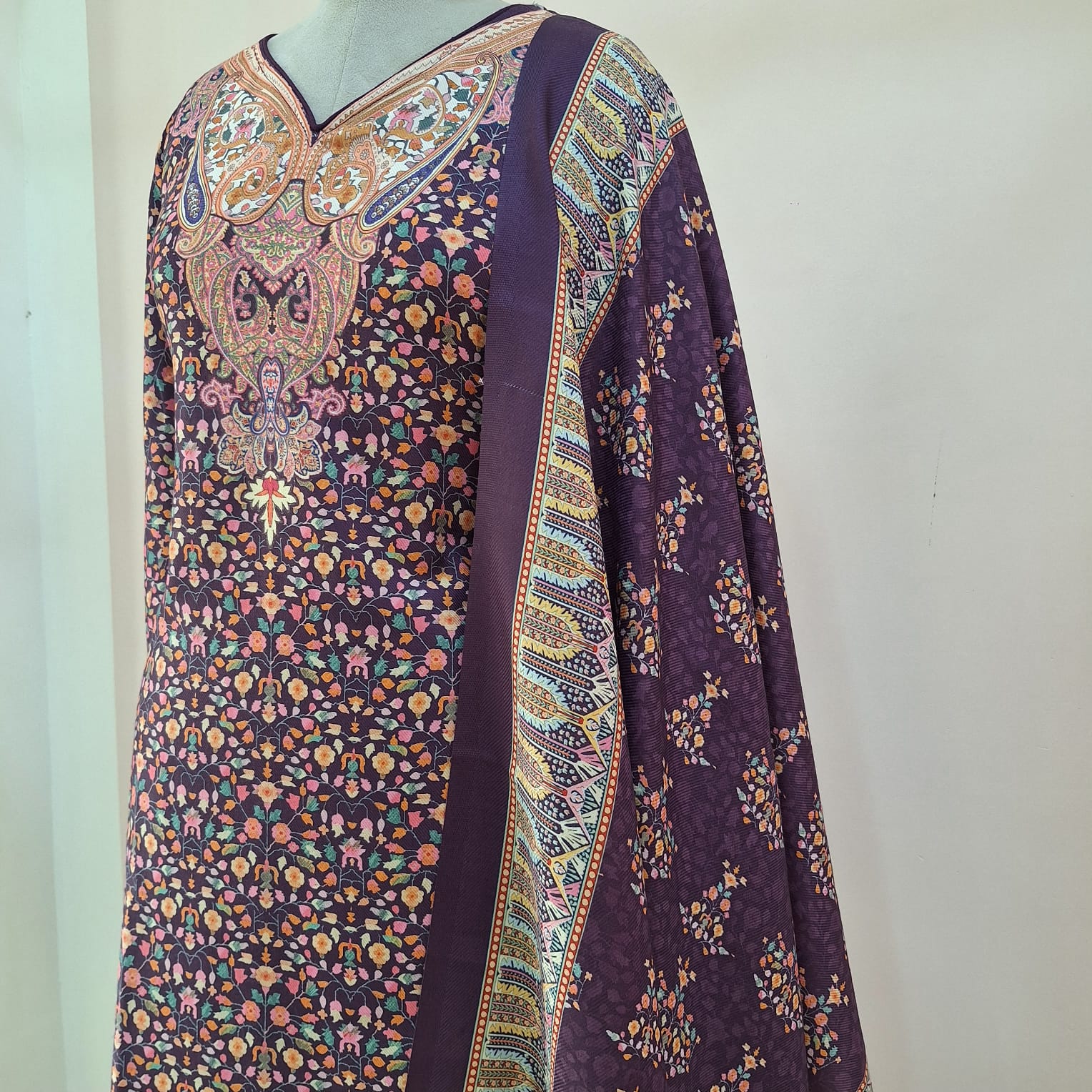 Exude royal elegance this winter with this Dark Purple Printed (Kashmiri Print) Woollen Suit Set. Crafted from premium wool fabric, it features intricate Kashmiri-inspired motifs that add a rich traditional charm. The deep purple hue enhances the artistry of the print, making it perfect for festive gatherings or elegant winter occasions.