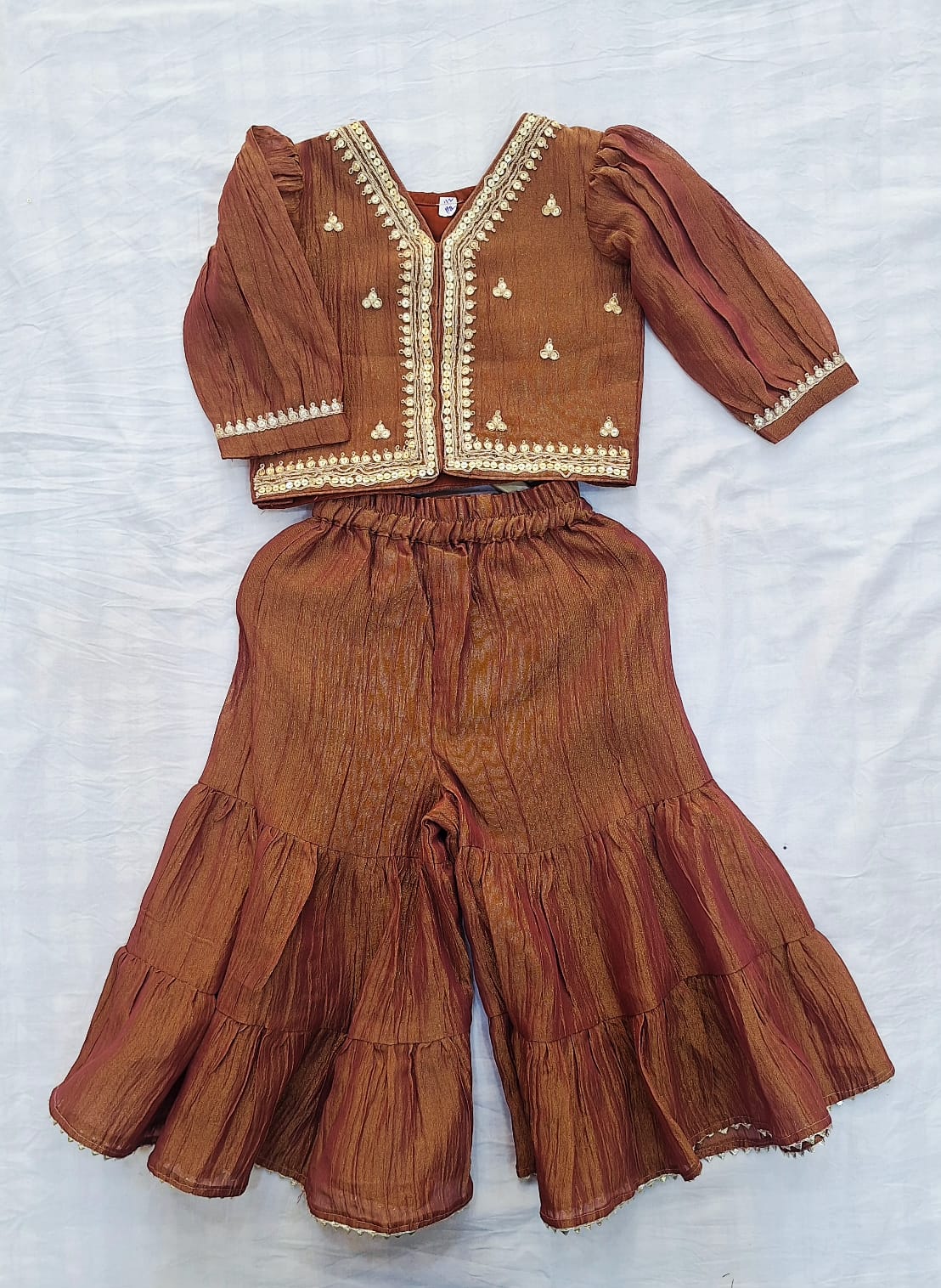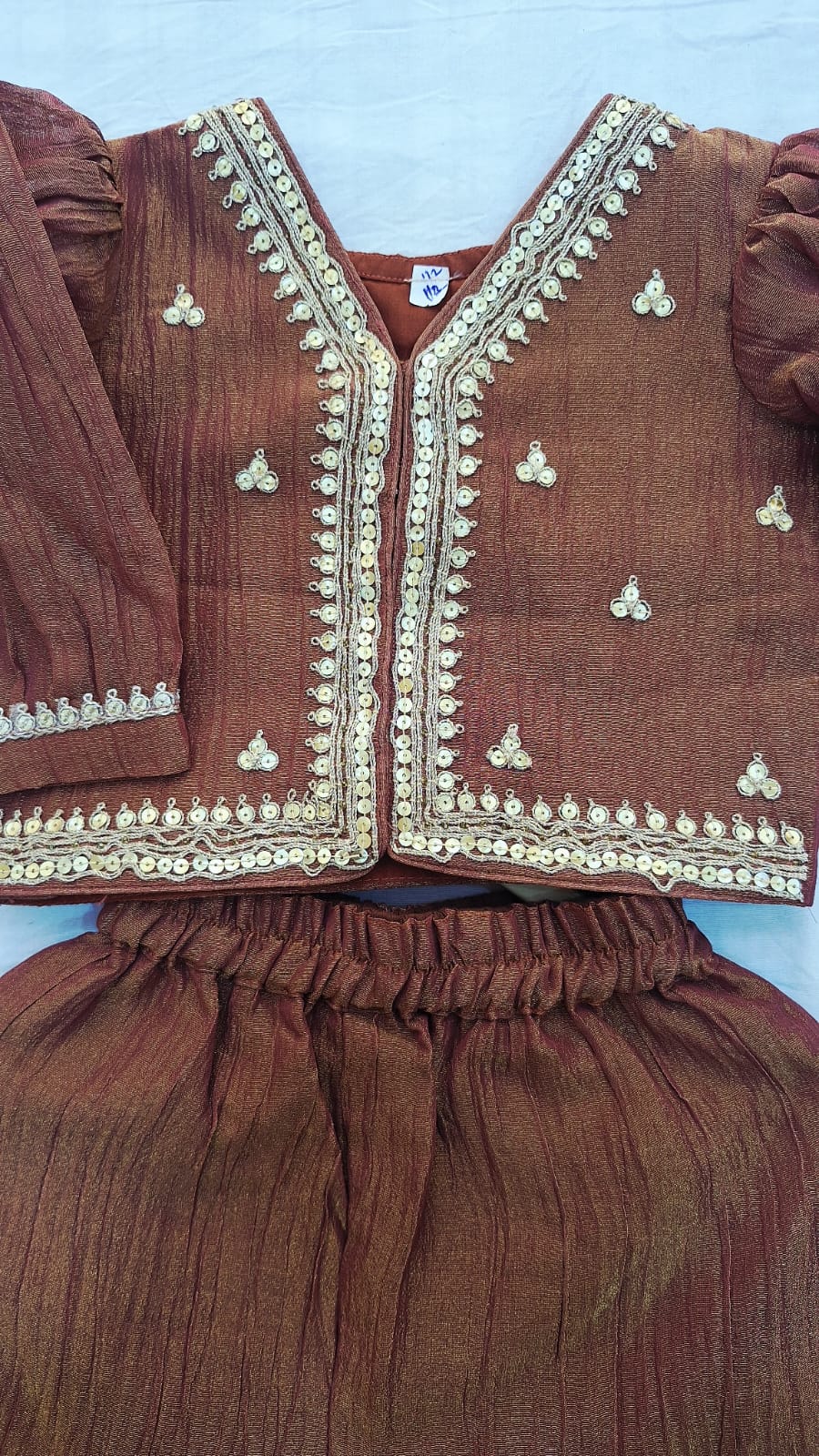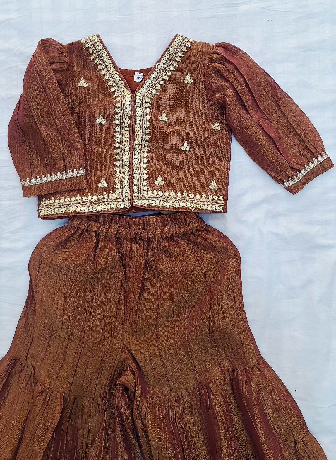 Make your little one the star of any occasion with this elegant dark rust brown crush tissue kids set. The outfit features a beautifully crafted peplum top with intricate handwork, paired with a matching sharar for a festive and stylish look. Perfect for weddings, parties, and celebrations, this set combines comfort with traditional charm.