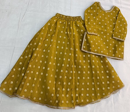 Dress your little princess in pure festive elegance with this green Banarasi booti kids set. The outfit features a stylish short kurti paired with a flared skirt and matching dupatta, all showcasing beautiful traditional Banarasi booti weaving. Each piece is finished with marodi lace detailing — on the kurti, skirt, and dupatta — adding a rich handcrafted touch and royal charm. Perfect for weddings, festivals, and special occasions, this set blends tradition, comfort, and timeless beauty for your little one.