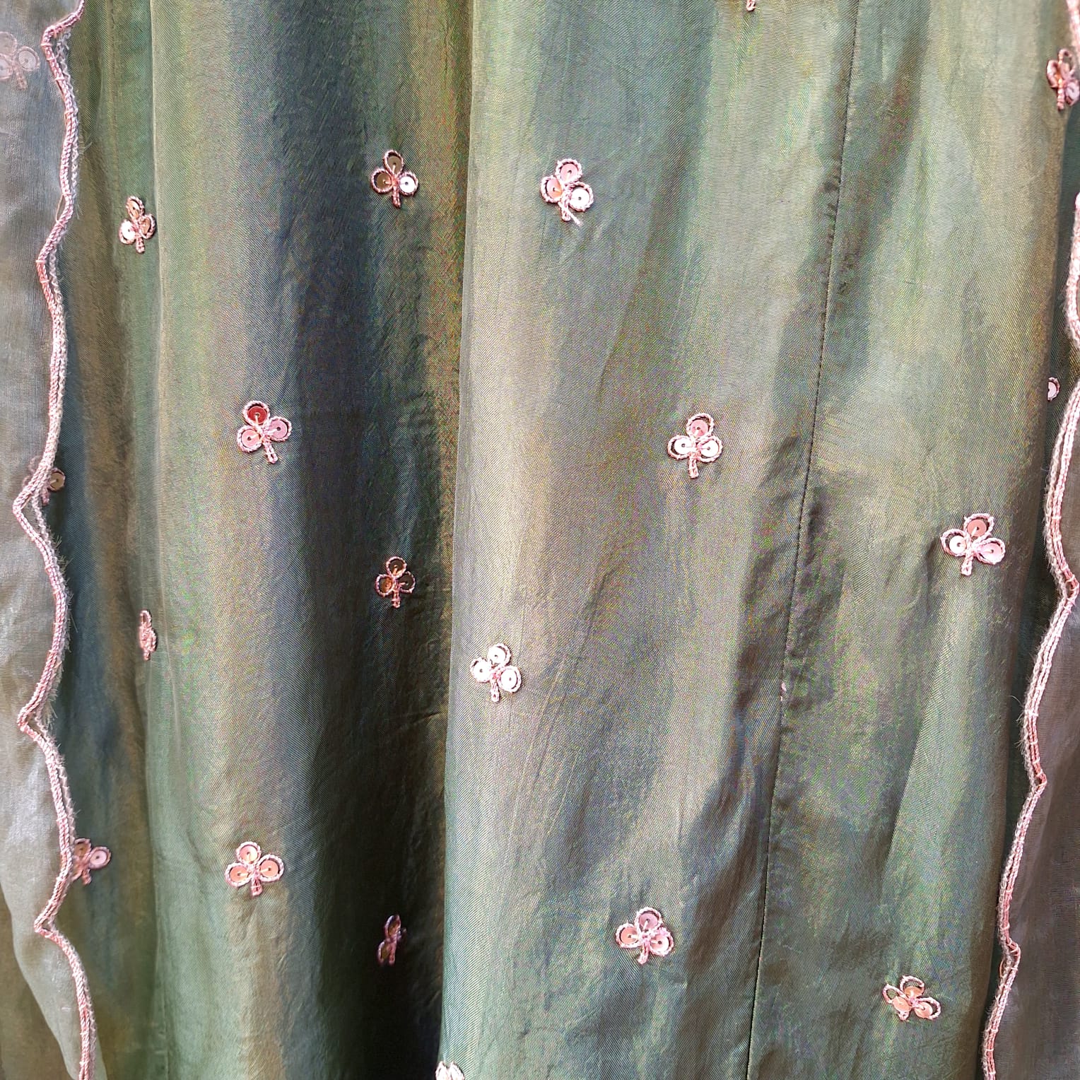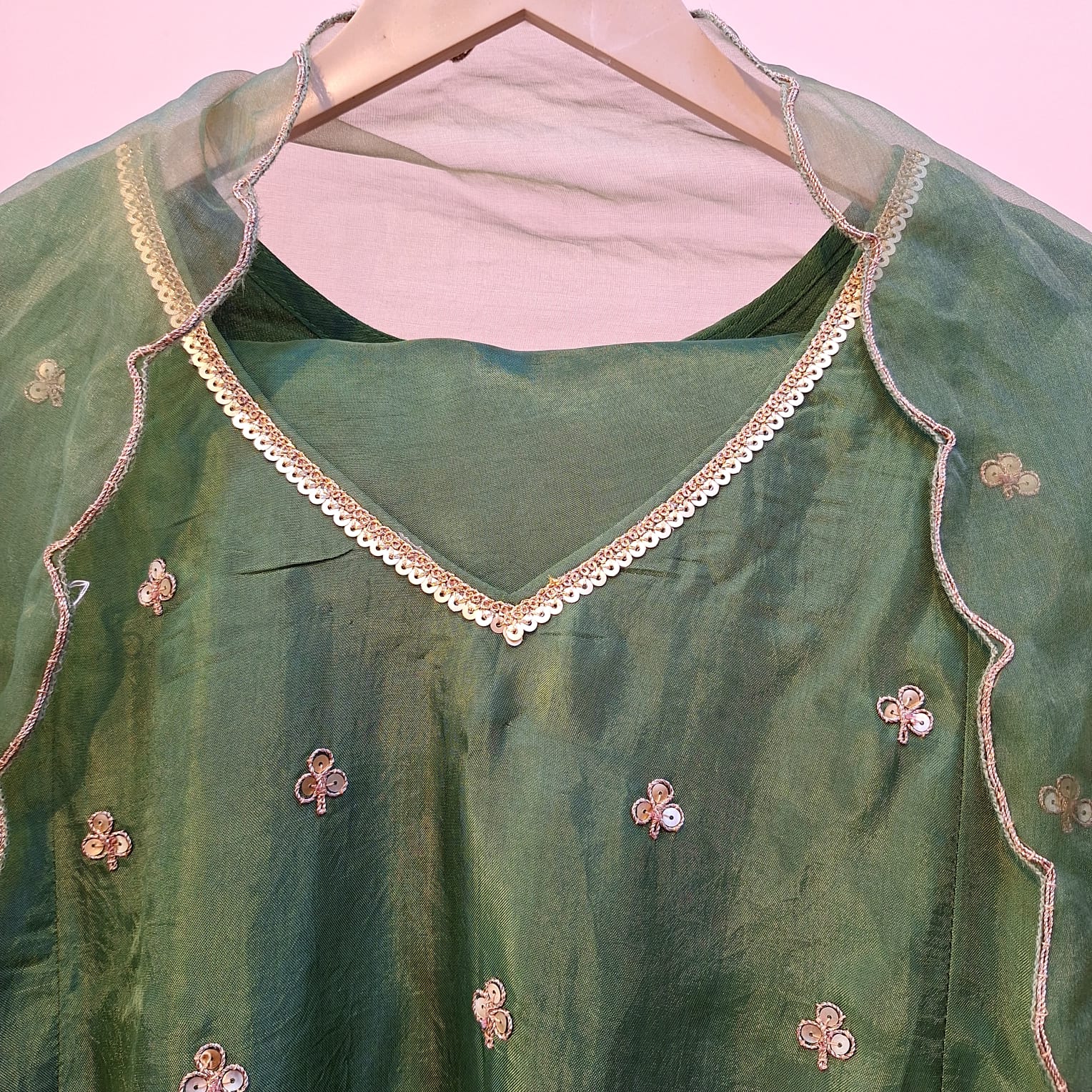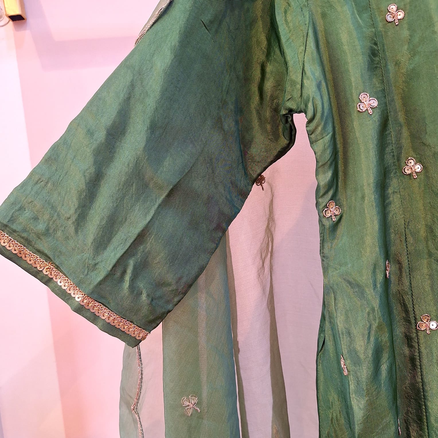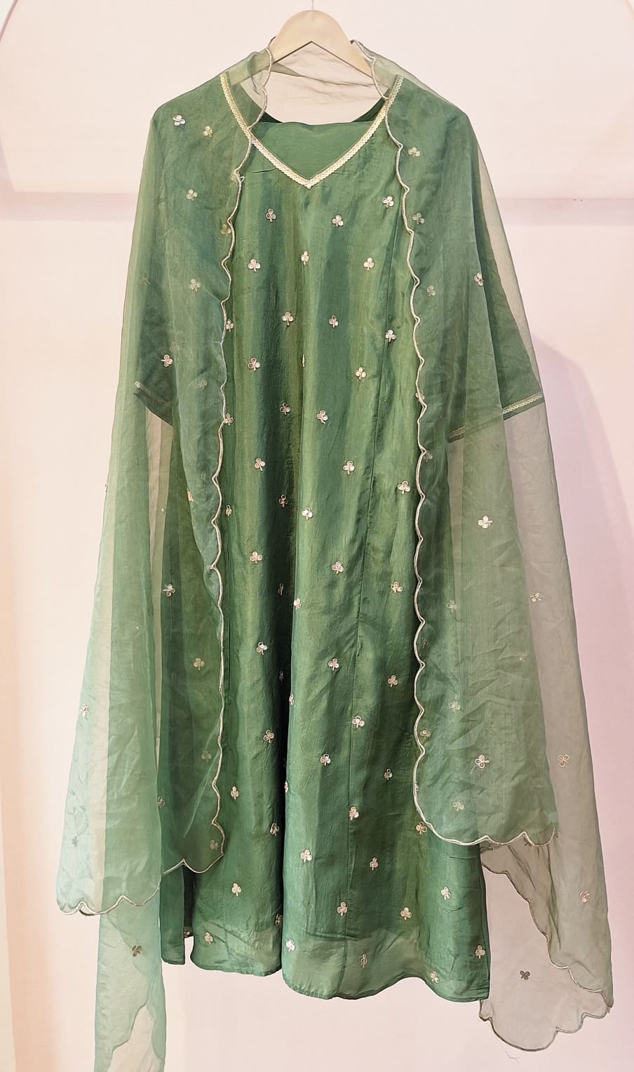 This elegant green ethnic ensemble features a beautifully crafted suit (kurta) paired with a tailored pant and a matching dupatta, making it a perfect choice for festive and traditional occasions. The kurta is adorned with intricate hand embroidery of Sequins, highlighting fine craftsmanship through detailed threadwork and subtle embellishments that add richness and sophistication to the design. Its graceful silhouette ensures comfort while enhancing the overall look. The pant is designed with a clean, structured fit that complements the kurta perfectly, offering ease of movement and a modern touch. Crafted from premium fabric of Summer Silk, it balances style and comfort effortlessly. Completing the ensemble, the matching dupatta adds elegance with delicate detailing and refined borders, tying the look together with a polished finish. Ideal for festive celebrations, family functions, cultural events, and special occasions, this green handwork suit set reflects timeless charm and understated elegance. Style it with statement earrings and ethnic footwear for a complete and refined look.