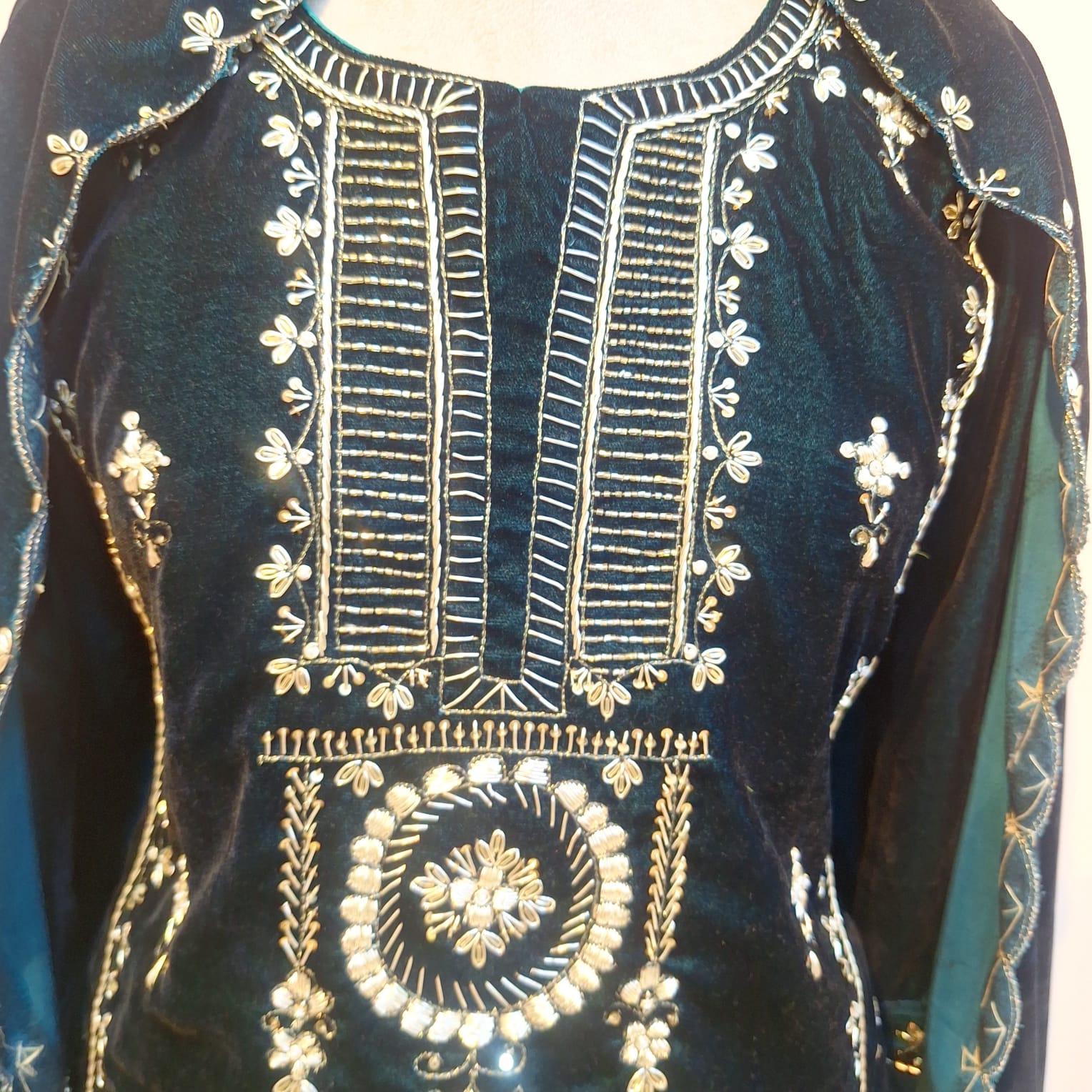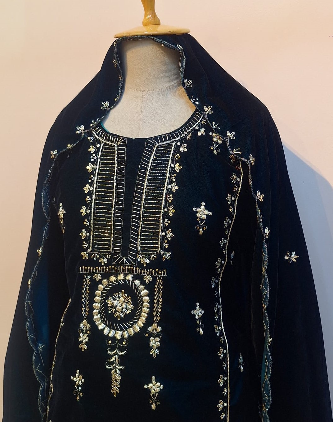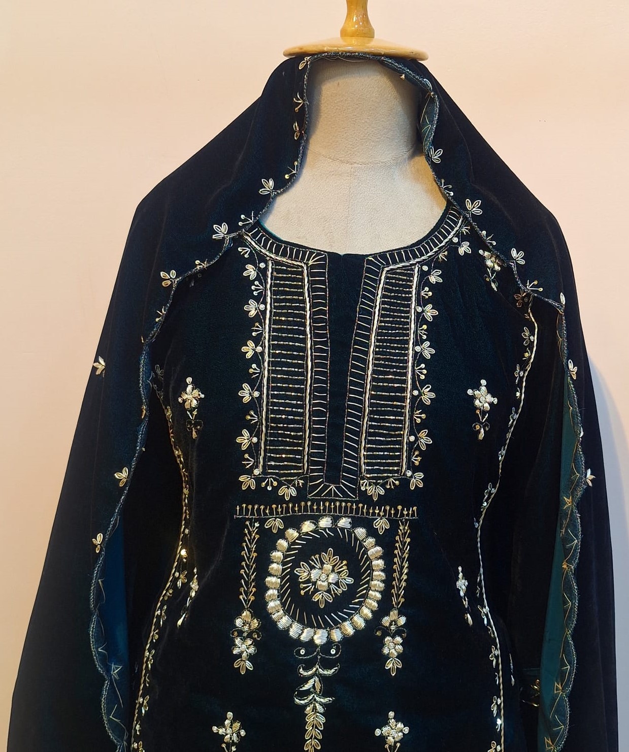Elevate your festive wardrobe with this luxurious greenish-blue velvet suit set. Designed on premium soft velvet fabric, the outfit features exquisite handwork detailing with Sequins, Pearl and Zardozi embroidery, adding a rich and regal touch. Paired with matching pants and a complementing dupatta, this set blends elegance with timeless charm. Perfect for weddings, winter festivities and special celebrations.