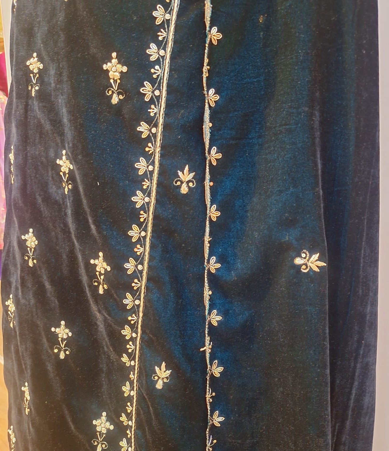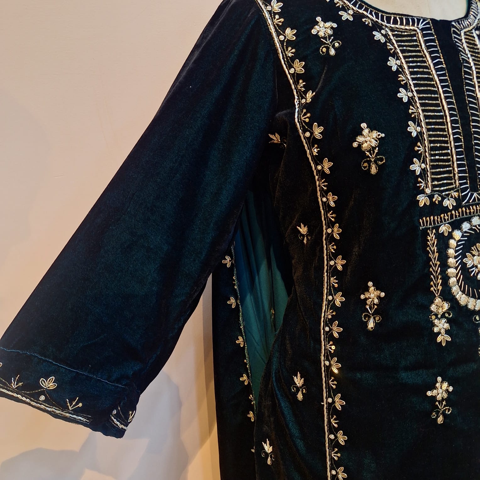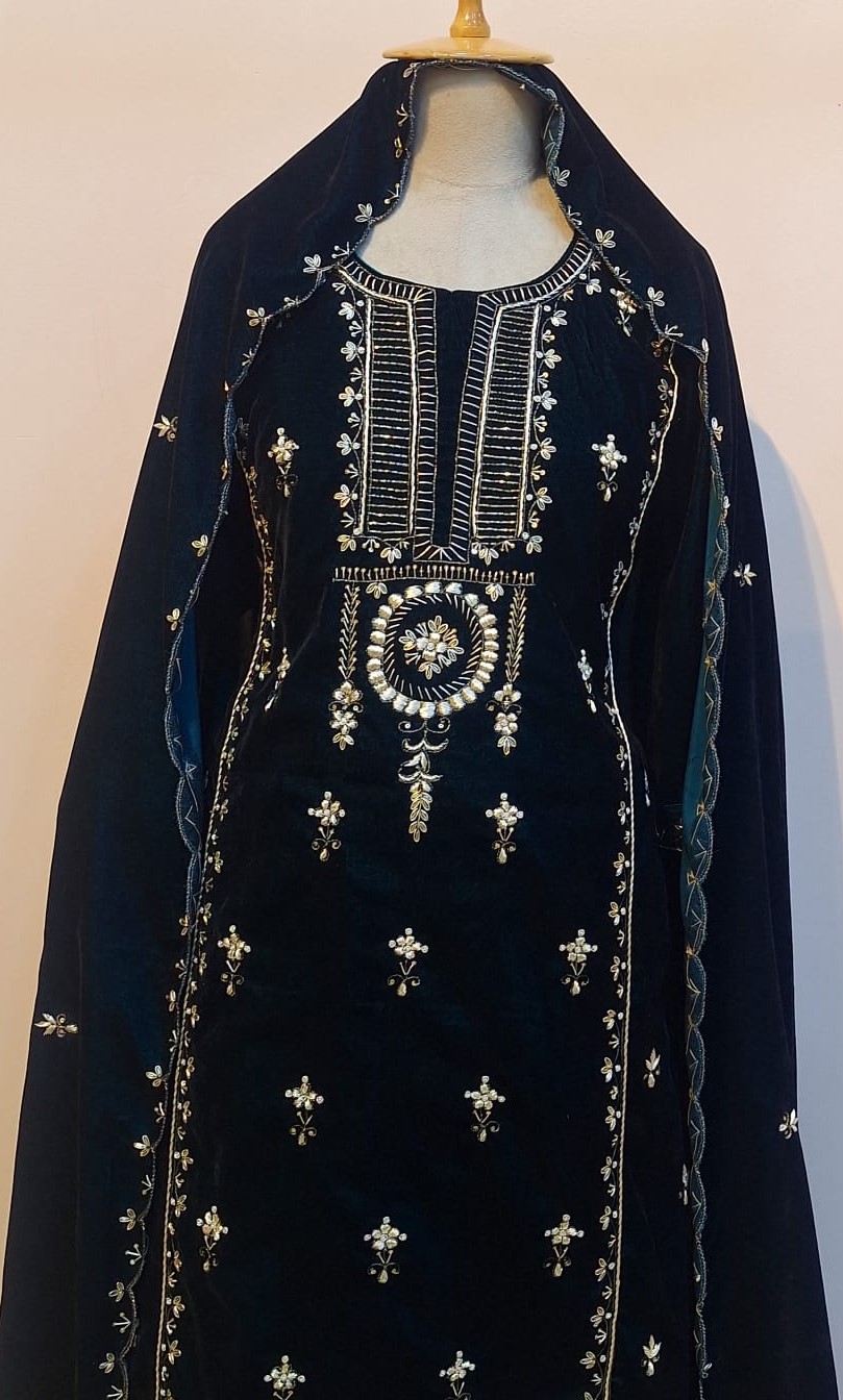 Elevate your festive wardrobe with this luxurious greenish-blue velvet suit set. Designed on premium soft velvet fabric, the outfit features exquisite handwork detailing with Sequins, Pearl and Zardozi embroidery, adding a rich and regal touch. Paired with matching pants and a complementing dupatta, this set blends elegance with timeless charm. Perfect for weddings, winter festivities and special celebrations.