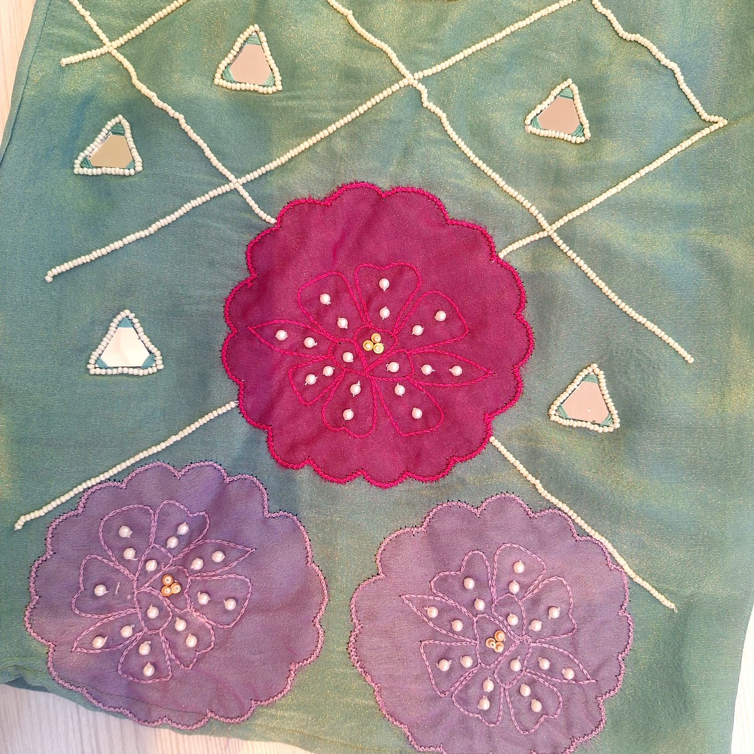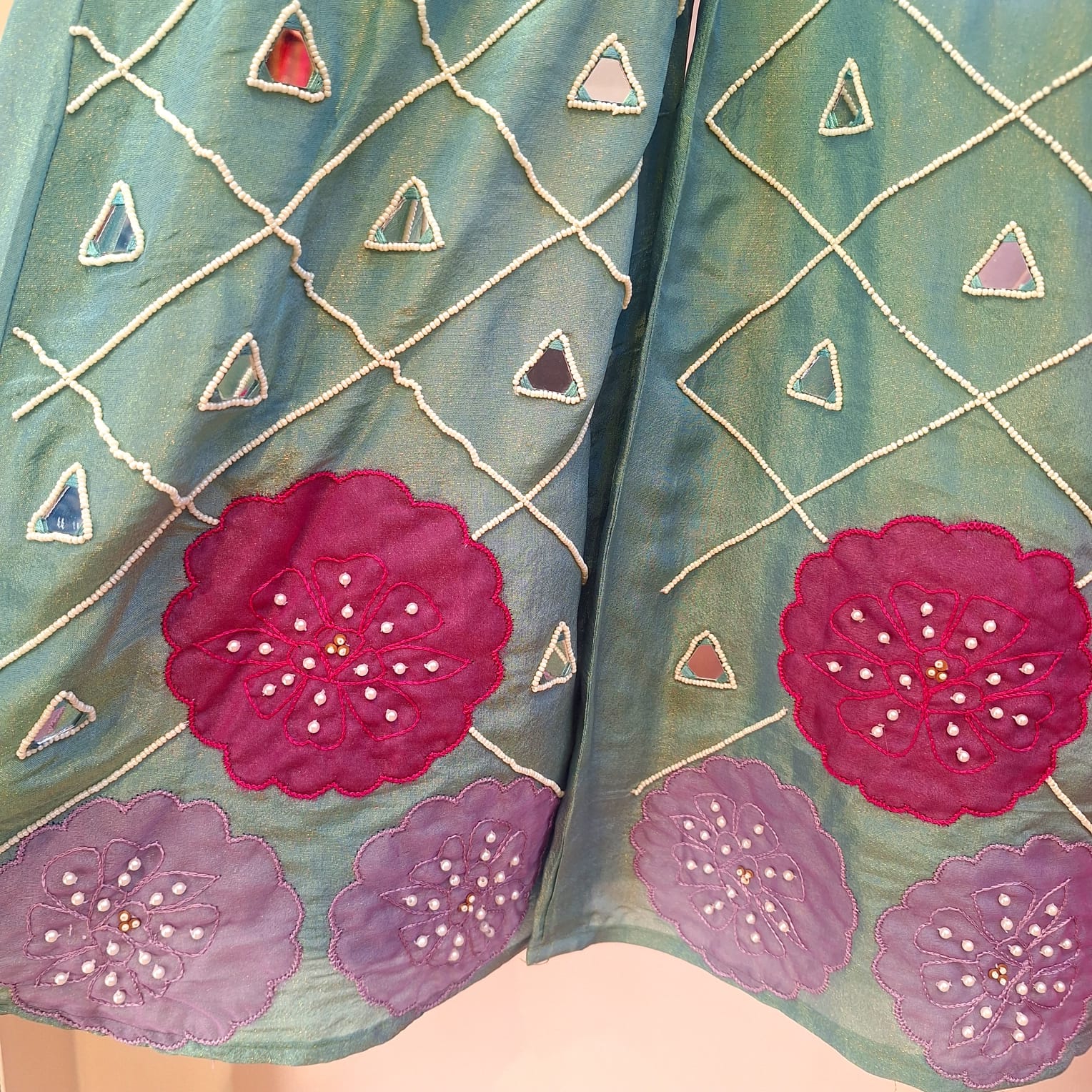 Make your little one shine in this Turquoise Blue Tissue Jumpsuit Kids Set, beautifully designed to blend elegance with playful charm. Crafted from soft, lightweight tissue fabric, this jumpsuit offers a comfortable fit while ensuring a graceful drape that’s gentle on delicate skin. The vibrant turquoise blue shade adds a fresh, festive appeal, making it an ideal choice for special occasions. The outfit is exquisitely embellished with delicate Mirror work, Pearl accents, and intricate 3D floral appliqué, adding a touch of sparkle and texture without compromising comfort. Thoughtfully designed with a relaxed silhouette and neat neckline, the jumpsuit allows easy movement while maintaining a stylish, polished look. Perfect for festive celebrations, weddings, parties, and family functions, this kids set ensures your little one stands out with effortless elegance.