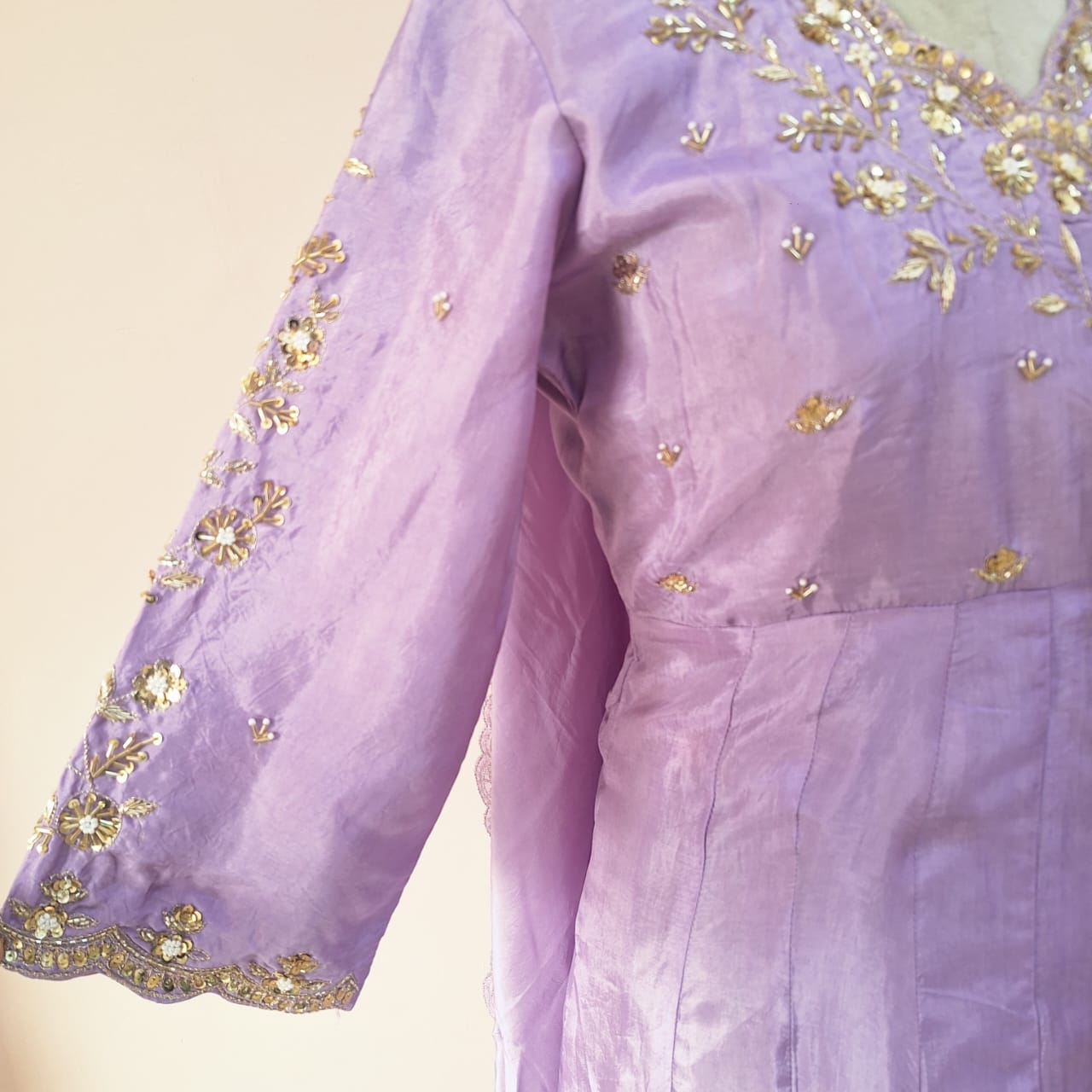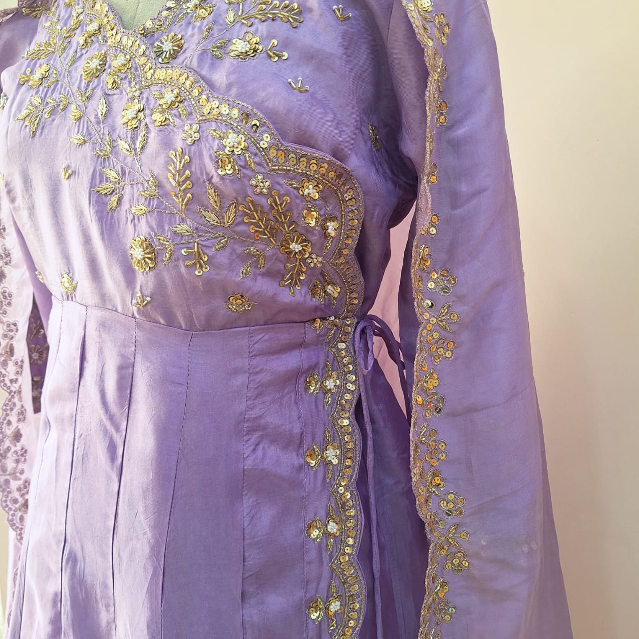 Elevate your festive wardrobe with this lavender Angrakha pant set, crafted in luxurious summer silk for a soft, breathable, and fluid drape. The Angrakha-style kurta features a graceful wrap silhouette, highlighted with intricate handwork of Cutdana, Sequins and Pearl that lends artisanal charm and refined elegance. Paired with tailored pants and a complementing dupatta in matching summer silk, this ensemble offers effortless comfort while maintaining a polished, festive look. Perfect for daytime celebrations, intimate festivities, and elegant summer occasions, this set blends timeless tradition with contemporary sophistication.