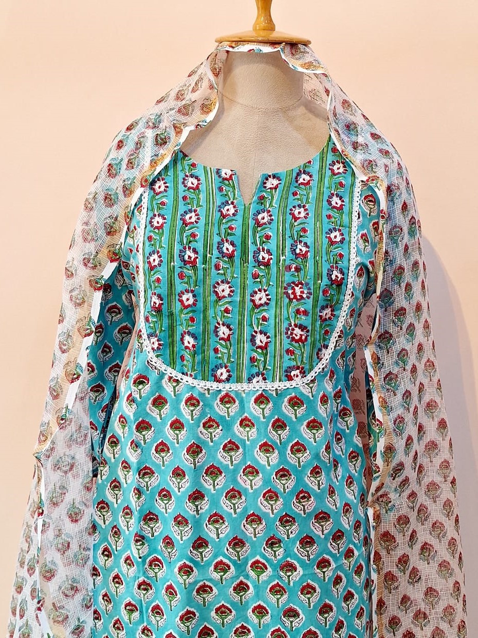 Elegant Light Green Printed Cotton suit adorned with delicate printed detailing for a rich festive look. Paired with perfectly tailored matching pants for a sleek and graceful silhouette. Lightweight Cotton dupatta adds a soft, flowy charm with its beautifully coordinated print. Ideal for festive occasions, family functions and stylish evening wear.