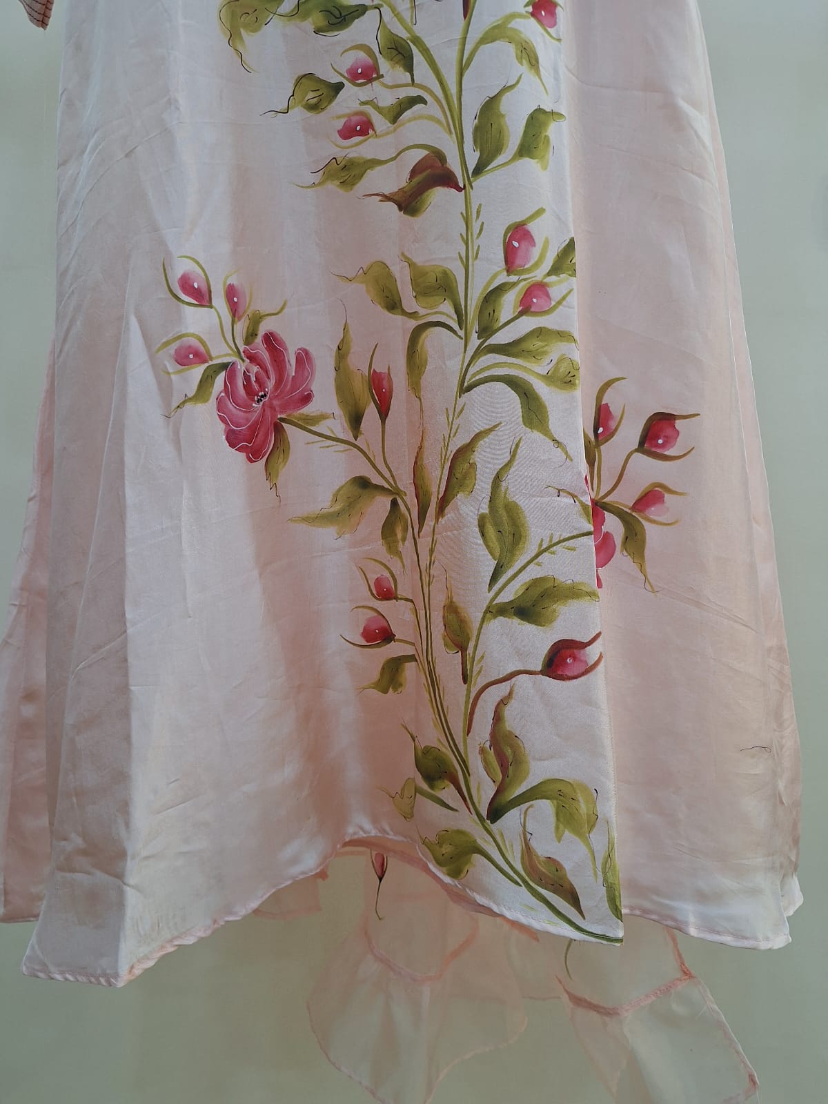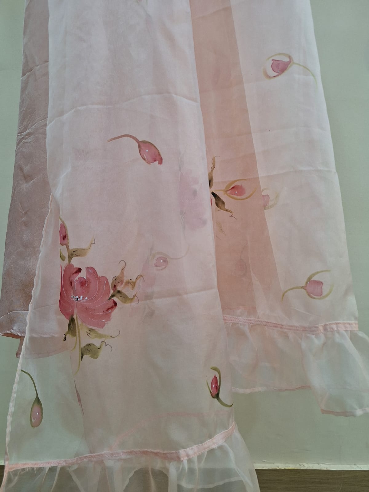 Step into elegance with this serene light peach summer silk suit set, adorned with delicate hand-painted artistry for a refined, luxurious appeal. The ensemble is beautifully paired with a hand-painted organza dupatta, showcasing graceful strokes and floral accents that add a soft festive charm.
