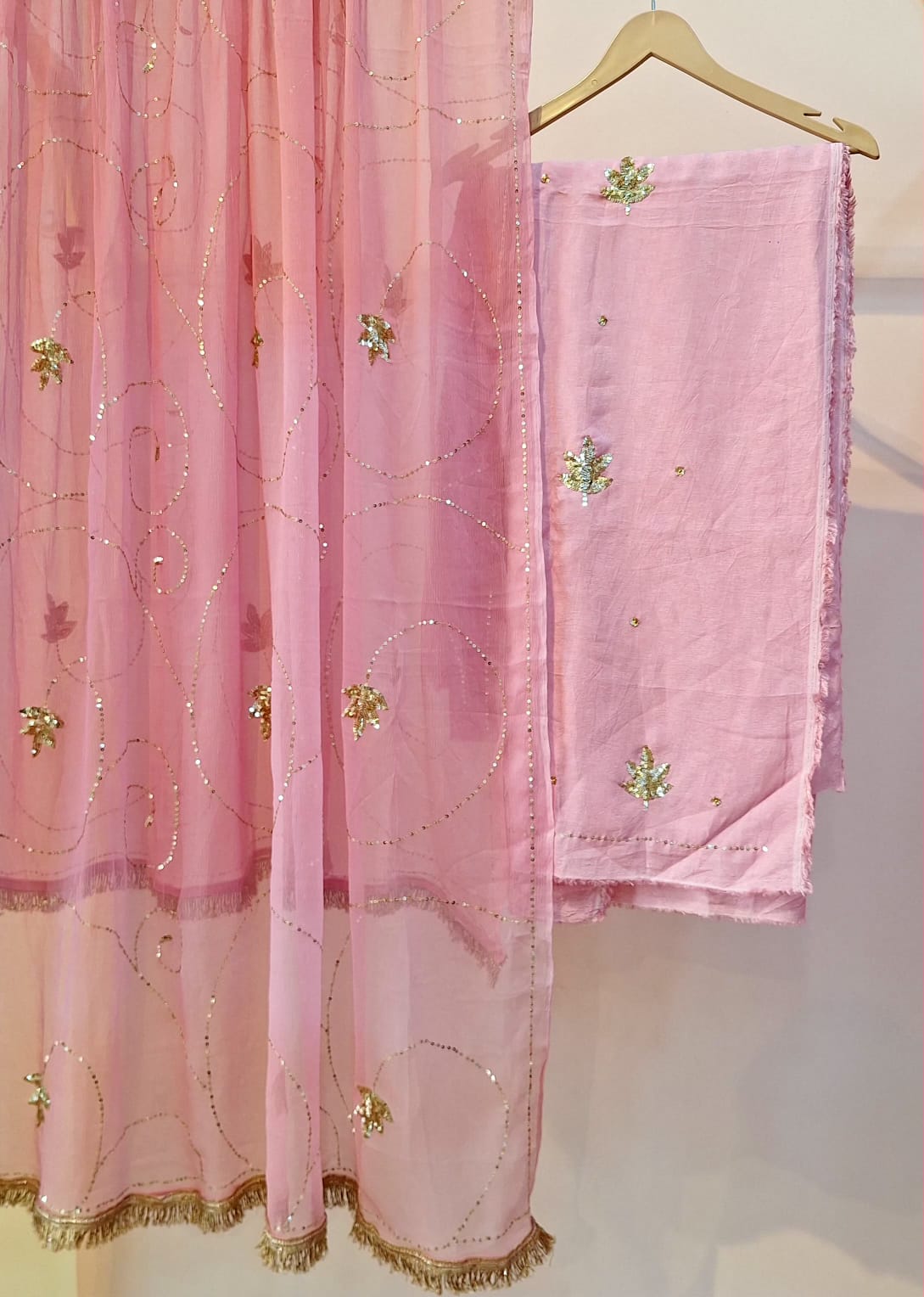 Crafted in rich Dola silk, this elegant suit set showcases exquisite Sequins handwork that adds a touch of traditional artistry and festive charm. The vibrant Light Pink kurta features finely detailed handcrafted embellishments, creating a perfect balance of sophistication and statement appeal. The set is paired with a comfortable santoon pant that offers a smooth fit and effortless wear. Completing the ensemble is a lightweight chiffon dupatta, enhancing the look with soft movement and graceful drape. Ideal for festive celebrations, weddings, and special occasions, this ensemble reflects timeless craftsmanship and refined elegance.