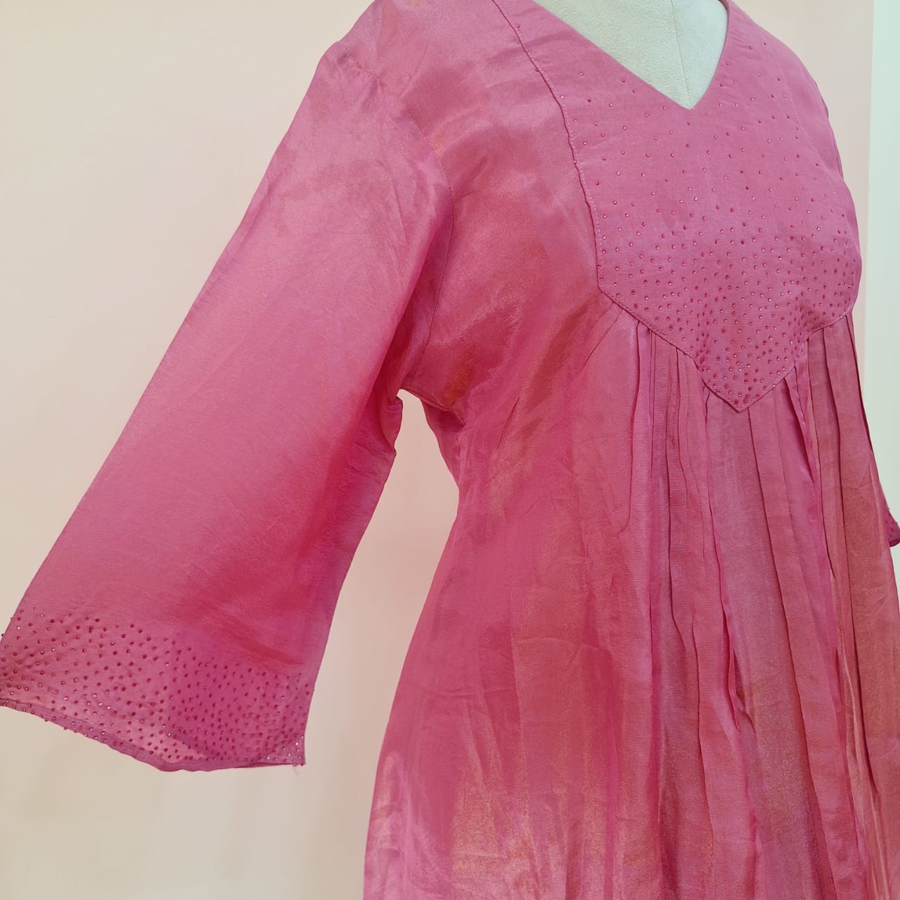 Embrace effortless festive elegance with this stunning Rose Pink Handwork Co-ord Set with tissue fabric, designed for modern women who love comfort blended with traditional craftsmanship. The soothing rose-pink shade brings soft femininity, while the delicate handwork of swarovski adds a refined designer touch.