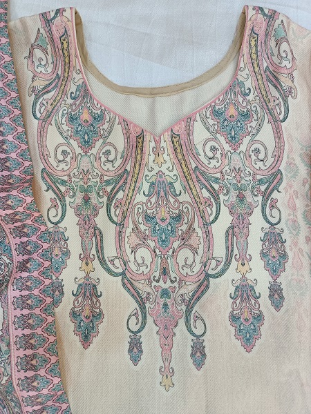 Elegant light pink woollen suit set featuring intricate Kashmiri-inspired prints. Crafted from soft, warm wool, this ensemble offers both comfort and sophistication for winter wear. Perfect for festive and casual occasions, it blends traditional charm with a cozy modern touch.