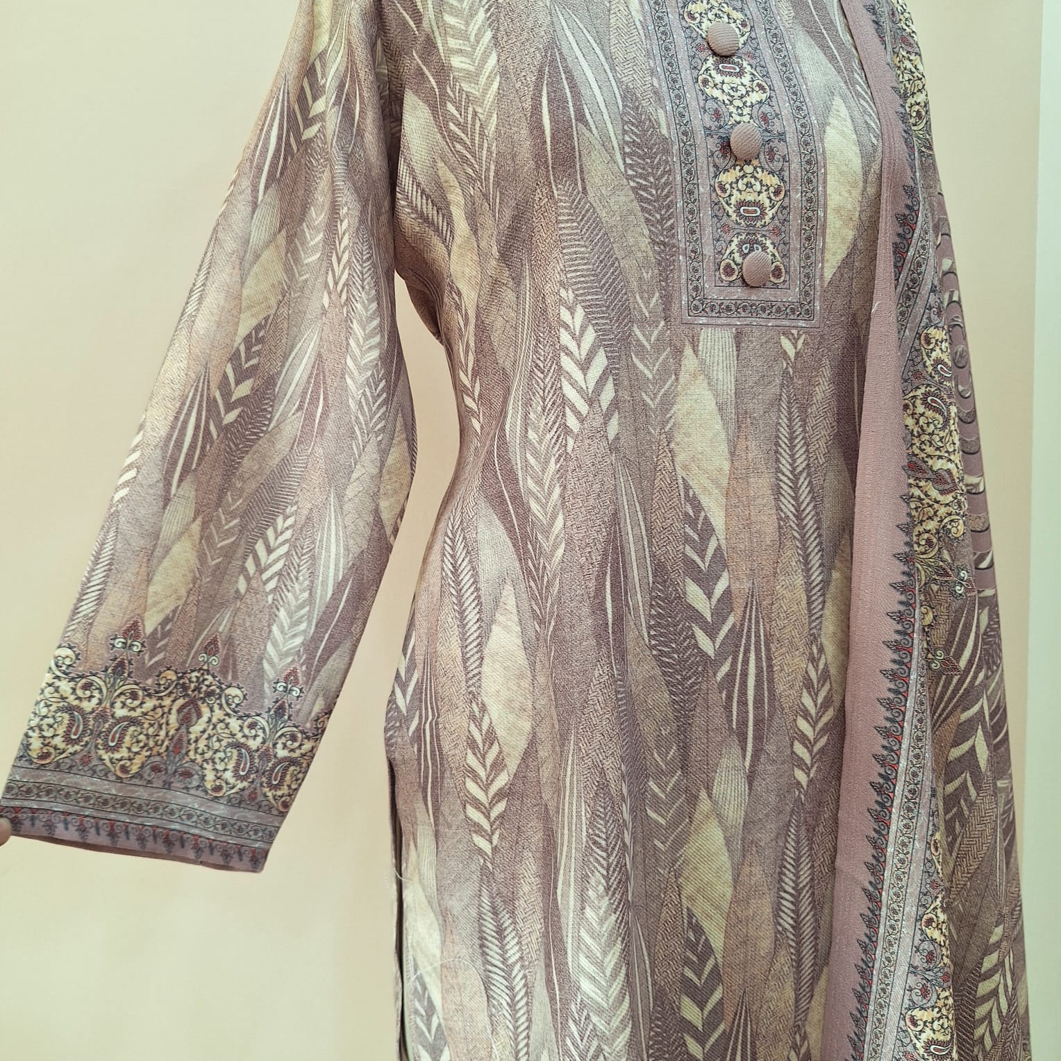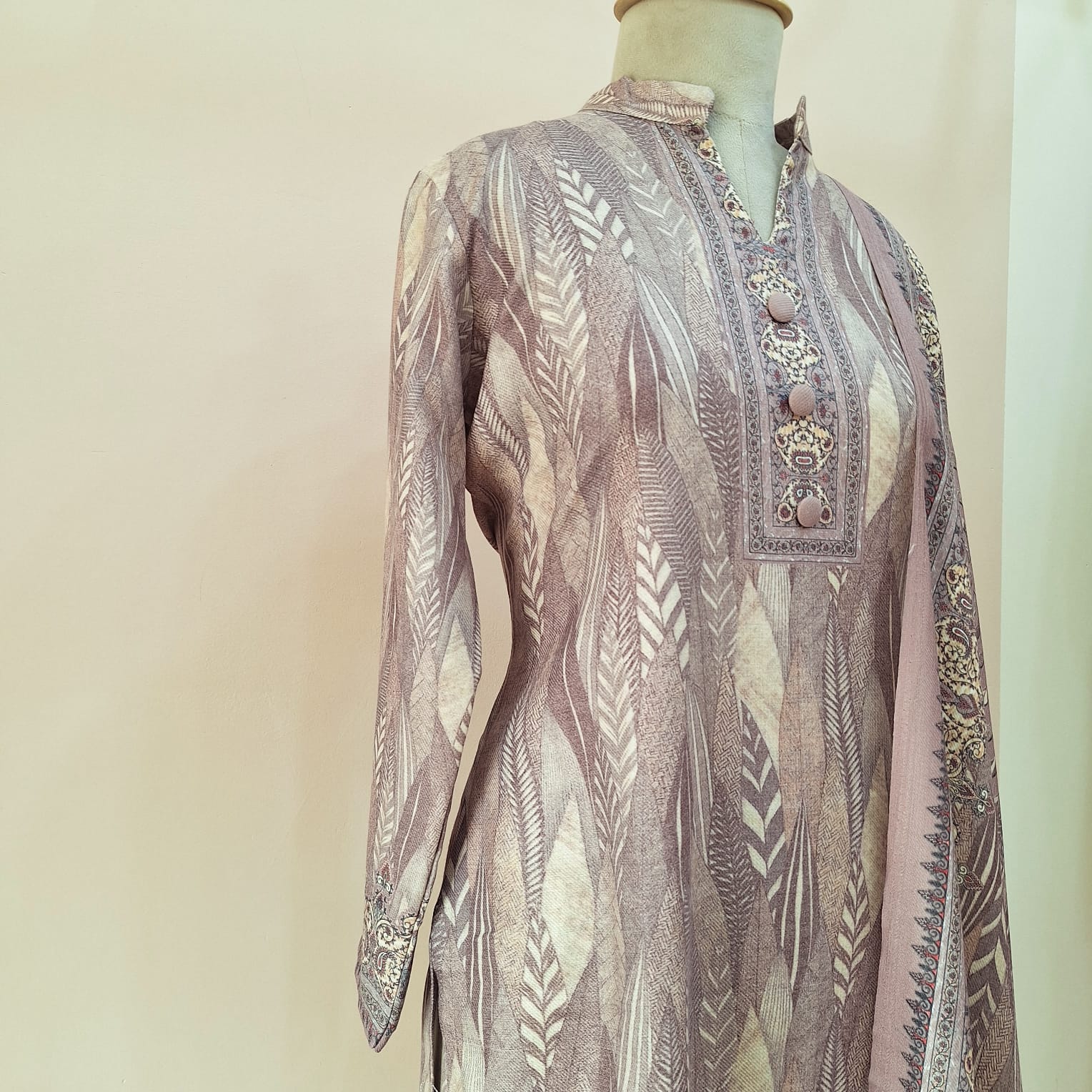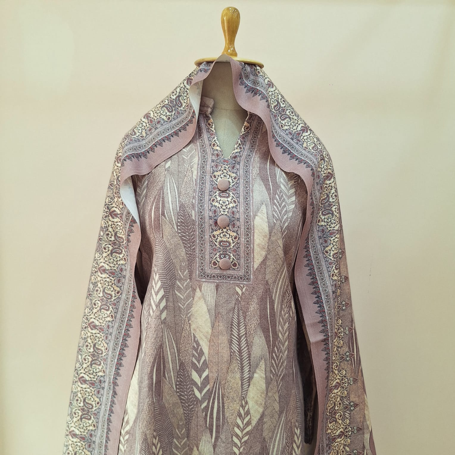 Exude winter elegance with this Light Purple Printed Kashmiri Woollen Suit Set. Crafted from soft, premium woollen fabric, it features an intricate Kashmiri print that enhances its traditional appeal. The set includes a beautifully printed kurta, matching bottoms, and a complementing dupatta — perfect for adding warmth and grace to your ethnic winter wardrobe.