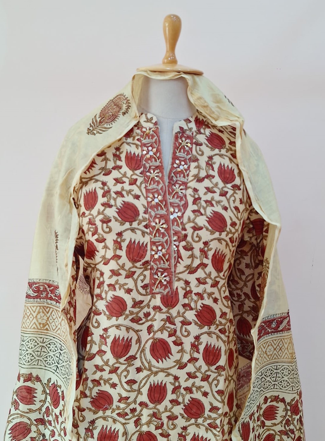 The Light Skinny Printed Chanderi Suit Set features a soft, lightweight Chanderi kurti enhanced with delicate handwork of Sequins and Pearl. It is paired with a matching pant for a comfortable and refined fit. A coordinated Chanderi dupatta with subtle handwork completes the graceful ensemble. Perfect for festive gatherings, daytime functions, and elegant ethnic wear.