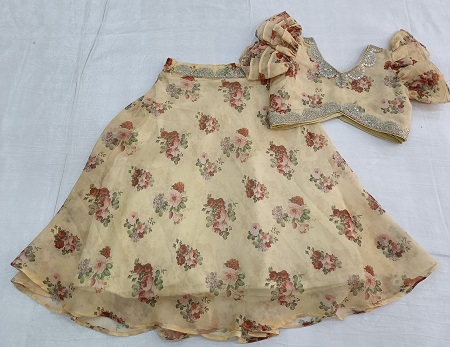 Let your little girl bloom in elegance with this charming light yellow kids set. Crafted in soft georgette, the outfit features a beautiful floral print top and flared skirt, creating a graceful and playful festive look. The stylish drape-style dupatta adds a modern touch, while the entire ensemble is finished with cutwork sequin lace, giving it a delicate sparkle and a premium traditional finish. Perfect for weddings, festive celebrations, birthdays, and family occasions — this outfit blends comfort, style, and adorable charm for your princess.