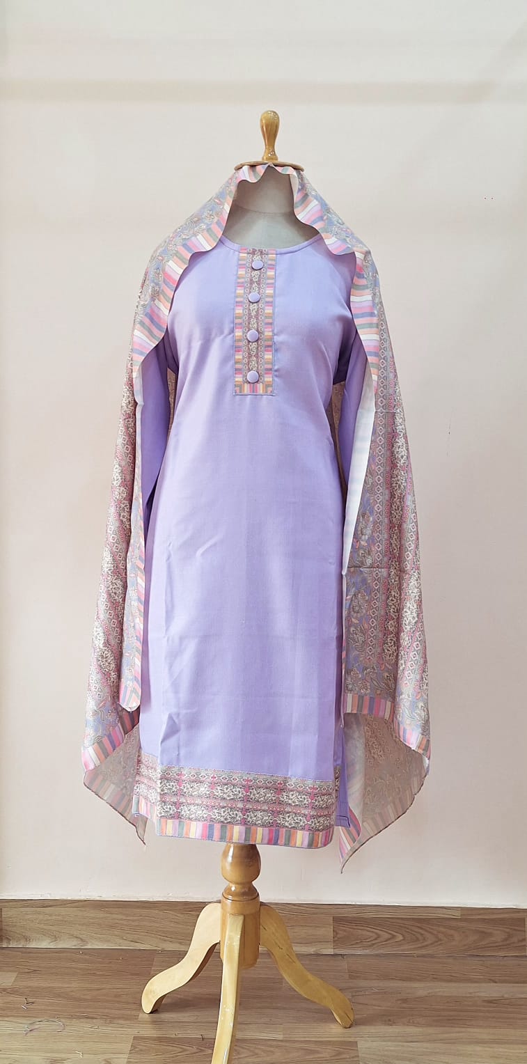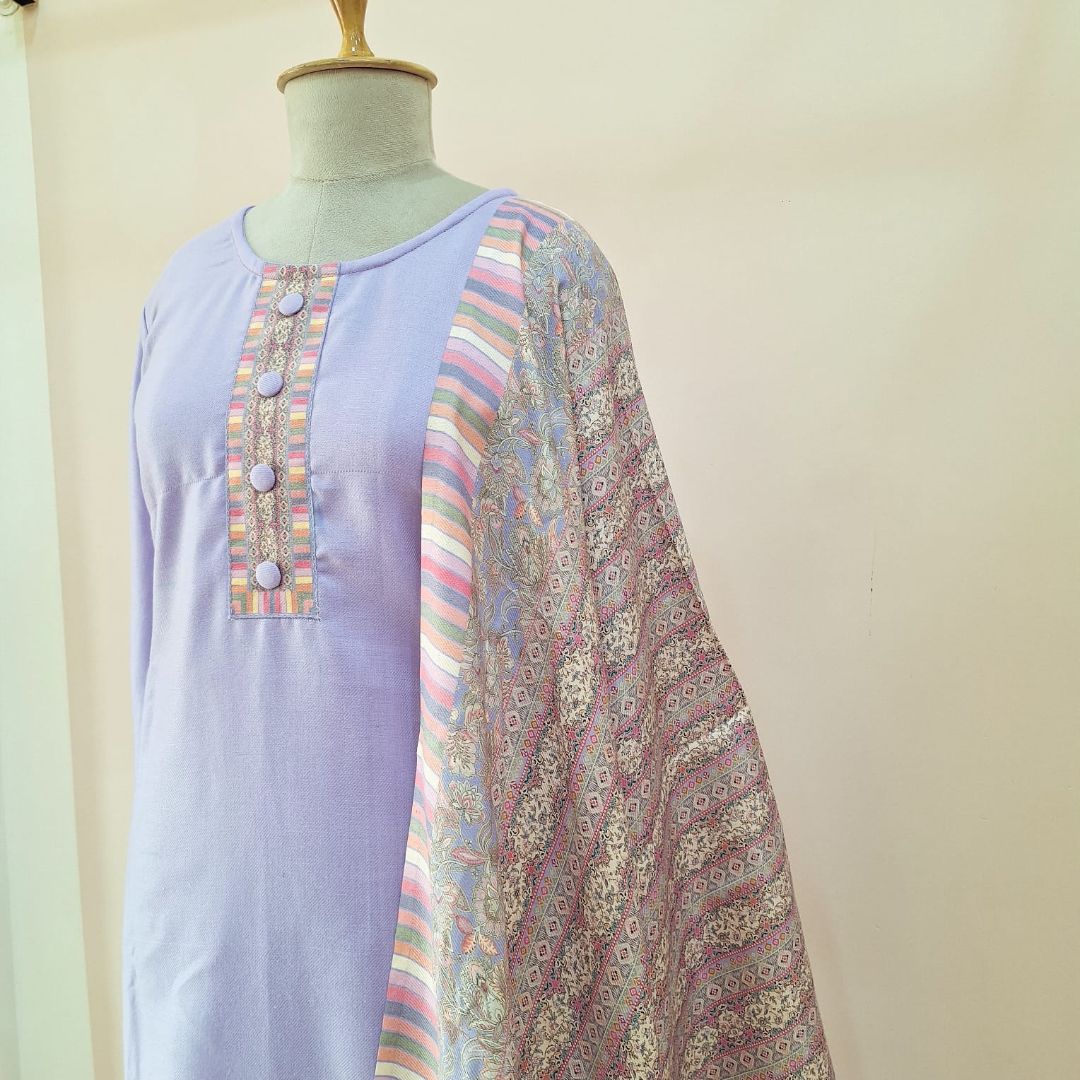 Embrace subtle sophistication with this Lilac Printed Kashmiri Woollen Suit Set. Made from premium woollen fabric, it features a graceful Kashmiri print that adds a touch of traditional elegance. The set includes a printed kurta, matching bottoms, and a coordinating dupatta — a perfect blend of warmth, comfort, and ethnic charm for the winter season.