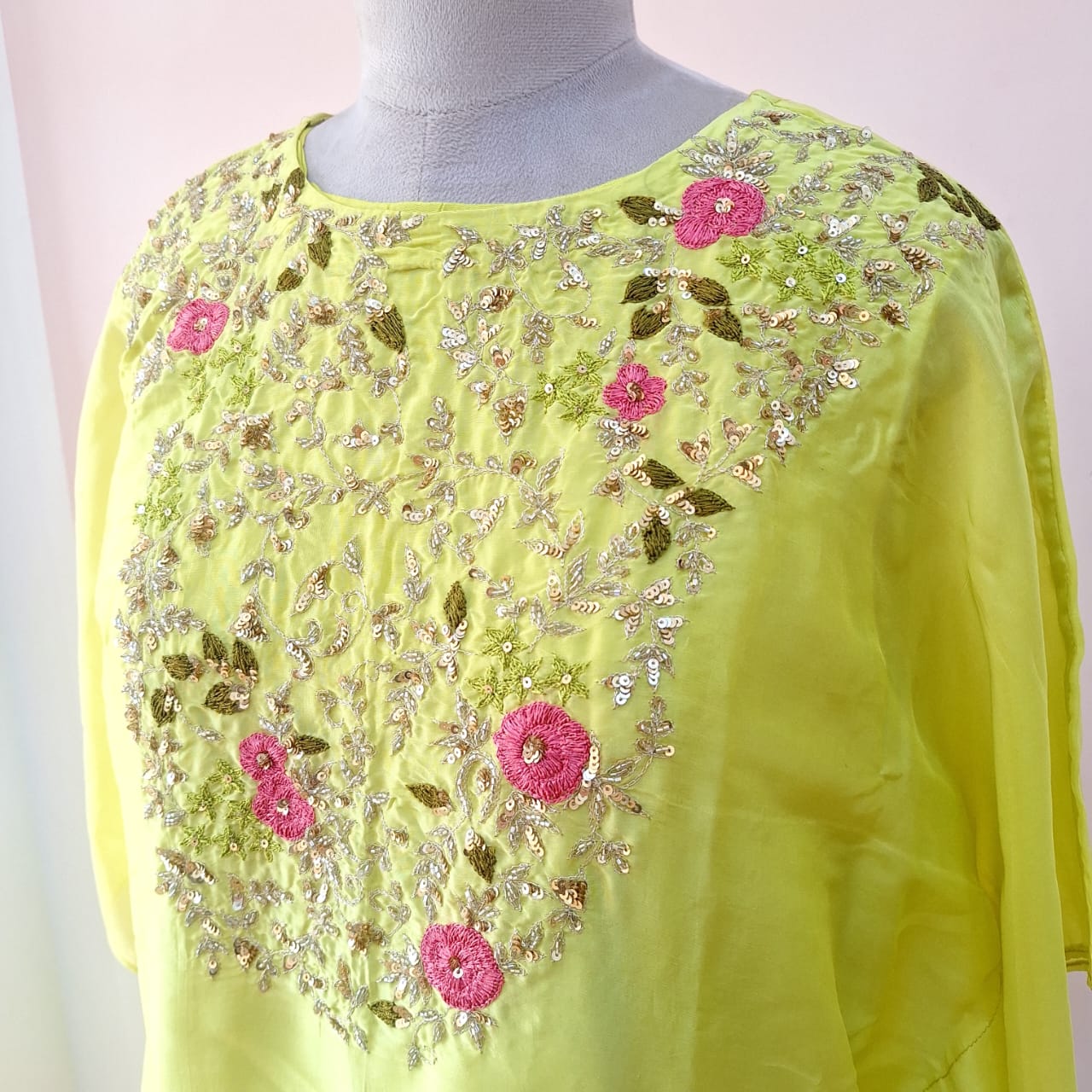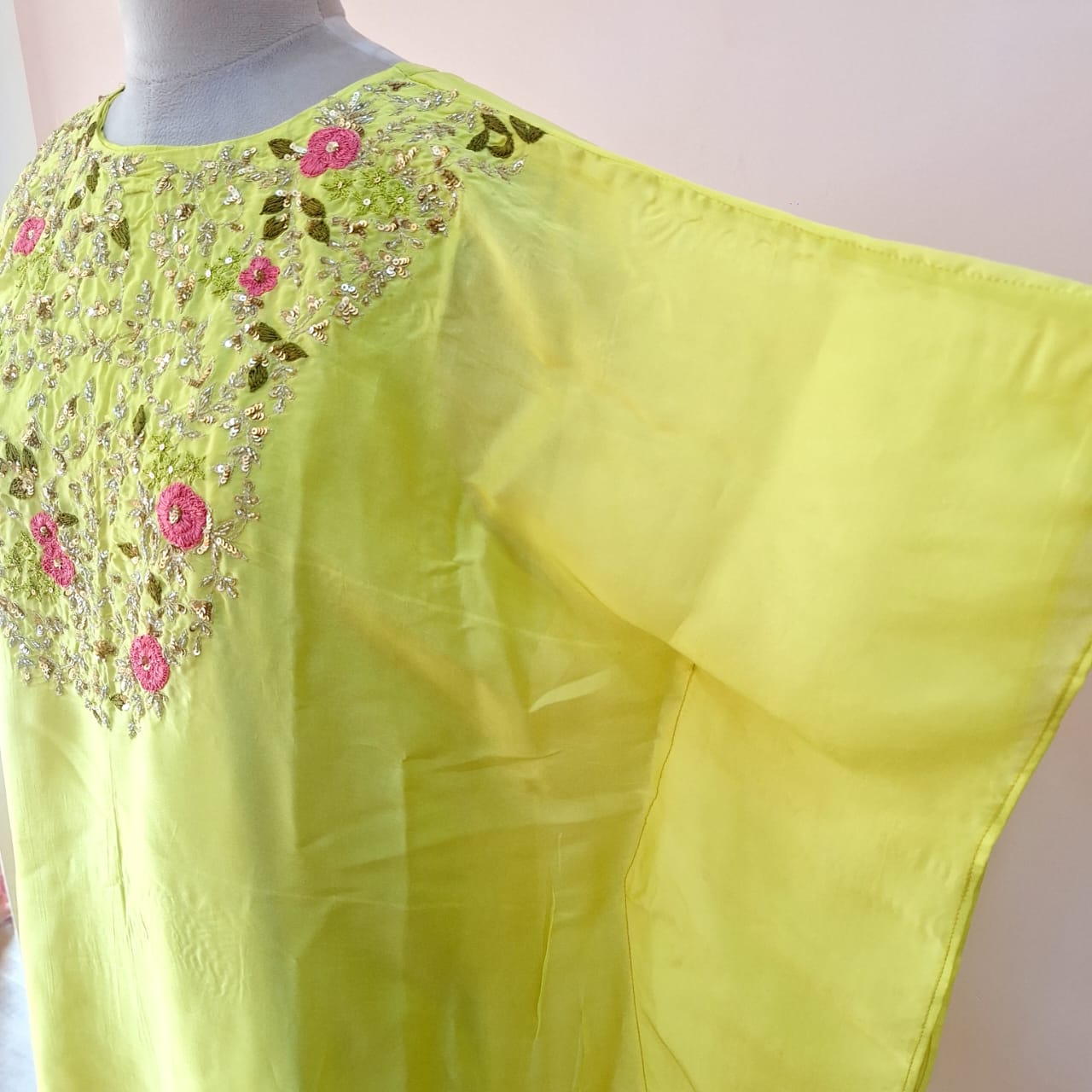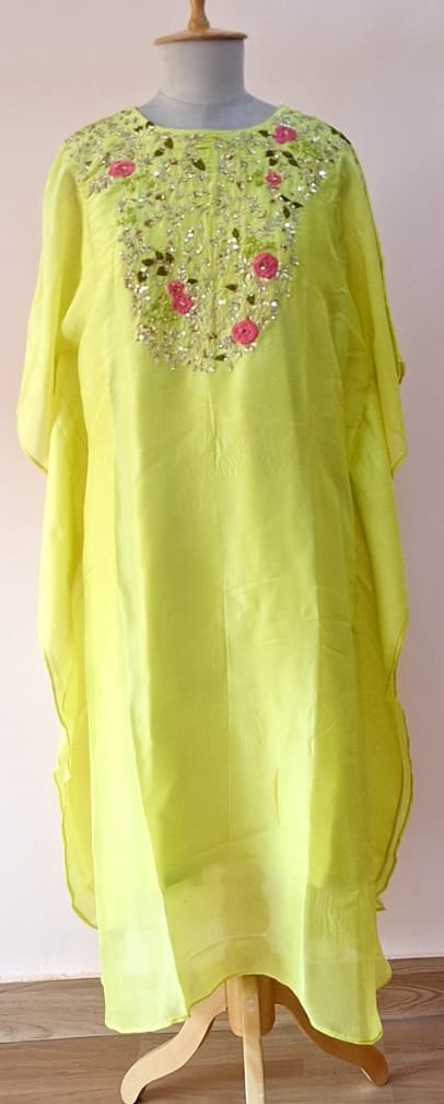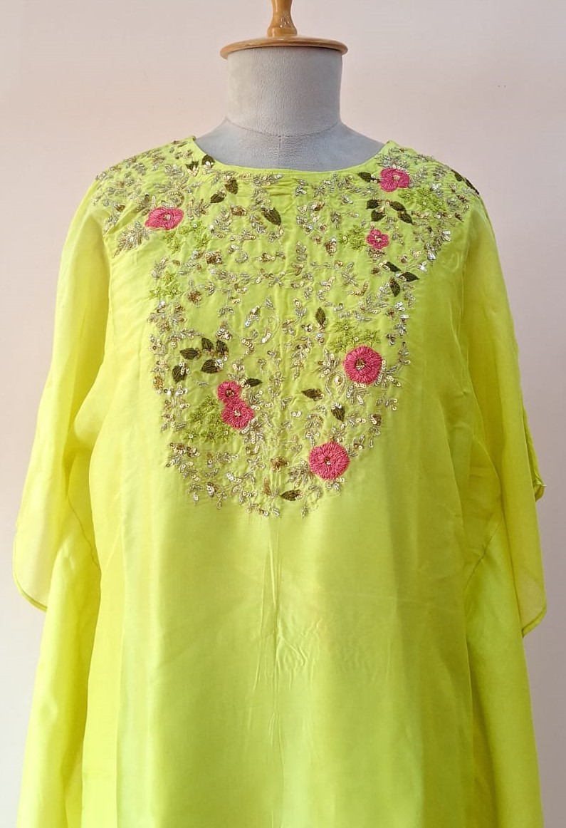 Refresh your festive wardrobe with this elegant Liril green kaftan with detachable inner wear and matching pant beautifully adorned with delicate handwork of Thread, cutdana and sequins. Designed for effortless drape and comfort, the flowing kaftan silhouette adds a touch of contemporary charm while maintaining a traditional essence. Perfect for festive celebrations, resort wear, or intimate gatherings, this set offers a graceful look with a relaxed yet luxurious feel.