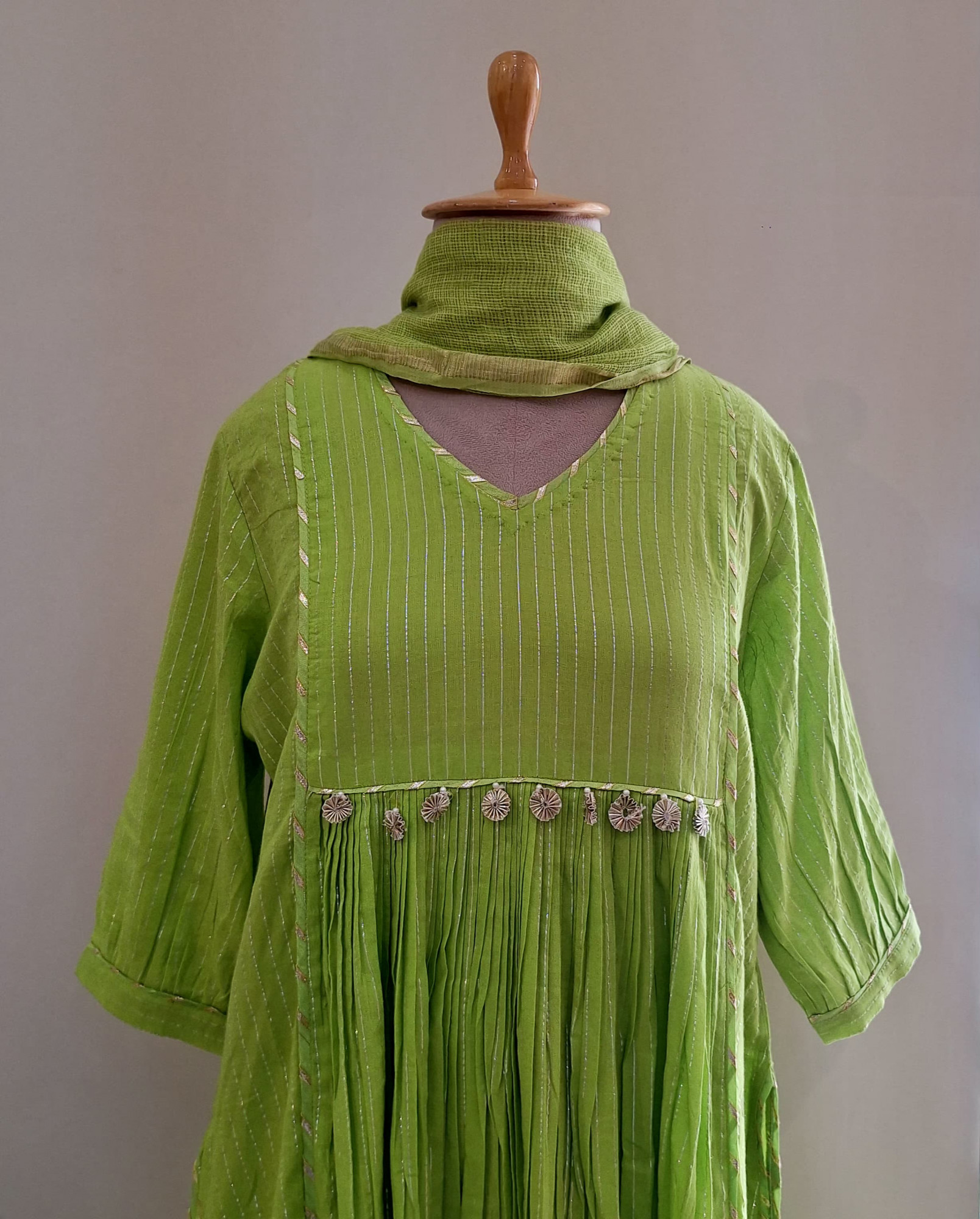 Refresh your festive wardrobe with this elegant Liril Green Lurex Kurti Pant and Dupatta Set, designed to shine with subtle glamour and modern charm.