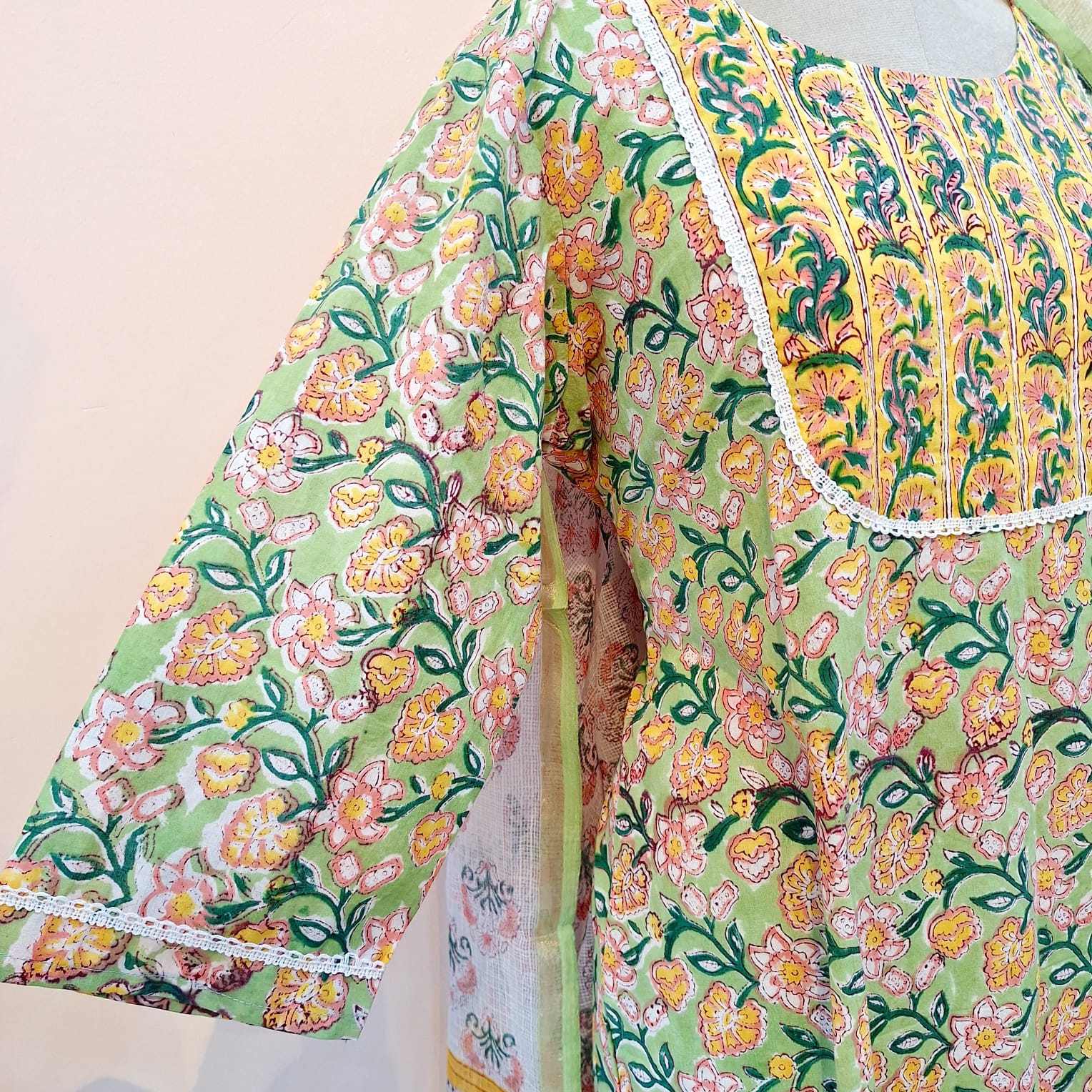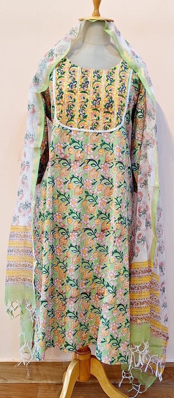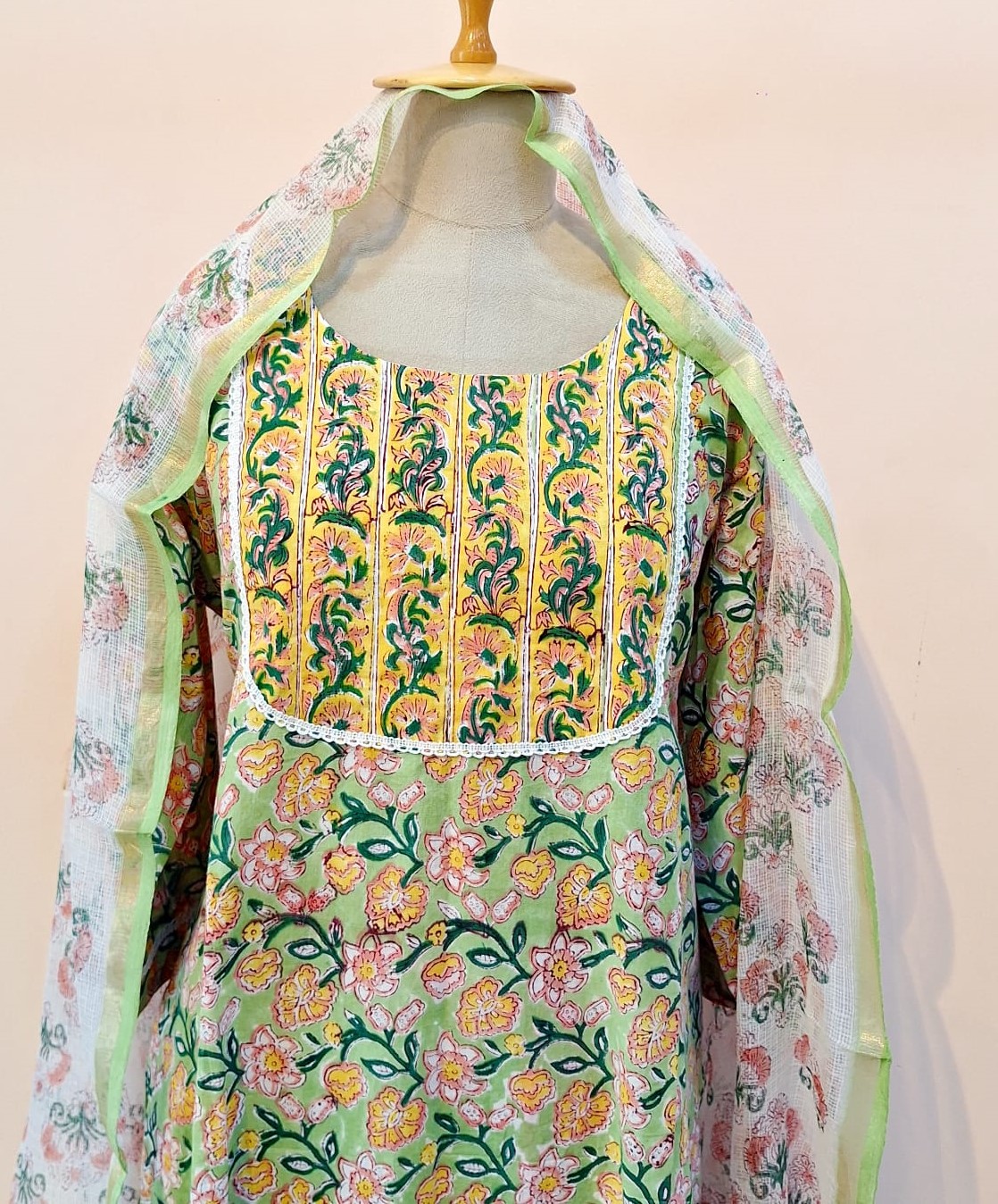 Elegant Mint Green Printed Cotton suit adorned with delicate printed detailing for a rich festive look. Paired with perfectly tailored matching pants for a sleek and graceful silhouette. Lightweight Cotton dupatta adds a soft, flowy charm with its beautifully coordinated print. Ideal for festive occasions, family functions and stylish evening wear.