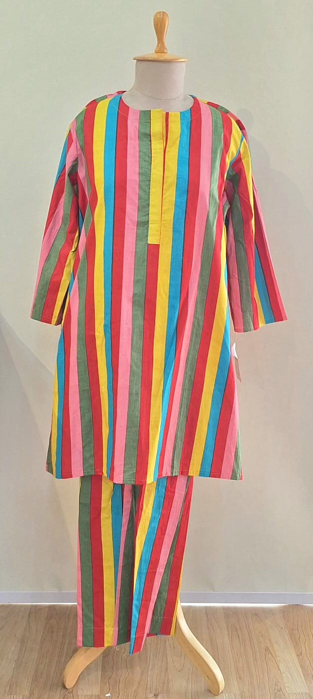 Bright, bold, and effortlessly stylish, this Multi colour Striped Cotton Co-ord Set is designed for comfort with a statement look. Crafted from soft, breathable cotton, the set features vibrant Multi colour stripes that add a fresh pop of color. The relaxed silhouette ensures all-day ease, making it perfect for casual outings, daytime events, or lounging in style. Wear it together for a coordinated look or mix and match for versatile styling.