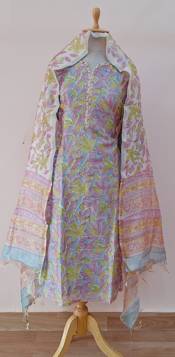 MULTI PRINTED CHANDERI HANDWORK SUIT PANT AND DUPATTA SET
