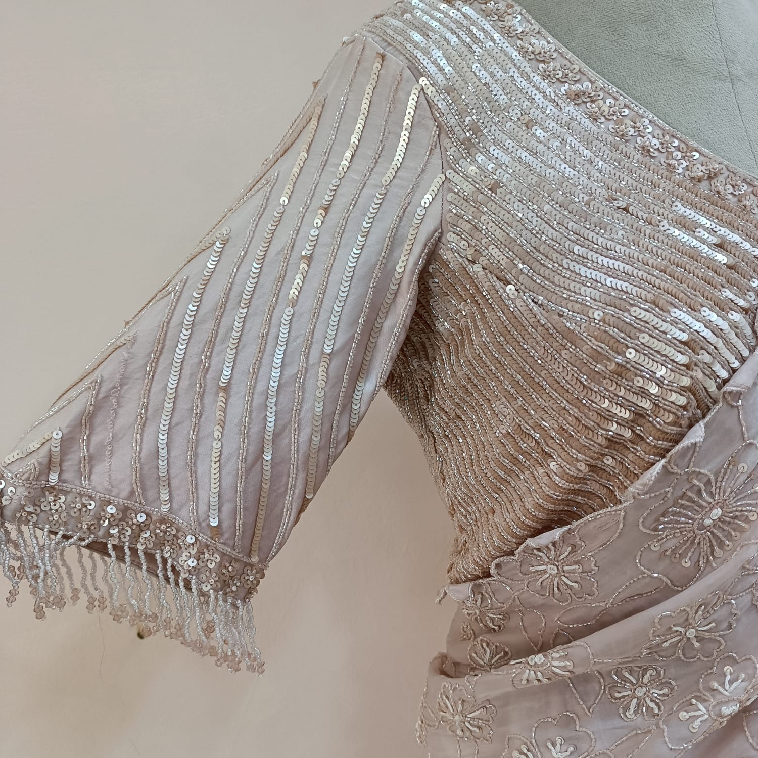 Embrace soft elegance with this breathtaking Nude Pink Handwork Lehenga and Blouse Set, paired with a beautifully finished dupatta with satin and organza fabric. The subtle nude-pink shade exudes sophistication, while intricate hand-embellished detailing of cutdana and sequins adds a luxurious festive charm—perfect for weddings and grand celebrations.