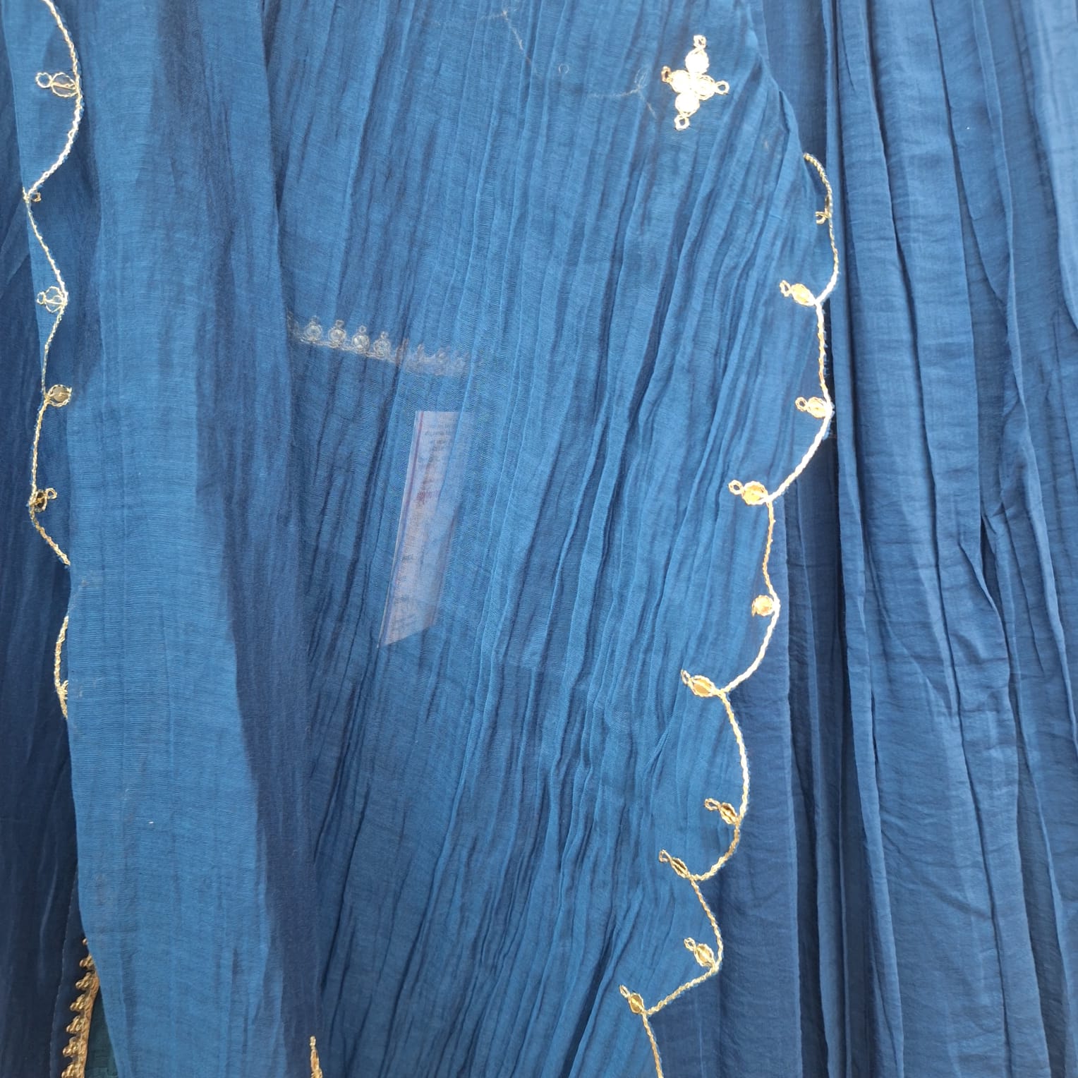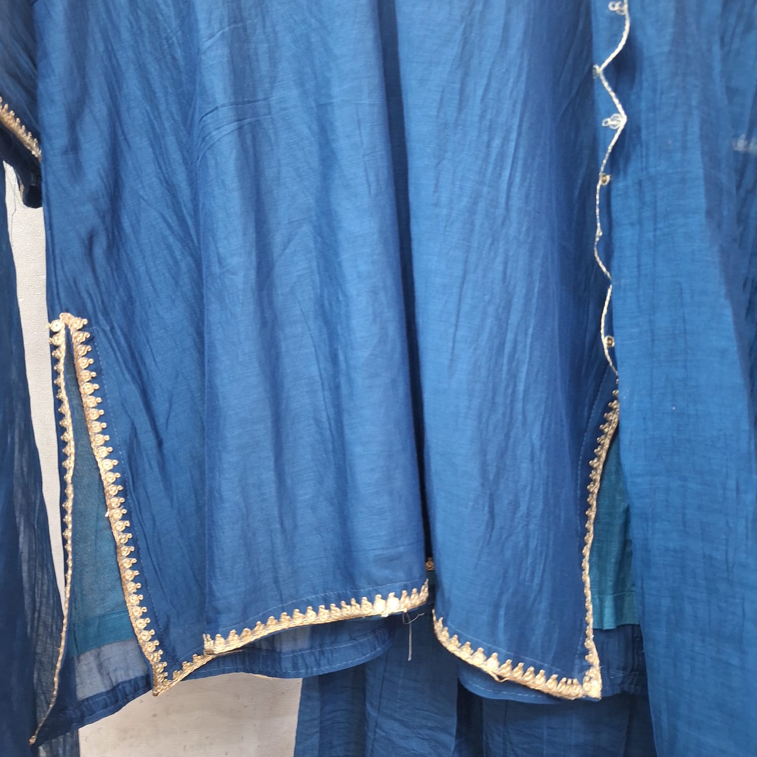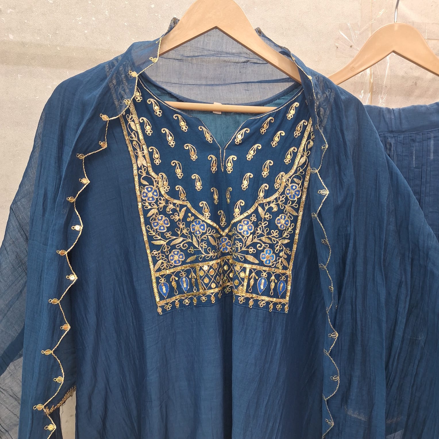 Make a striking style statement with this electric blue handwork set, featuring a chic short kurti paired with a flared skirt and matching dupatta. Crafted in premium fabric of Mul chanderi, the ensemble is adorned with intricate hand embroidery of Pitton and Sequins that adds richness and festive charm. The vibrant electric blue hue enhances its contemporary appeal, making it perfect for festive occasions, weddings, and celebratory evenings. Elegant, comfortable, and effortlessly stylish, this set is designed to stand out with grace.