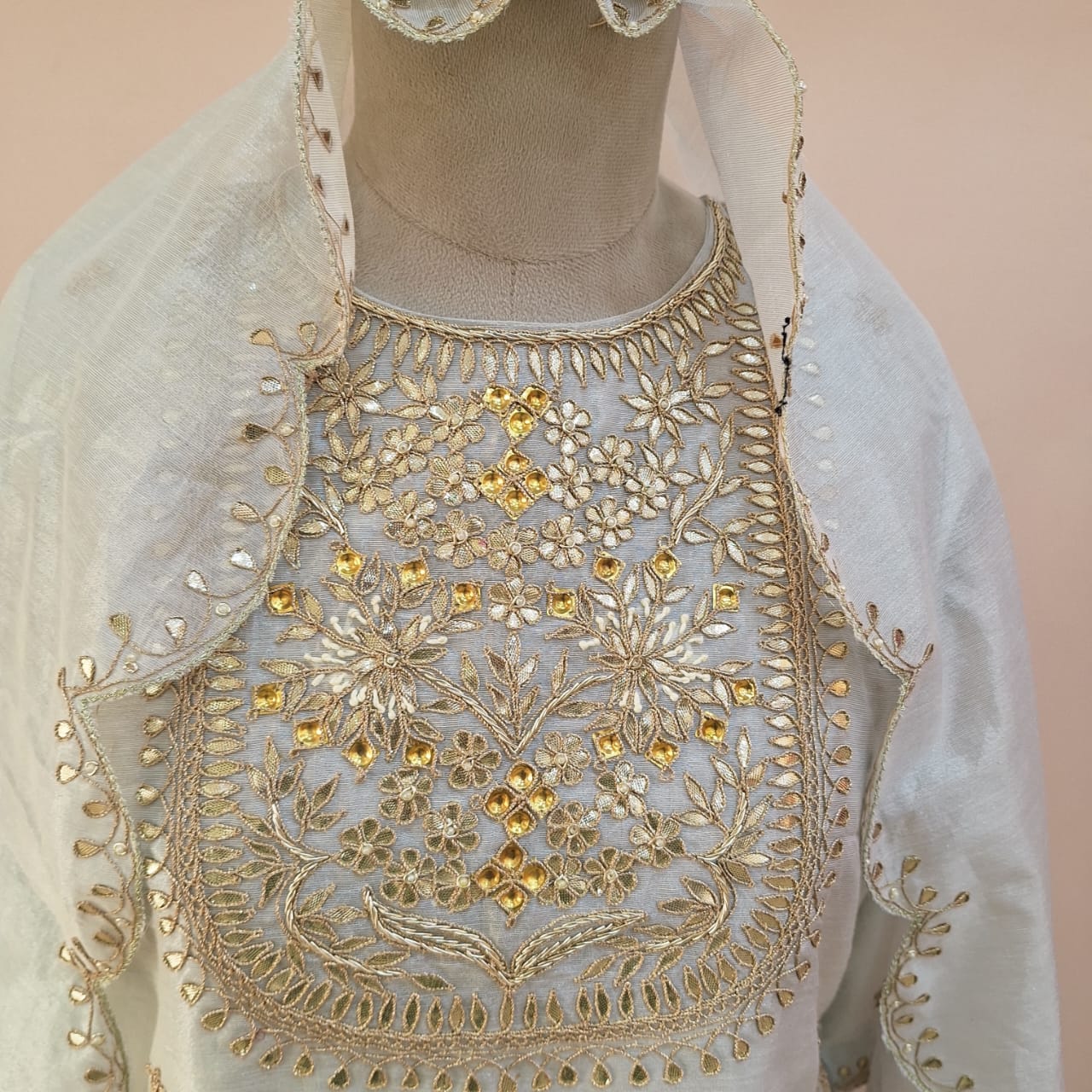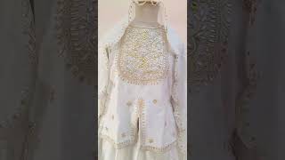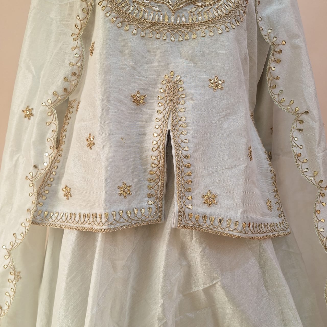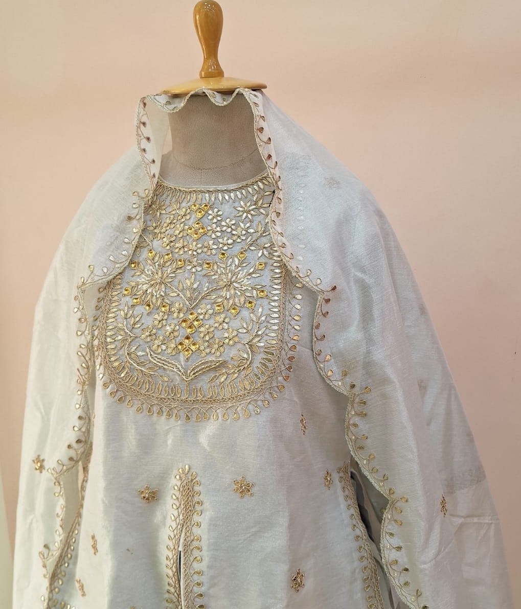 This elegant off-white ethnic ensemble features a finely crafted short kurti, paired with a graceful lehenga and a complementing dupatta, making it an ideal choice for festive occasions and celebrations. The short kurti is beautifully adorned with intricate hand embroidery of Sequins, Pearl, Marodi, and Gota Patti showcasing delicate craftsmanship through detailed threadwork and subtle embellishments. Designed for both comfort and style, it offers a flattering silhouette that enhances the overall look while maintaining ease of movement. The lehenga flows effortlessly with a soft flare, crafted from premium fabric of Chanderi Tissue and detailed with coordinated embroidery along the panels and hemline. Its elegant fall adds a traditional yet contemporary appeal to the outfit. Completing the set, the matching dupatta is lightweight and delicately finished with fine embroidery or borders, adding a refined and graceful touch to the ensemble. Perfect for festive gatherings, weddings, traditional functions, and special occasions, this off-white handwork set blends timeless elegance with modern sophistication. Style it with statement jewelry and ethnic footwear for a complete and polished look.