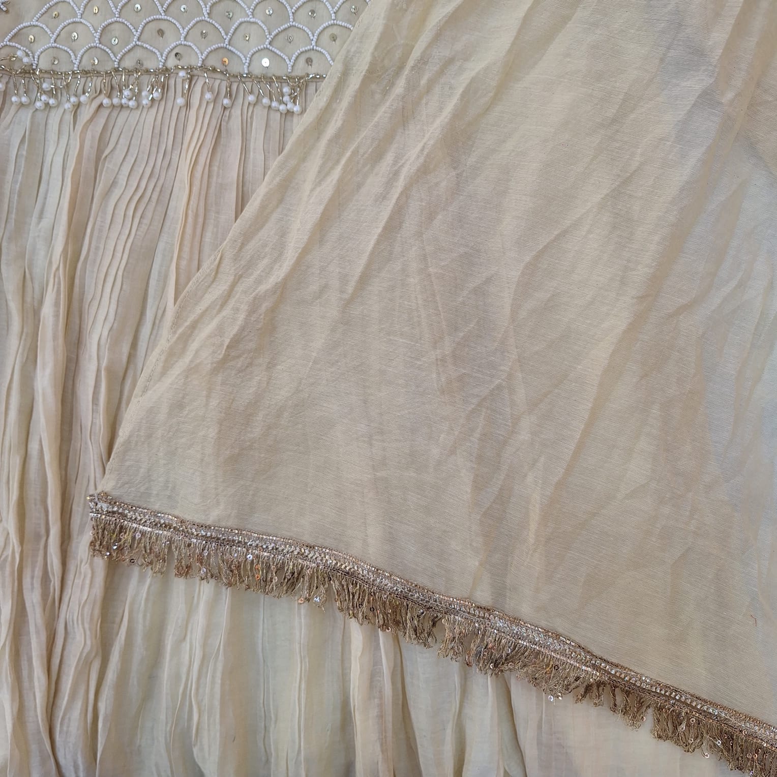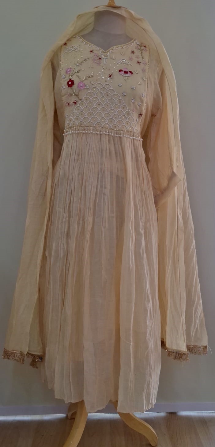 Step into elegance with this Off white Mul chanderi Suit, pant and dupatta Set, a perfect blend of tradition and grace. The Suit features a beautifully crafted handwork of sequins, pearl, thread, zardozi and cutdana adding a touch of refined sparkle and artisanal charm. Made from lightweight and breathable Mul chanderi fabric, the set drapes effortlessly, offering comfort without compromising on style. Paired with matching bottoms and a complementing dupatta, this ensemble is ideal for festive occasions, intimate gatherings, and traditional celebrations where sophistication speaks through subtle detailing.