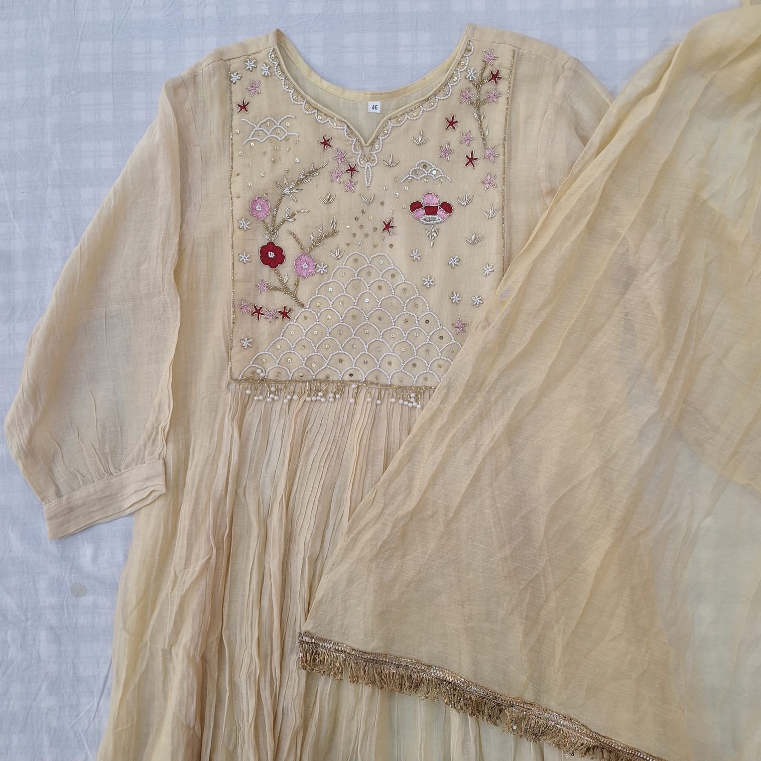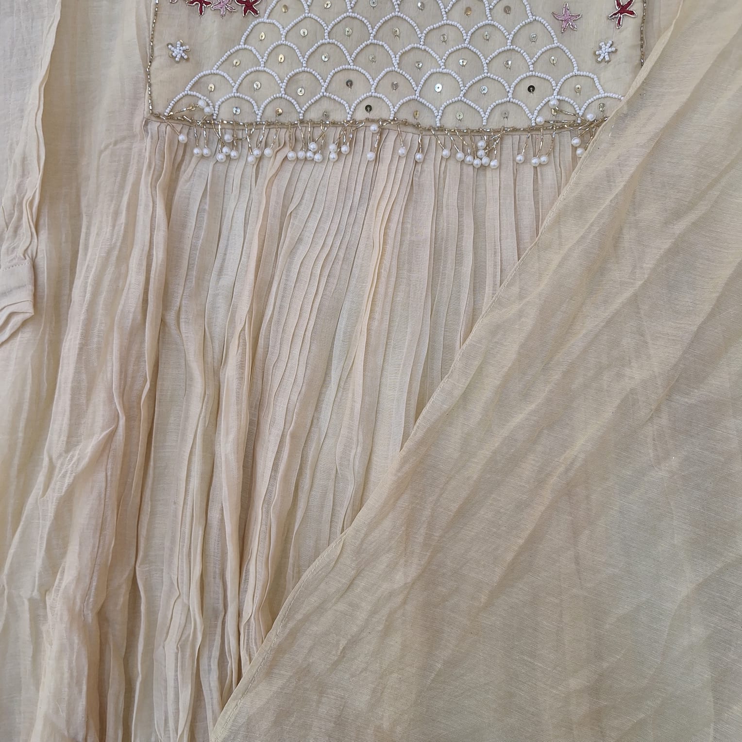 Step into elegance with this Off white Mul chanderi Suit, pant and dupatta Set, a perfect blend of tradition and grace. The Suit features a beautifully crafted handwork of sequins, pearl, thread, zardozi and cutdana adding a touch of refined sparkle and artisanal charm. Made from lightweight and breathable Mul chanderi fabric, the set drapes effortlessly, offering comfort without compromising on style. Paired with matching bottoms and a complementing dupatta, this ensemble is ideal for festive occasions, intimate gatherings, and traditional celebrations where sophistication speaks through subtle detailing.