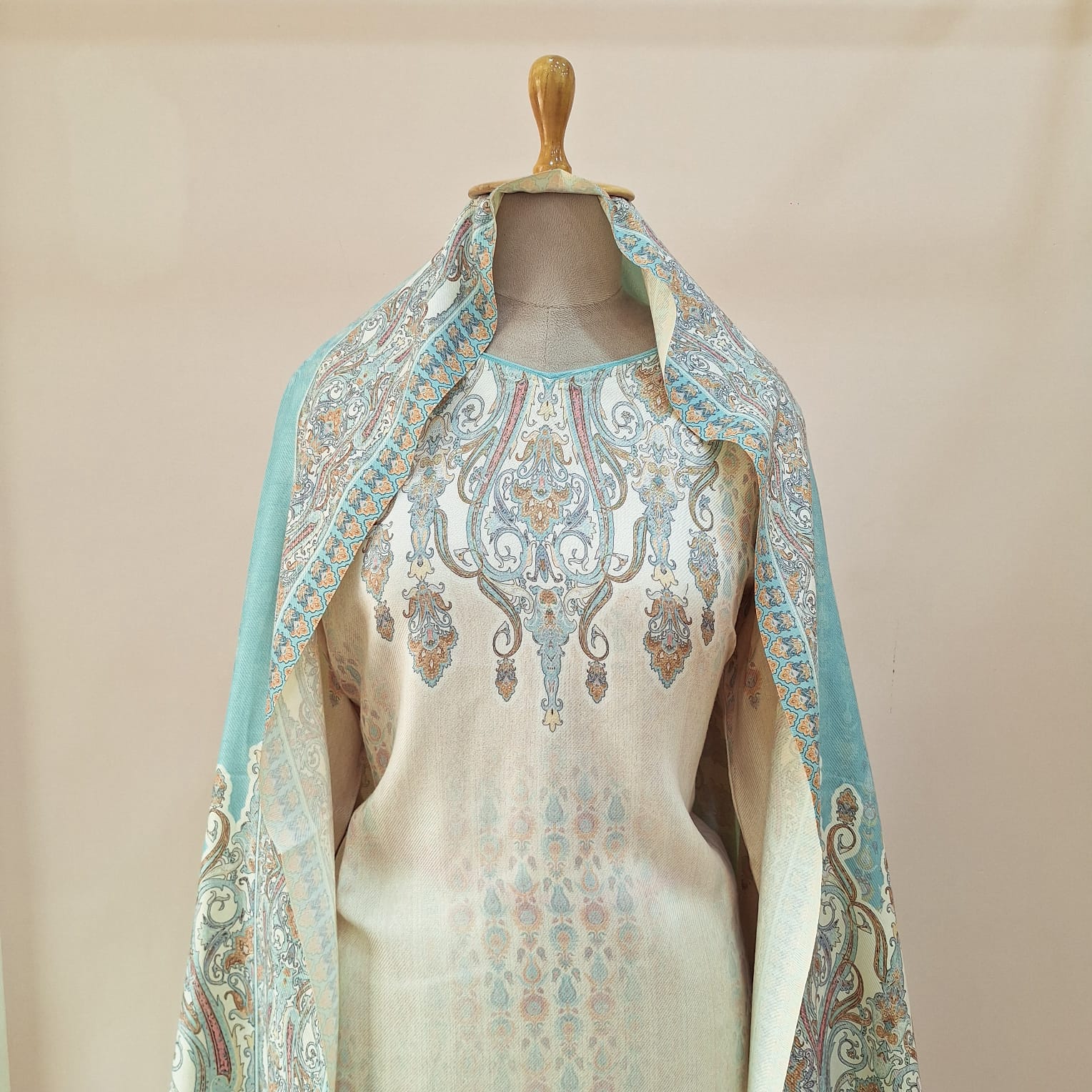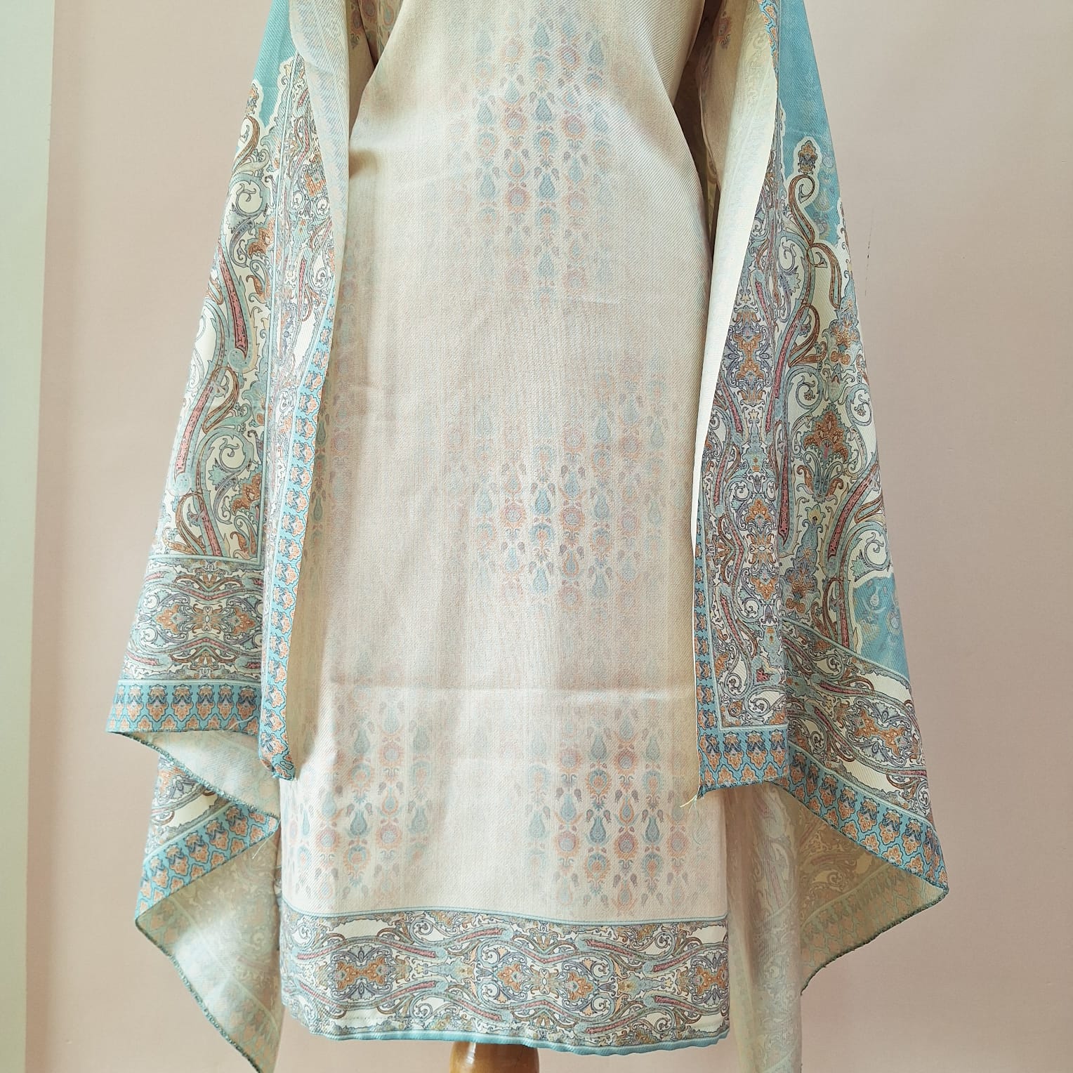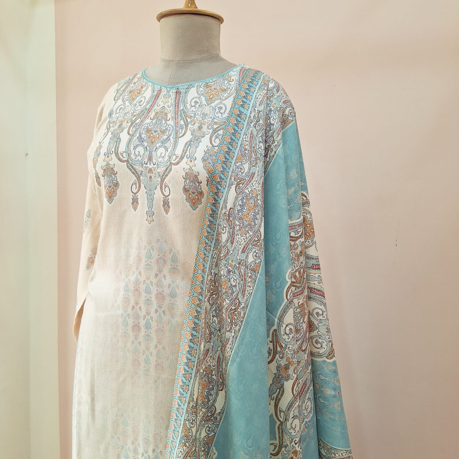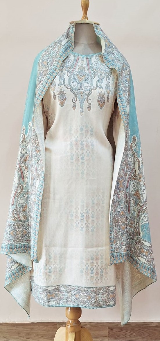 Add timeless elegance to your winter collection with this Off-White Printed Kashmiri Woollen Suit Set. Crafted from soft woollen fabric, it showcases a beautiful Kashmiri print that reflects rich traditional artistry. The set includes a printed kurta, matching bottoms, and a complementing dupatta, offering both warmth and refined ethnic style — perfect for festive gatherings or casual winter outings.