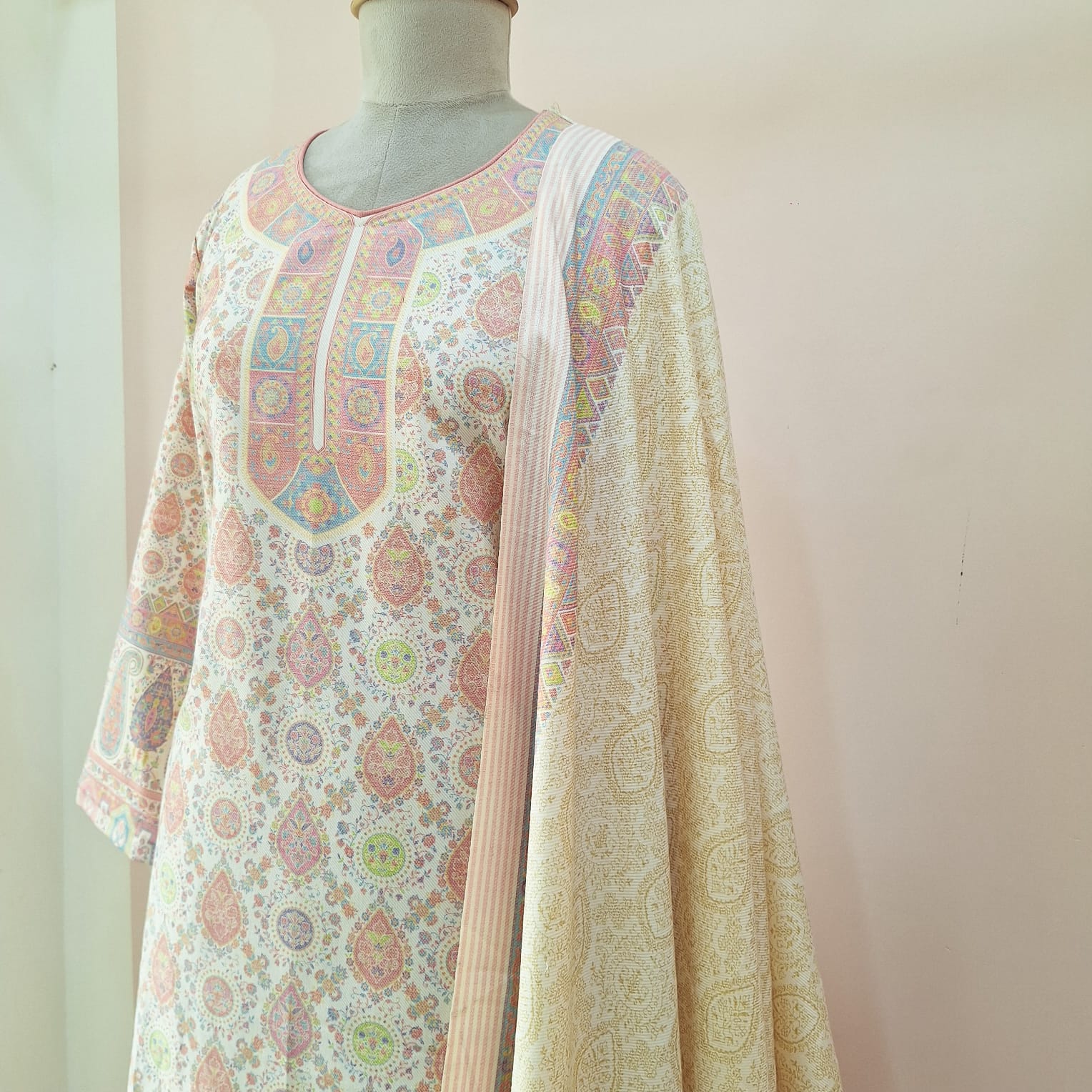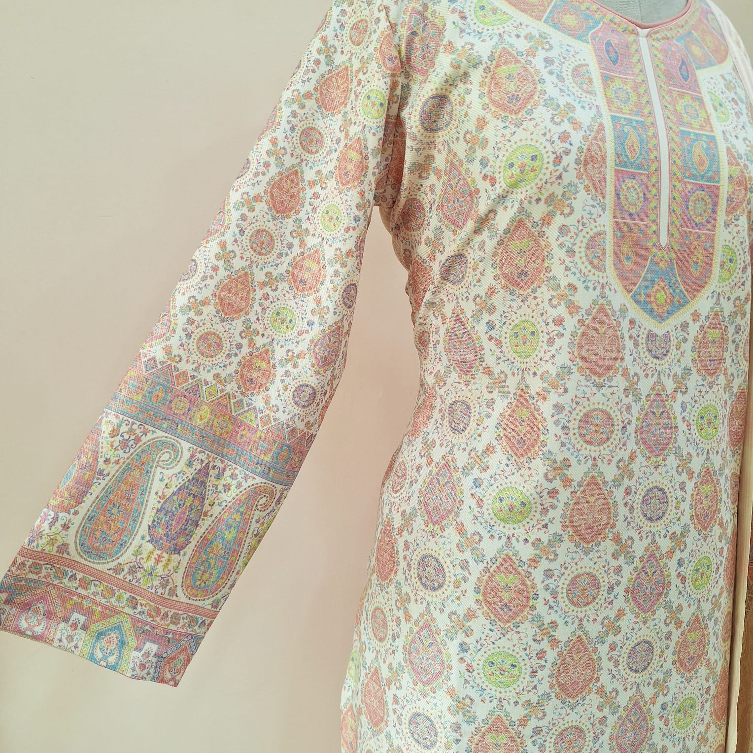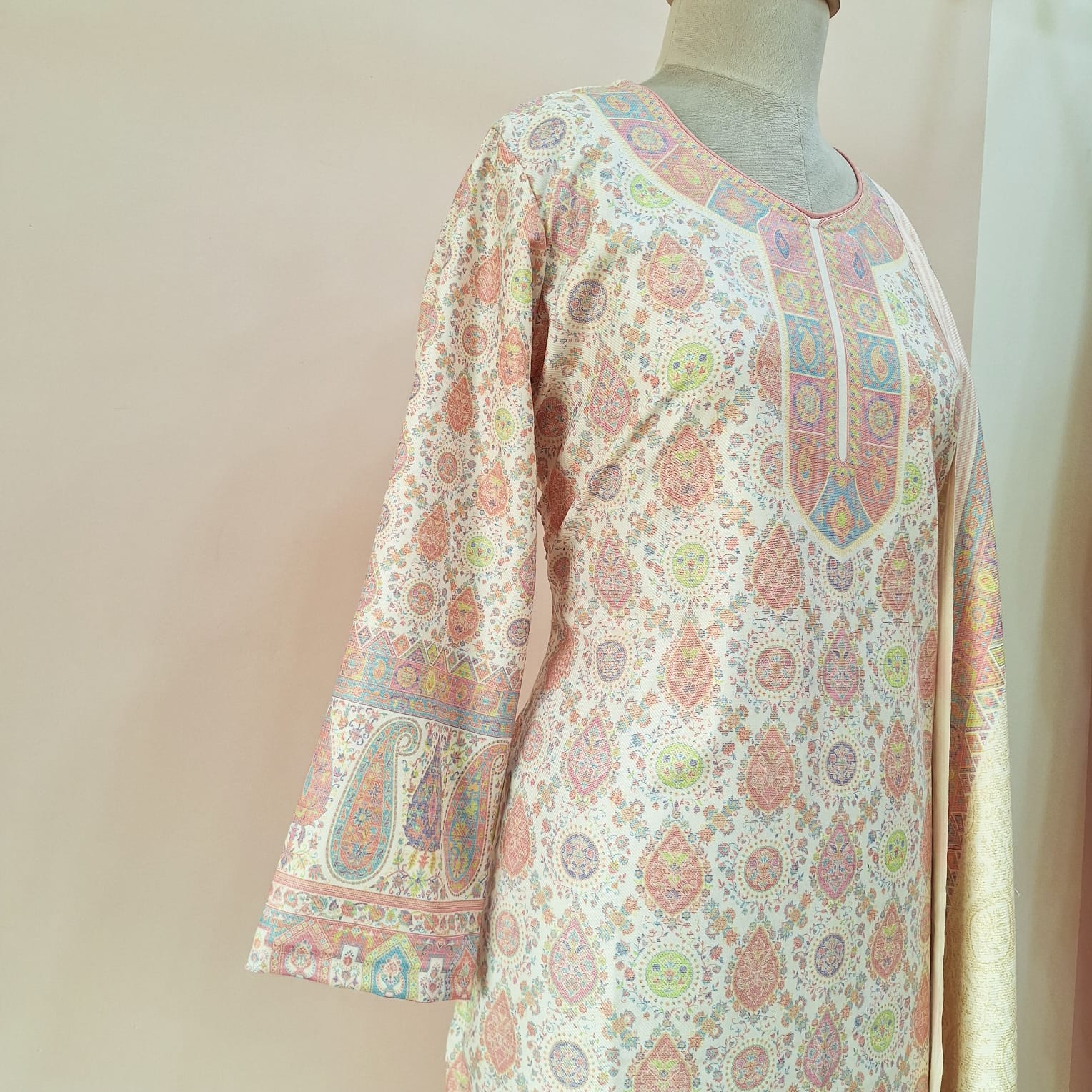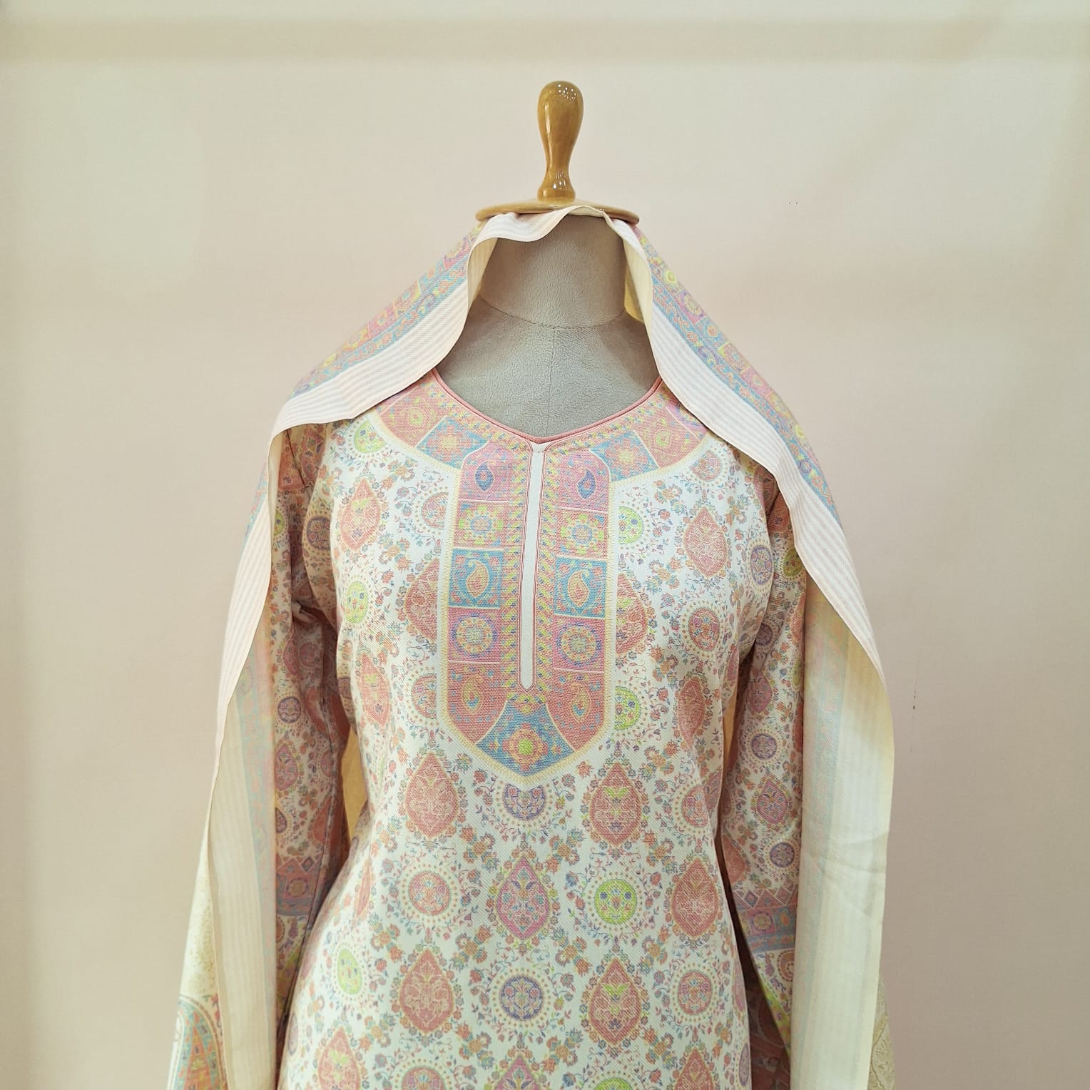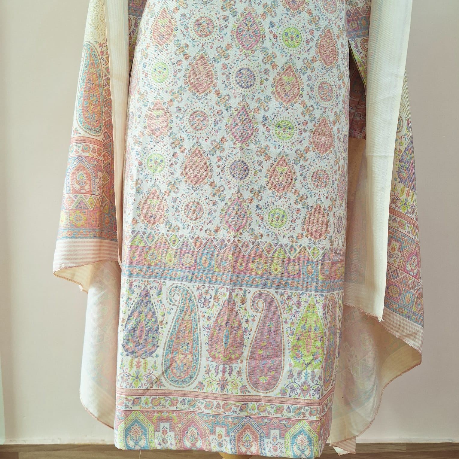 Elevate your winter elegance with this Offwhite Printed (Kashmiri Print) Woollen Suit Set. Crafted from soft and warm wool fabric, this set features exquisite Kashmiri-inspired prints that bring timeless charm to your ethnic collection. The soothing offwhite base enhances the intricate motifs, making it perfect for daytime gatherings or festive occasions.